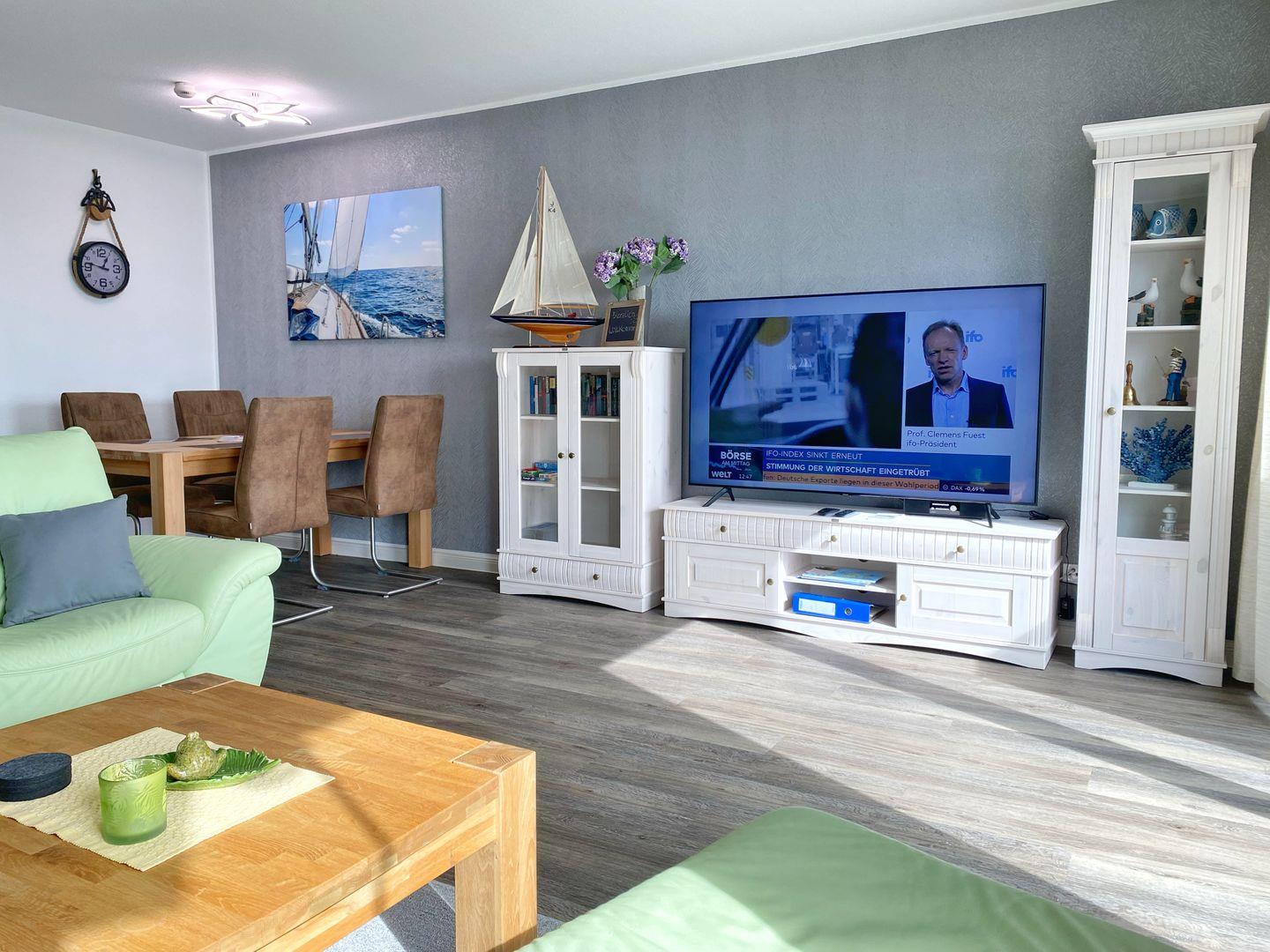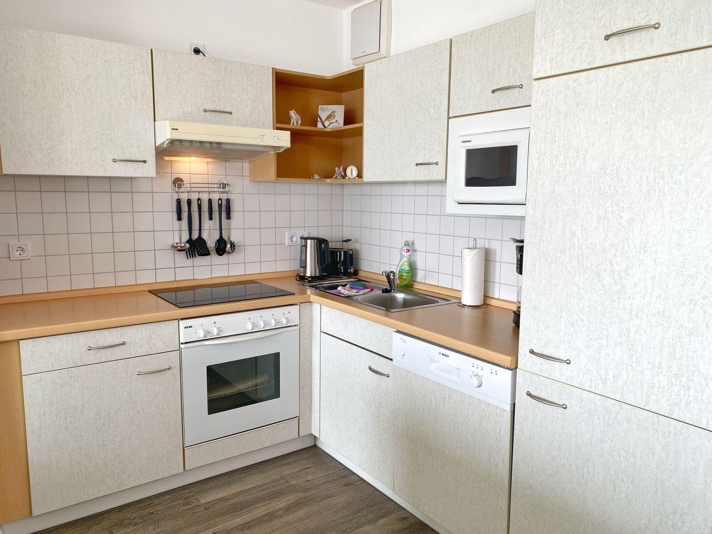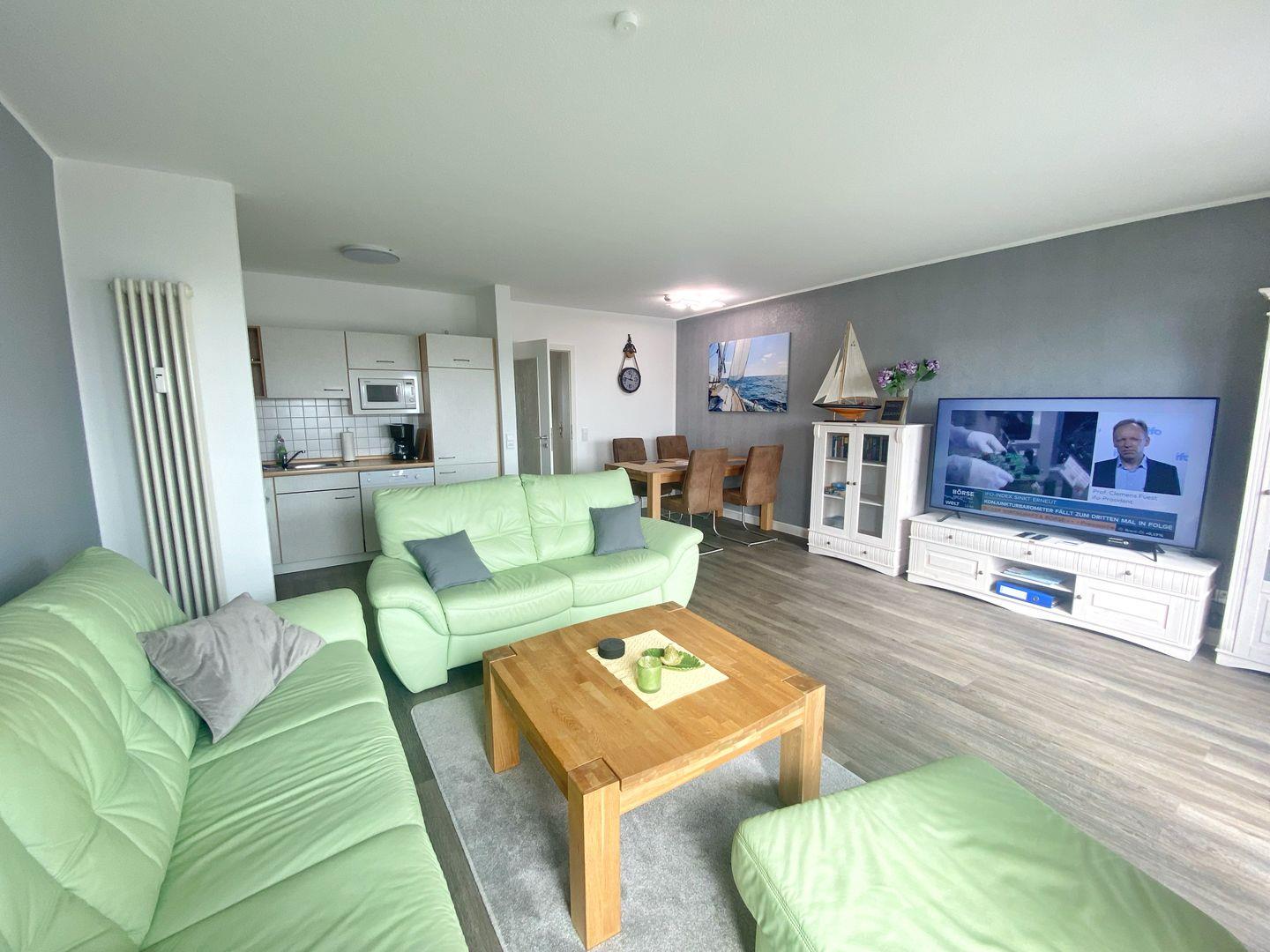 Der helle Wohnbereich ist mit Laminatboden, Sofaecke und Essplatz gestaltet und lädt nach einem Tag am Wasser zum Abschalten ein. Für Unterhaltung und Komfort stehen Ihnen WLAN, zwei TVs (über 55 Zoll) sowie ein Radio zur Verfügung. Sichtschutz an allen Fenstern sorgt dabei jederzeit für Privatsphäre. Die offene Küche ist direkt an das Wohnzimmer angebunden und vollständig ausgestattet – mit Cerankochfeld, Backofen, Mikrowelle, Spülmaschine, Kühlschrank mit Gefrierfach, Kaffeemaschine, Wasserkocher, Toaster sowie reichlich Küchenutensilien, Geschirr und Besteck. Auch an praktische Details wie Geschirrhandtücher und Abfalleimer ist gedacht.