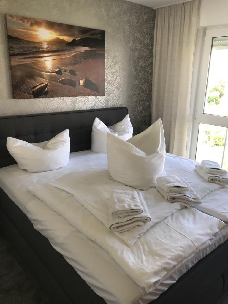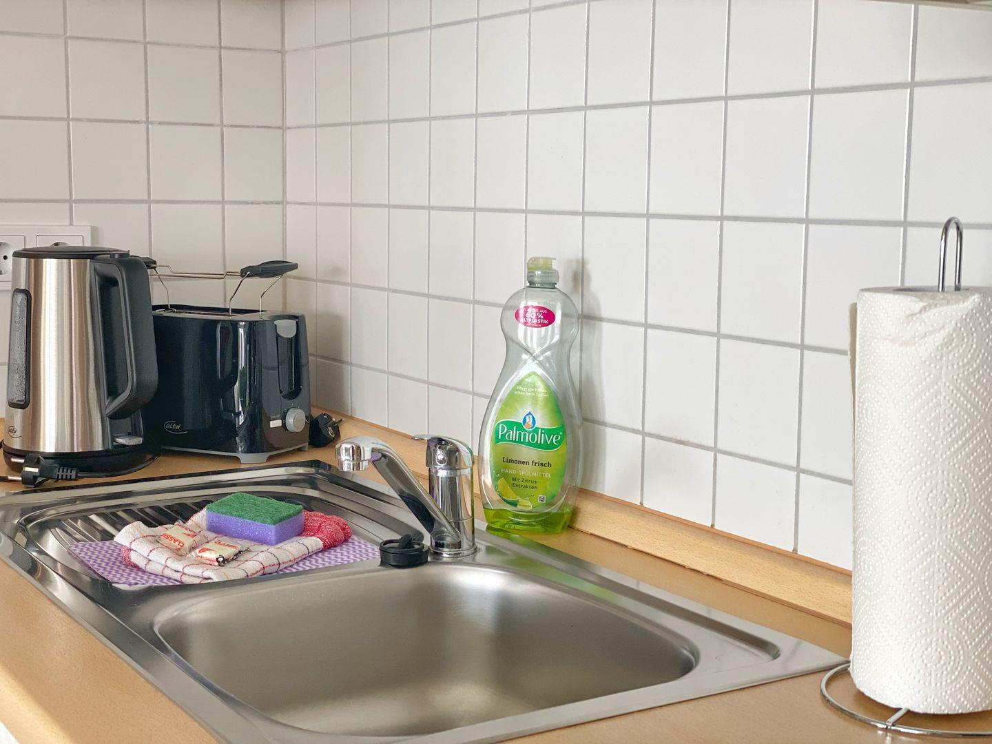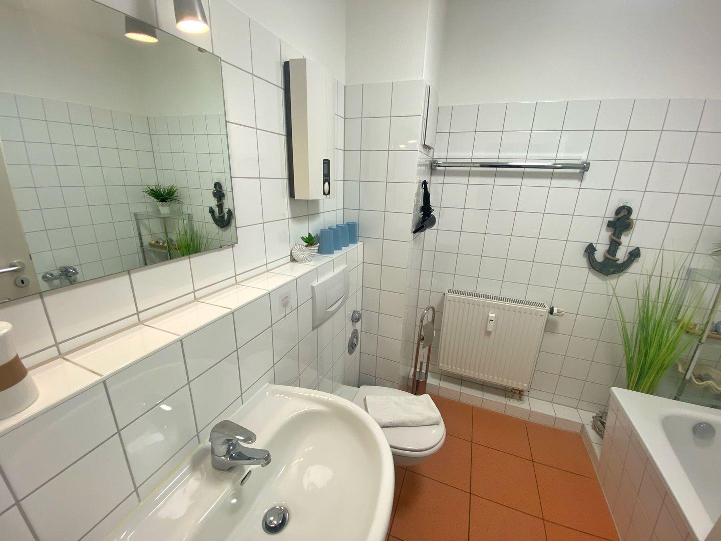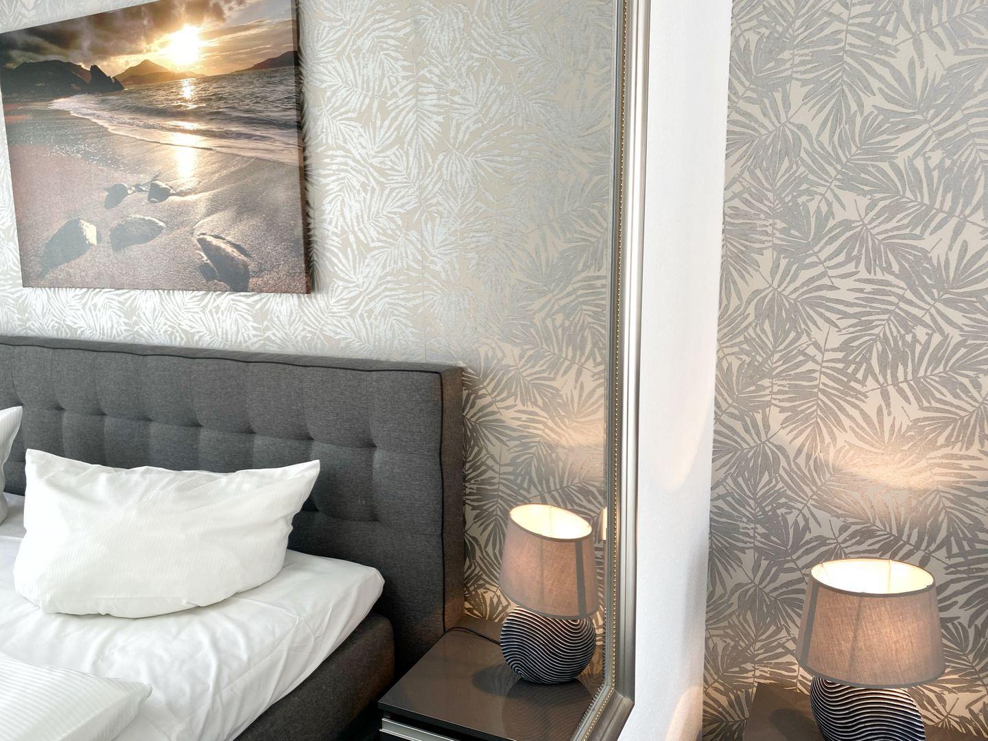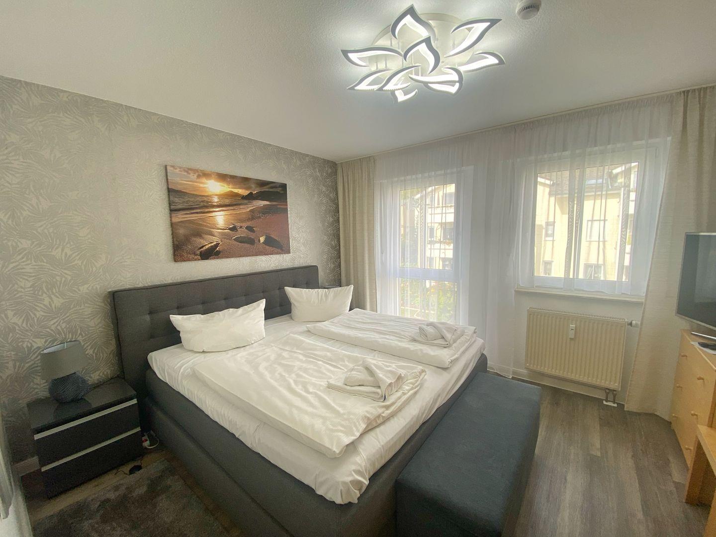 Das separate Schlafzimmer ist ebenfalls mit Laminatboden eingerichtet; zusätzlich stehen Kommode und Garderobe bereit, damit Sie alles bequem verstauen können. Im Badezimmer finden Sie sowohl Dusche als auch Badewanne (Dusche in der Wanne), WC, Waschbecken, Spiegel, warmes Wasser und einen Haartrockner – perfekt für entspannte Morgen oder ein Bad am Abend. Bettwäsche und Handtücher sind vorhanden, ebenso eine Erstausstattung und ein Wäscheservice. Waschmaschine und Trockner können gemeinschaftlich genutzt werden ( kostenpflichtig - Münzautomaten ).