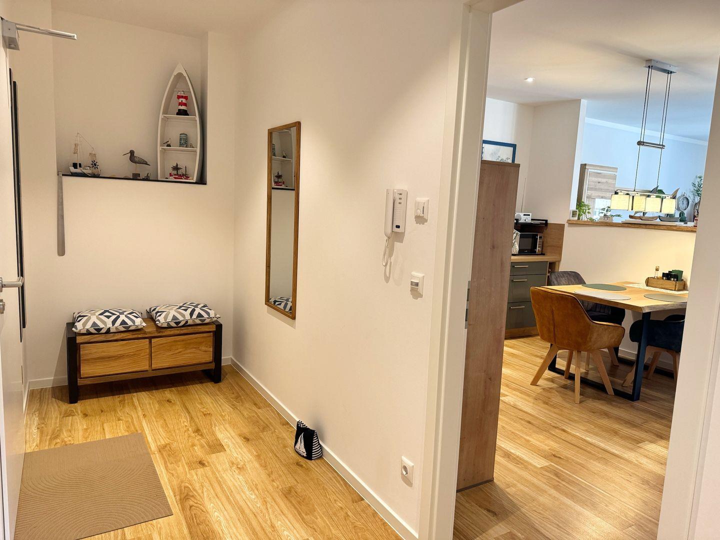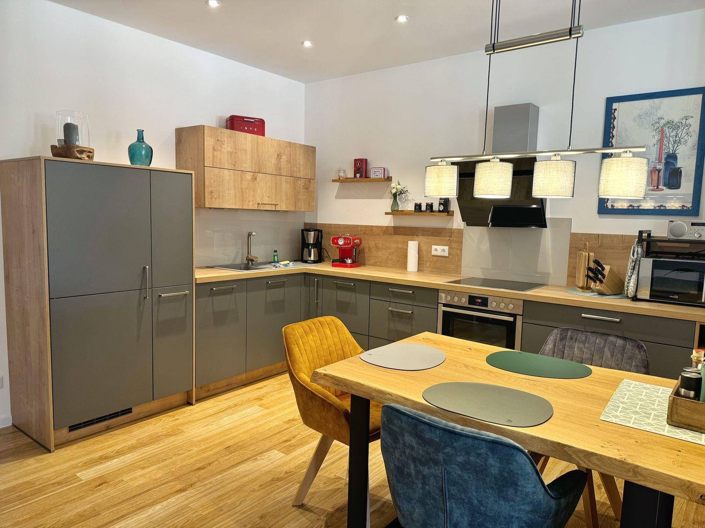 In das Wohn-Esszimmer ist eine moderne Einbauküche integriert. Die Küche ist komplett ausgestattet mit Geschirrspüler, Induktions-Herd, Backofen, Mikrowelle, Kühlschrank mit Gefriermöglichkeit und weiteren Selbstverständlichkeiten wie Kaffeemaschine, Wasserkocher und Toaster.