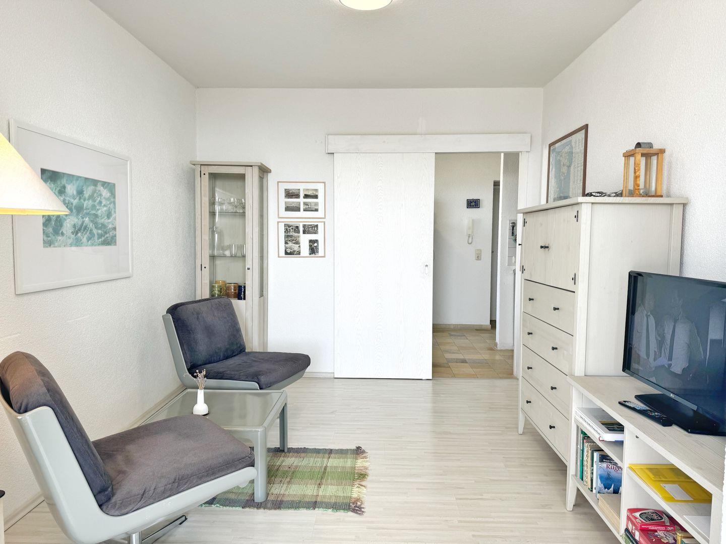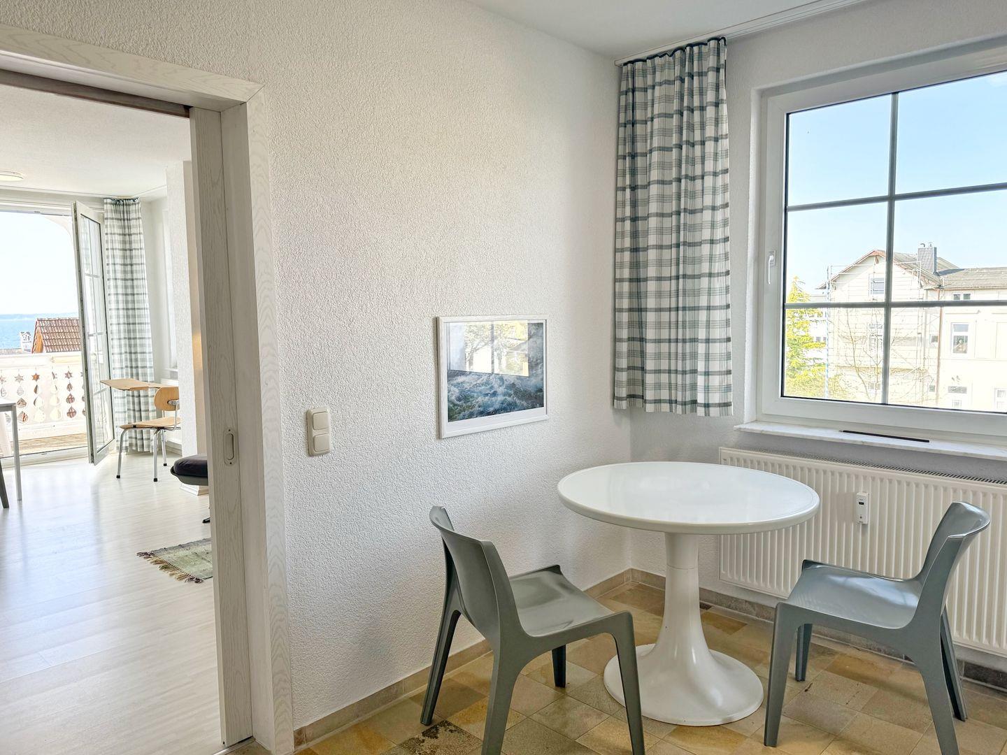 Die hell und freundlich eingerichtete Ferienwohnung mit 42qm Wohnfläche besteht aus zwei Zimmern, einer offenen Miniküche und einem Tageslichtbad mit Dusche. Sie bietet Platz für 2 Personen. Vom Balkon im historischen Bäderstil haben Sie einen herrlichen Meerblick.