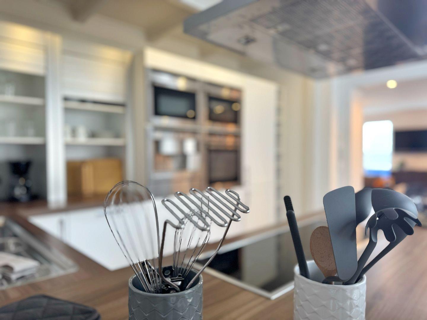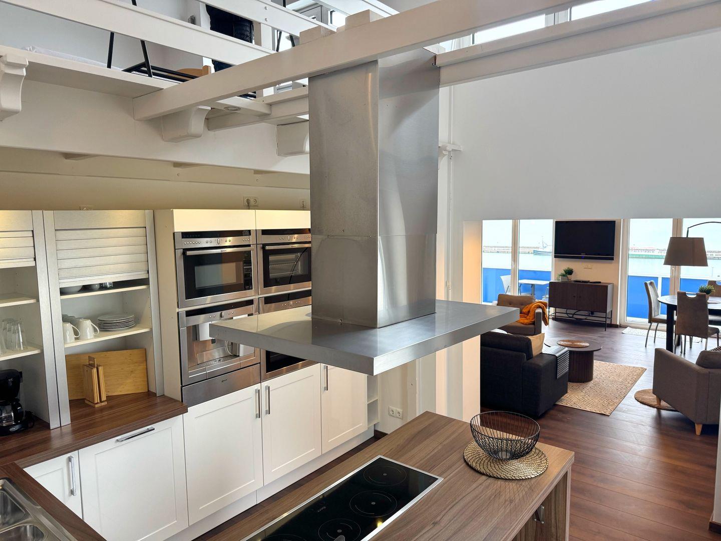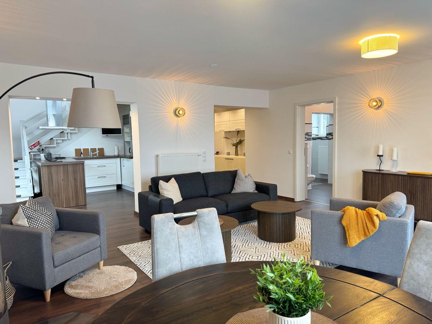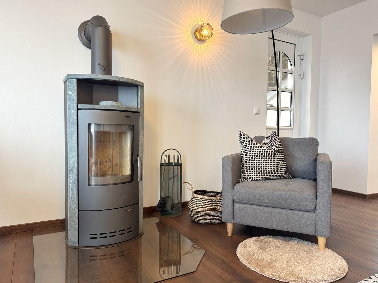 Das Herzstück der Wohnung ist der geräumige Wohnbereich, der einen offenen Zugang zur voll ausgestatteten Küche bietet. Hier finden Sie alles, was Sie für die Zubereitung köstlicher Mahlzeiten benötigen – vom Cerankochfeld über einen Backofen bis hin zur Spülmaschine. Der gemütliche Essbereich lädt zu geselligen Runden ein, während die Sofaecke für entspannte Stunden nach einem aufregenden Tag am Strand sorgt. Ein Kaminofen bringt zusätzlich Wärme und Gemütlichkeit in die Räumlichkeiten, ideal für kalte Winterabende.
