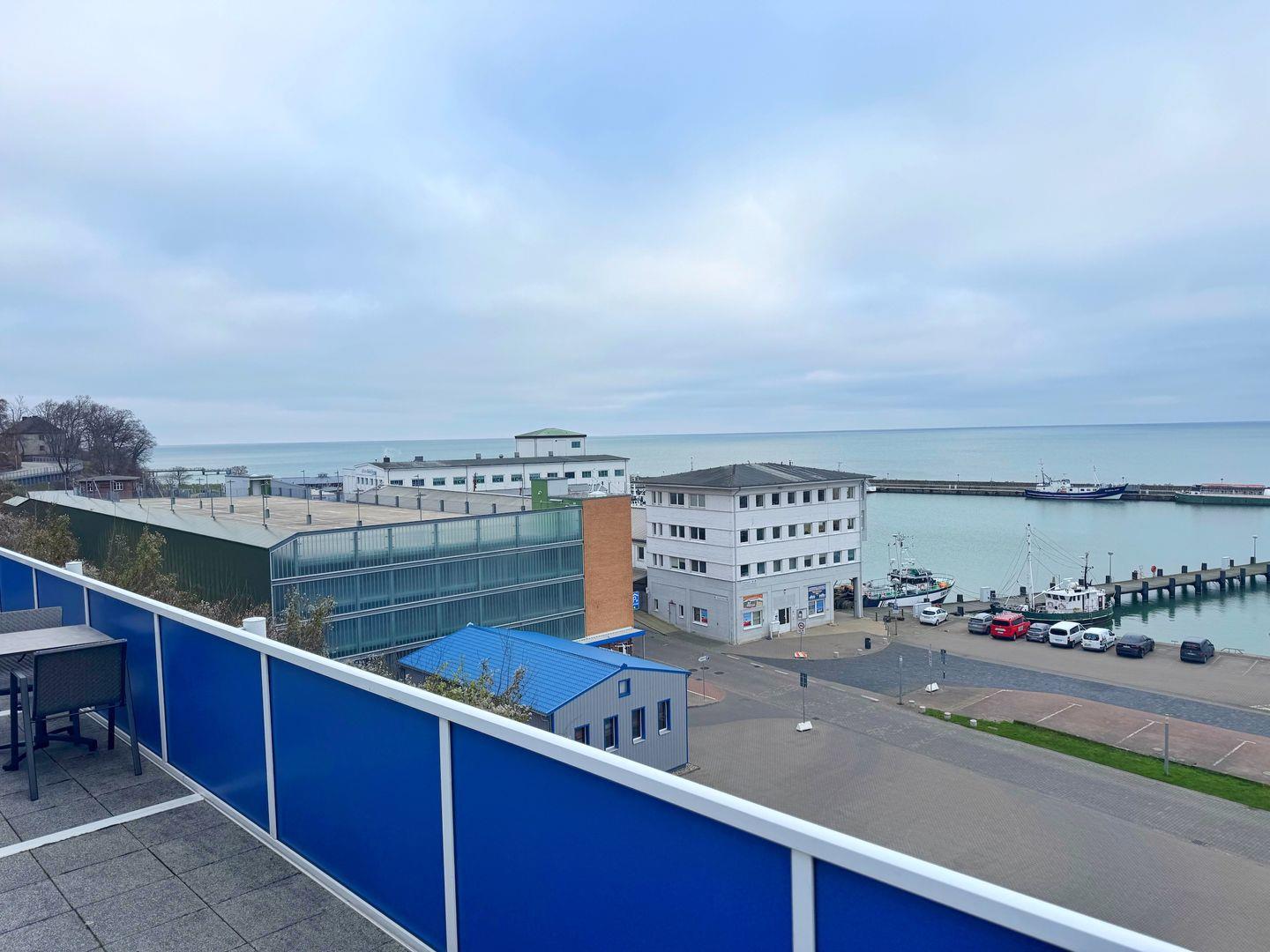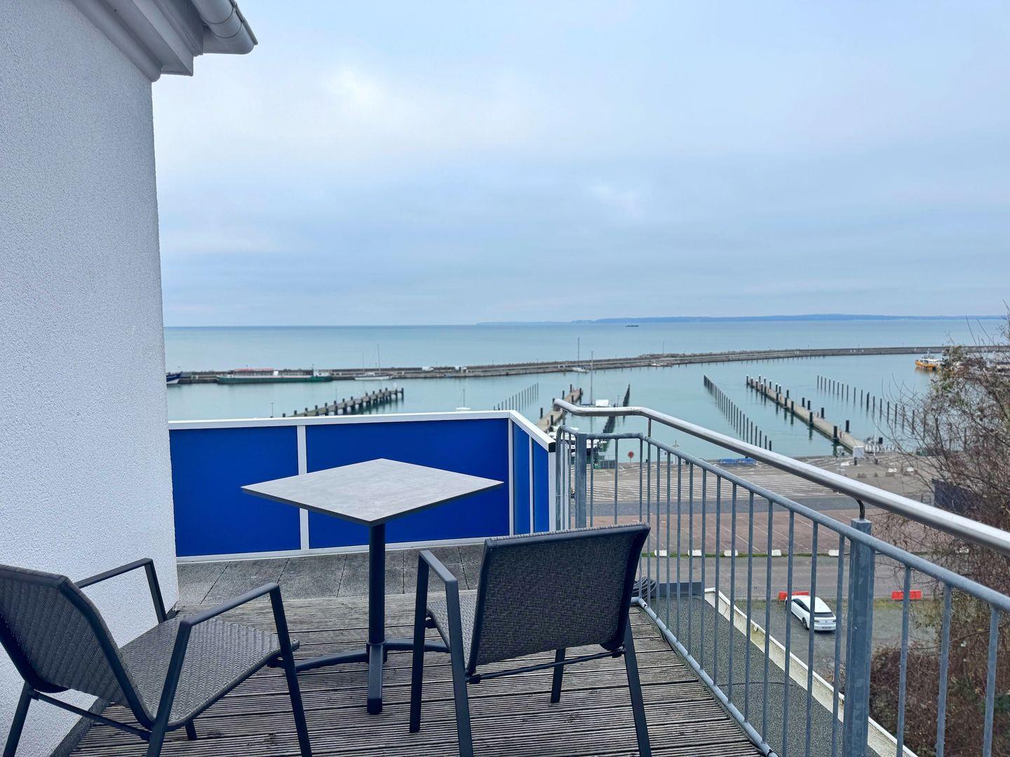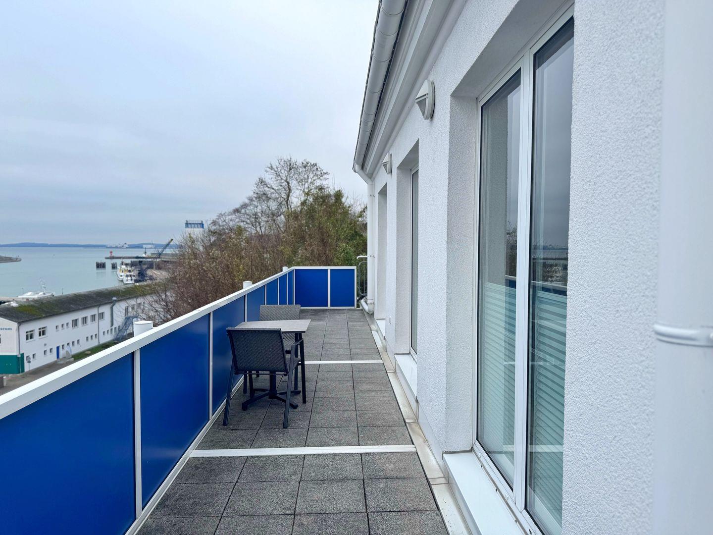 Ein weiteres Highlight ist der umlaufende Balkon, von dem aus Sie den außergewöhnlich guten Meerblick genießen können. Hier können Sie bei einem Glas Wein das bunte Treiben im Sassnitzer Stadthafen beobachten oder einfach die frische Meeresluft aufsaugen. Der private Parkplatz vor dem Haus bietet Ihnen die notwendige Bequemlichkeit, besonders wenn Sie mit dem Auto anreisen.