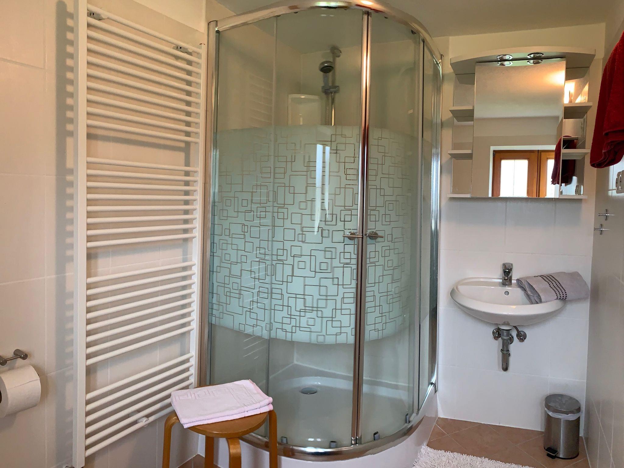 Die gemütliche Ferienwohnung bietet Platz auf 42 qm und liegt im Obergeschoß. Sie ist ausgestattet mit einem separaten Schlafzimmer mit Doppelbett, einem Wohnzimmer mit Sitzgruppe, Essecke und Kochnische (Kühlschrank, Tiefkühlfach, Kaffeemaschine, Wasserkocher, Mikrowelle), Dusche/WC mit Fön und Handtüchern. Auf dem möblierten Balkon genießen Sie den Ausblick auf die Berge.