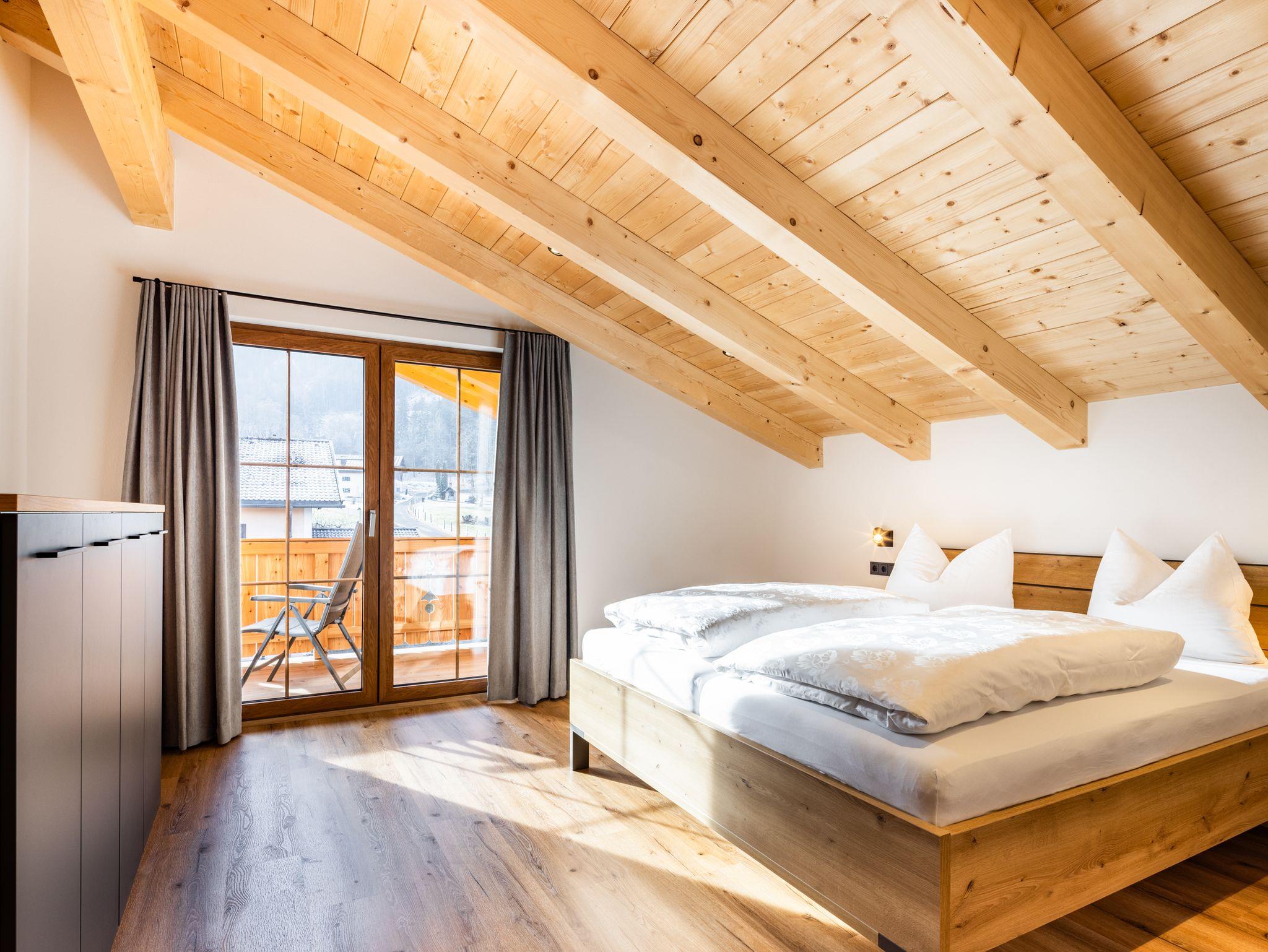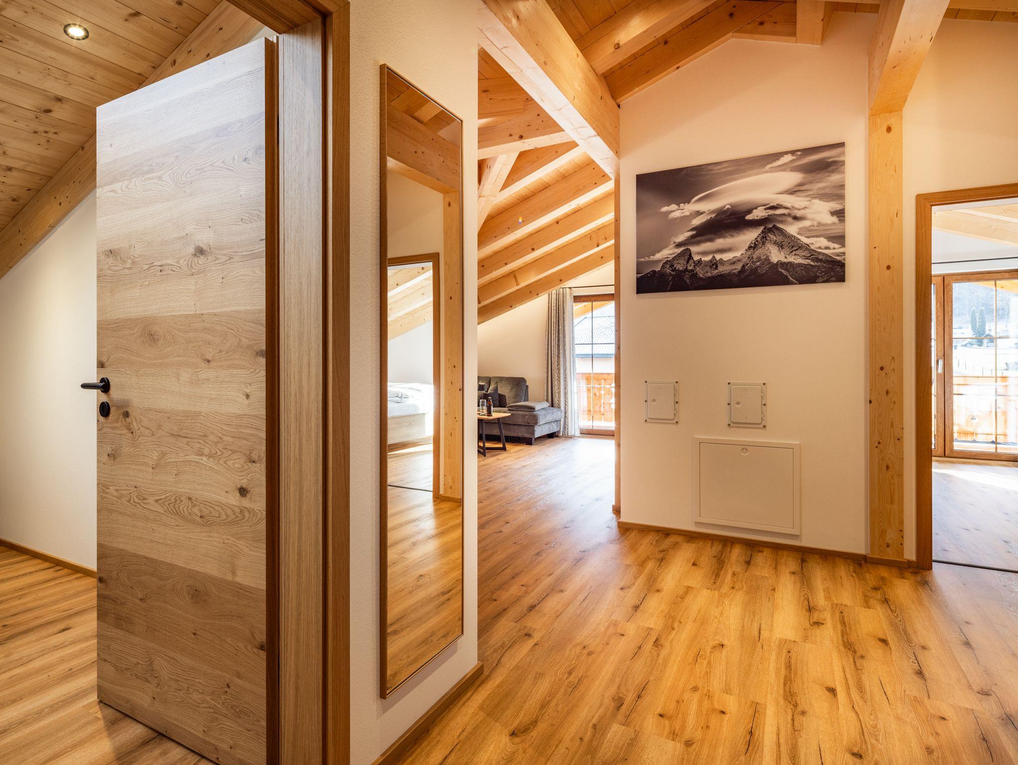 Luxuriöse neu gebaute Dachgeschoss- Ferienwohnung Stilvoll und mit Liebe zum Detail eingerichtet erwartet Sie ein edler Wohnbereich mit integrierter Küche, zwei Schlafzimmern sowie ein modernes Bad mit Dusche und WC plus zusätzlichem separatem WC. Drei Fernseher- je einer in beiden Schlafzimmern und im Wohnbereich-sorgen für angenehme Unterhaltung. Auf den zwei großzügigen Balkonen( Süd und Ostausrichtung) eröffnet sich ein beeindruckendes Bergpanorama, das zu jeder Tageszeit zum Innehalten einlädt. Die Lage ist ideal: mehrere Gaststätten, Pizzeria, Bäckerei,Bushaltestelle und ein Freibad sind in rund 5 Minuten fußläufig erreichbar. Der Königssee ist bei einem 15-20 minütigen Spaziergang bequem erreichbar.