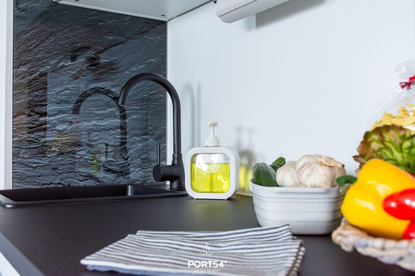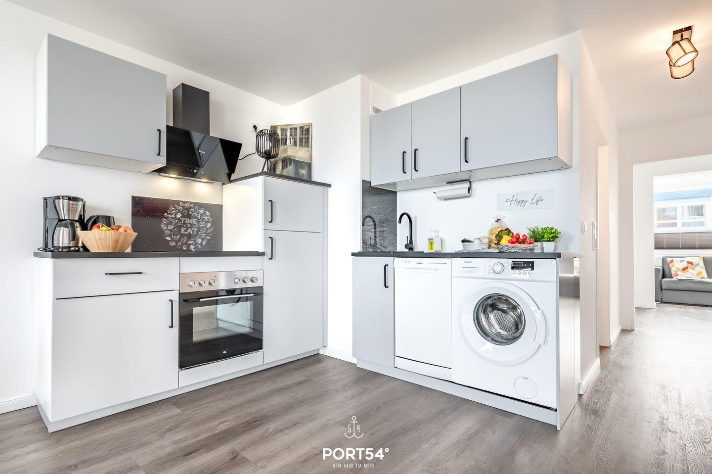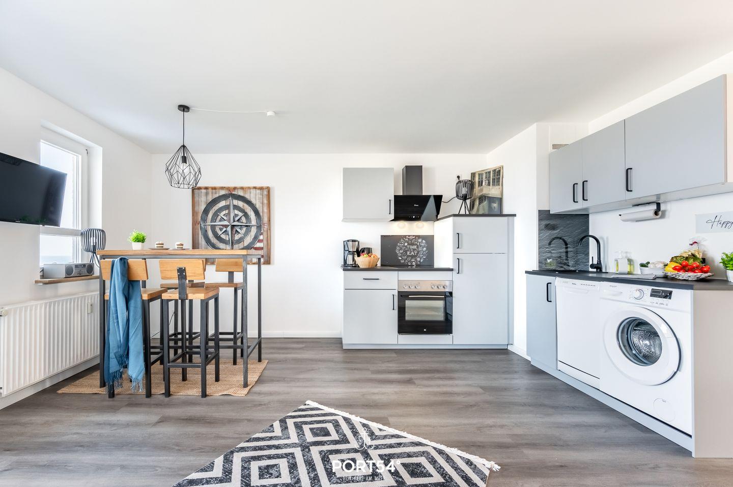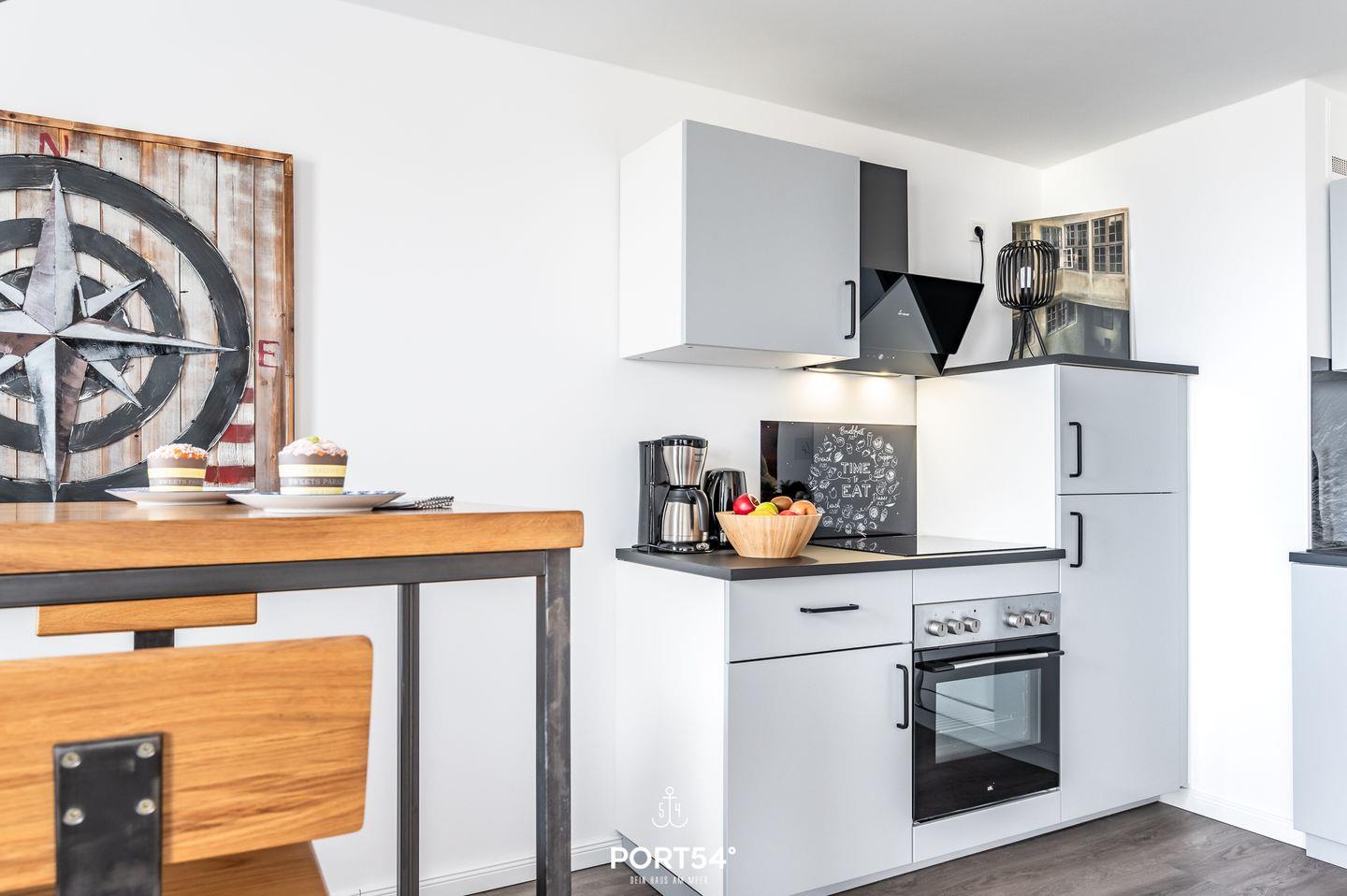 Im Inneren erwartet dich eine moderne und stilvolle Einrichtung. Die offene Wohnküche mit Essbereich lädt zum gemeinsamen Kochen und Genießen ein. Die Küche ist komplett ausgestattet mit Induktions-Kochfeld, Backofen, Geschirrspüler, Kühlschrank mit Gefrierfach, Kaffeemaschine, Wasserkocher und Toaster.