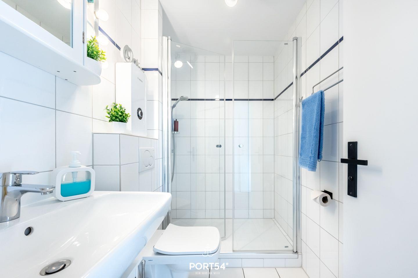 Das Badezimmer verfügt über eine moderne Dusche, ein WC und ein Waschbecken.