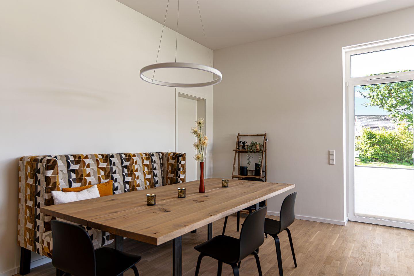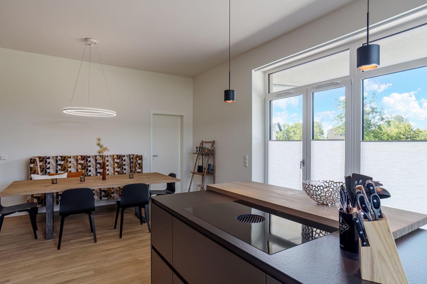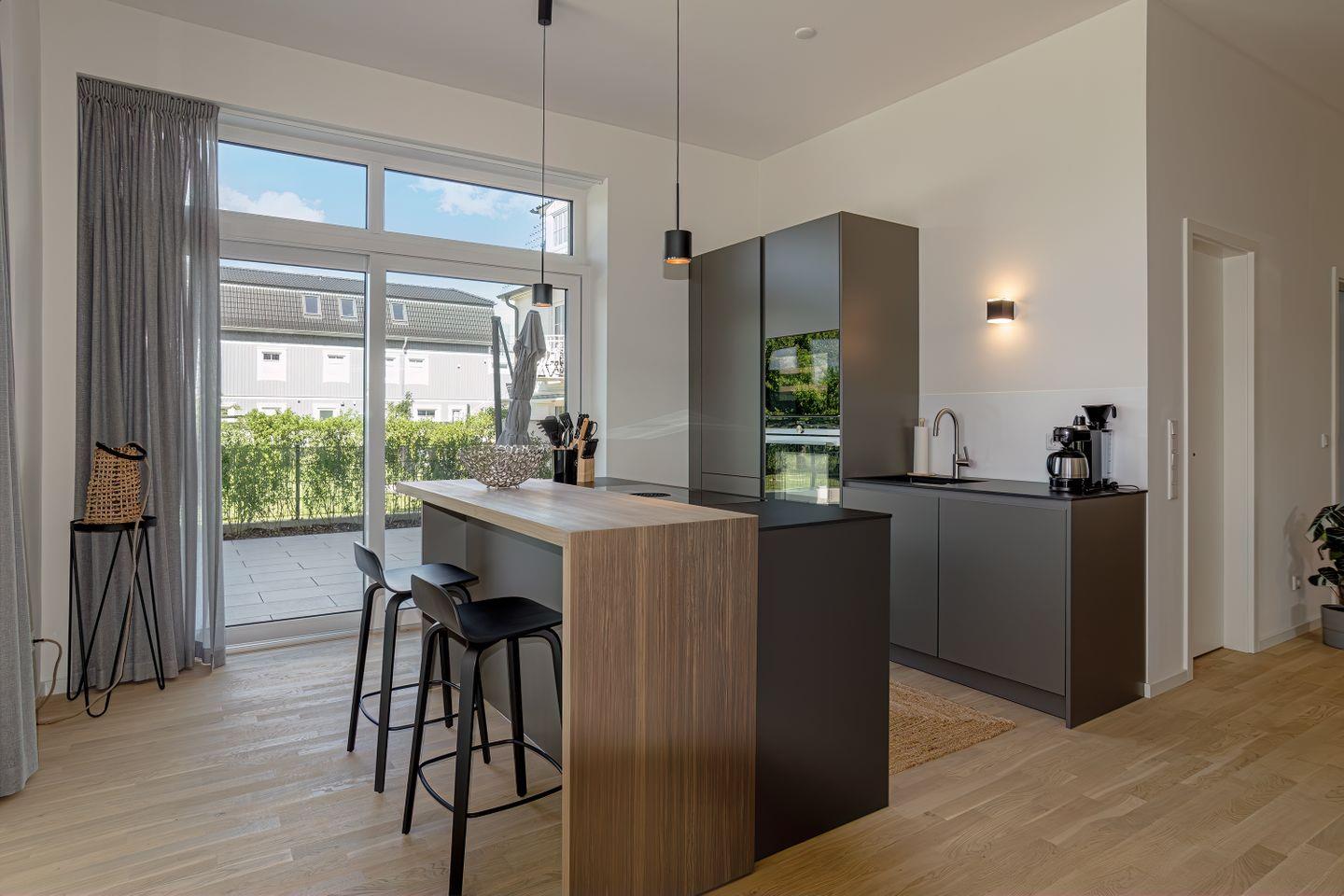 Die offene, voll ausgestattete Küche lässt das Herz jedes Hobbykochs höherschlagen. Bereite deine Lieblingsgerichte zu und genieße sie anschließend im angrenzenden Essbereich. Große Fenster sorgen dafür, dass viel Tageslicht in die Räume fällt und eine einladende Atmosphäre entsteht.