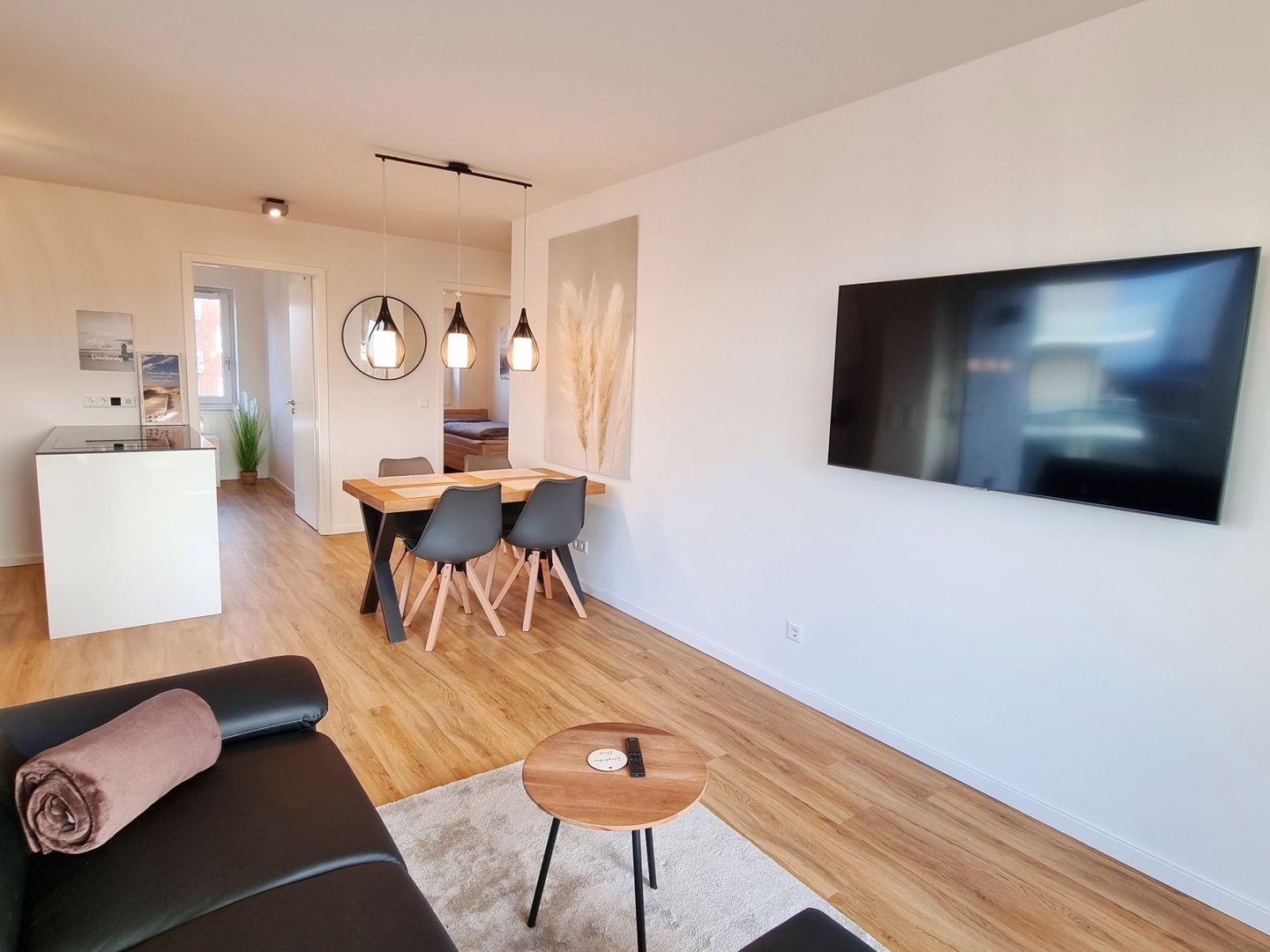 Euch erwartet eine 3-Zimmer-Wohnung mit zwei Schlafzimmern, einem Duschbad, einem Wohn-Essbereich mit offener Küche und der großzügigen Balkon. Das Appartement ist für 4 Personen (+ eine zusätzliche Person) geeignet. Die Schlafzimmer teilen sich in ein Doppelbettzimmer und ein Zweibettzimmer, außerdem kann die Couch im Wohnzimmer zur Schlafcouch ausgeweitet werden. Ein eigener PKW-Stellplatz ist direkt am Haus und auch WLAN ist selbstverständlich inklusive. Zwei Hunde sind herzlich willkommen.