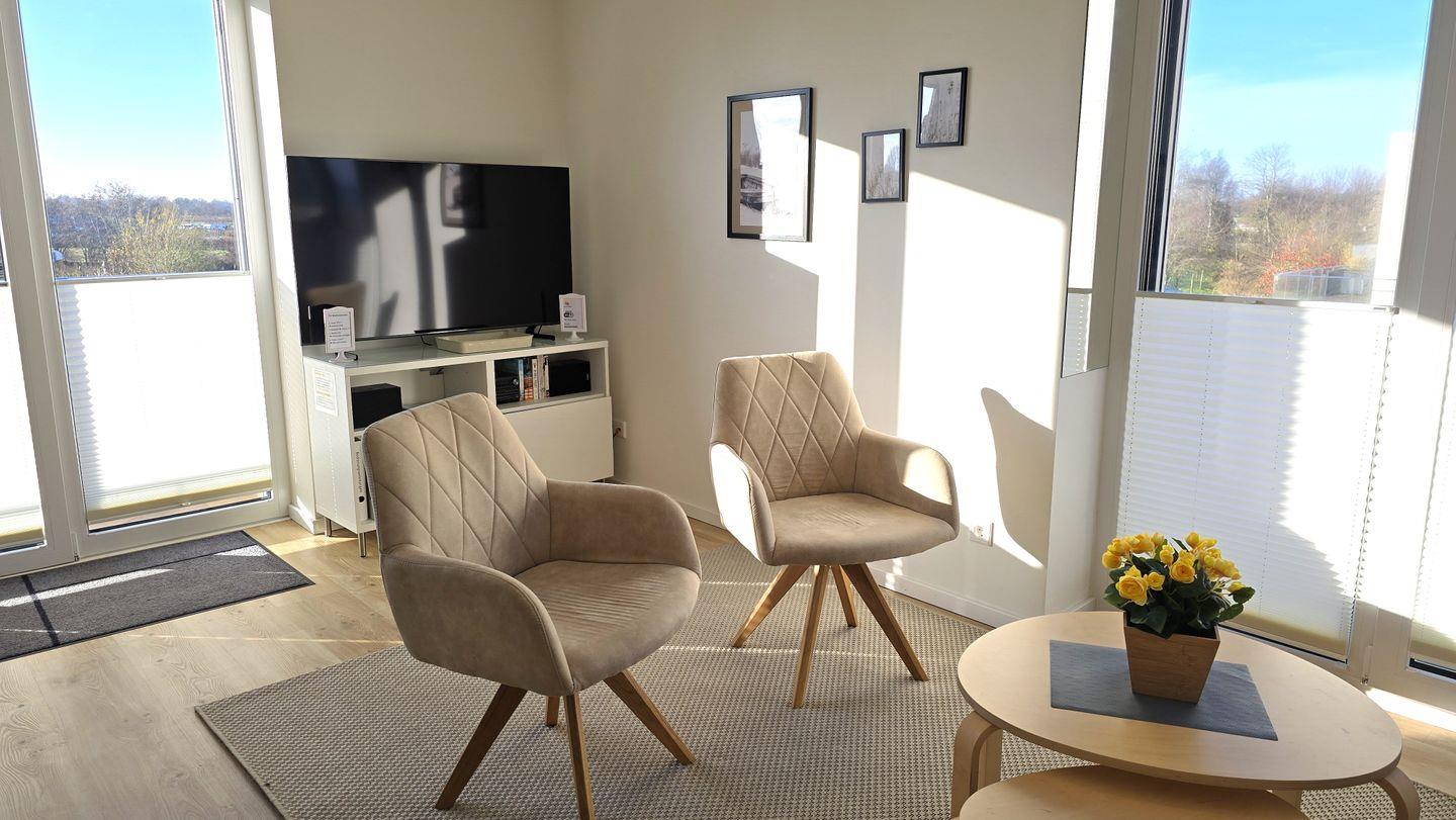 Die hochwertig ausgestattete Wohnung im modernen Design ist geschmackvoll, modern und hell eingerichtet. Über den Eingangsbereich gelangen Sie in das Badezimmer mit bodenebener Dusche, WC und Waschbecken und Waschmaschine. Den Mittelpunkt des großen, lichtdurchfluteten Wohn-/Esszimmers bildet die offene und komplett ausgestattete Luxusküche. Hier können Sie beim gemeinsamen Kochen die Kommunikation pflegen oder im gemütlichen Sofa- und Sesselbereich entspannen.