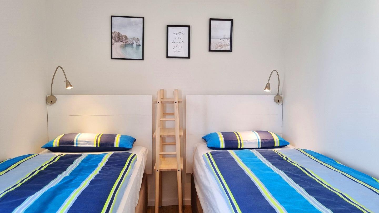 Die Ferienwohnung verfügt über zwei Schlafzimmer mit modernen Boxspringbetten, ein größeres mit Doppelbett (180x200) und LED-Fernseher und ein kleineres mit zwei Einzelbetten (90x200).