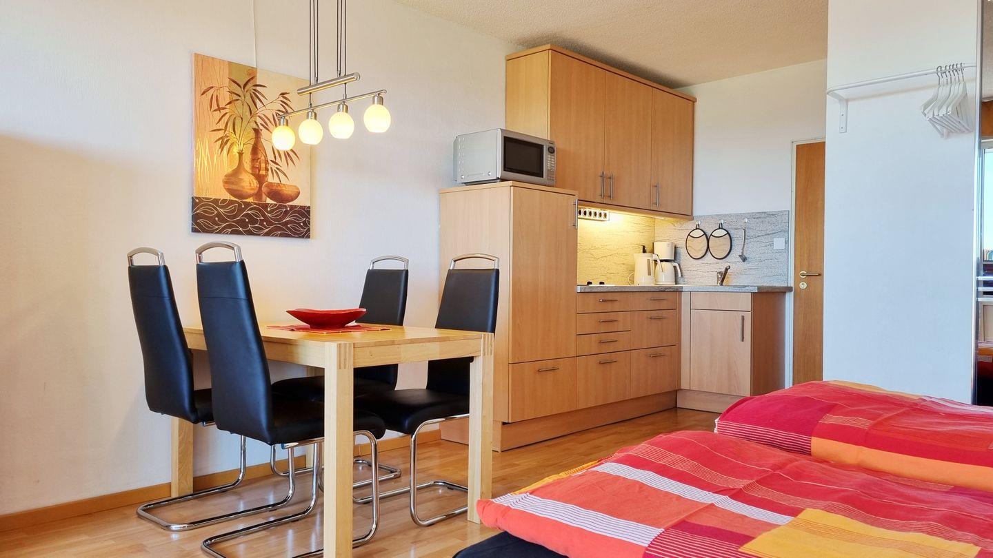 Das farbenfrohe Urlaubsdomizil besticht durch ein offenes Raumkonzept, mit offener Küche, gemütlichem Doppelbett und Wohn-Essbereich mit Fernseher, sowie einem innenliegenden Duschbad. Zum Verweilen lockt die nicht einsehbare Loggia, die sich durch große, komplett öffnende Fenster in einen Balkon verwandeln lässt und einen fantastischen Blick über die Ostsee, die Salzwiesen, die Kieler Förde und an manchen Tagen sogar bis nach Eckernförde bietet. Die Loggia ist gen Westen ausgerichtet, wodurch das Appartement vom frühen Nachmittag, bis zum Anbruch der Nacht sonnendurchflutet ist. Der Ostseestrand ist nach einem gerade einmal 600m kurzen Spaziergang durch die Salzwiesenlandschaft bereits erreicht.