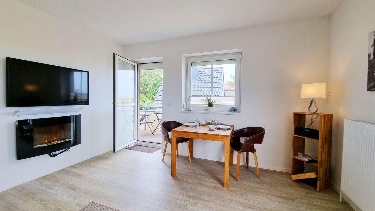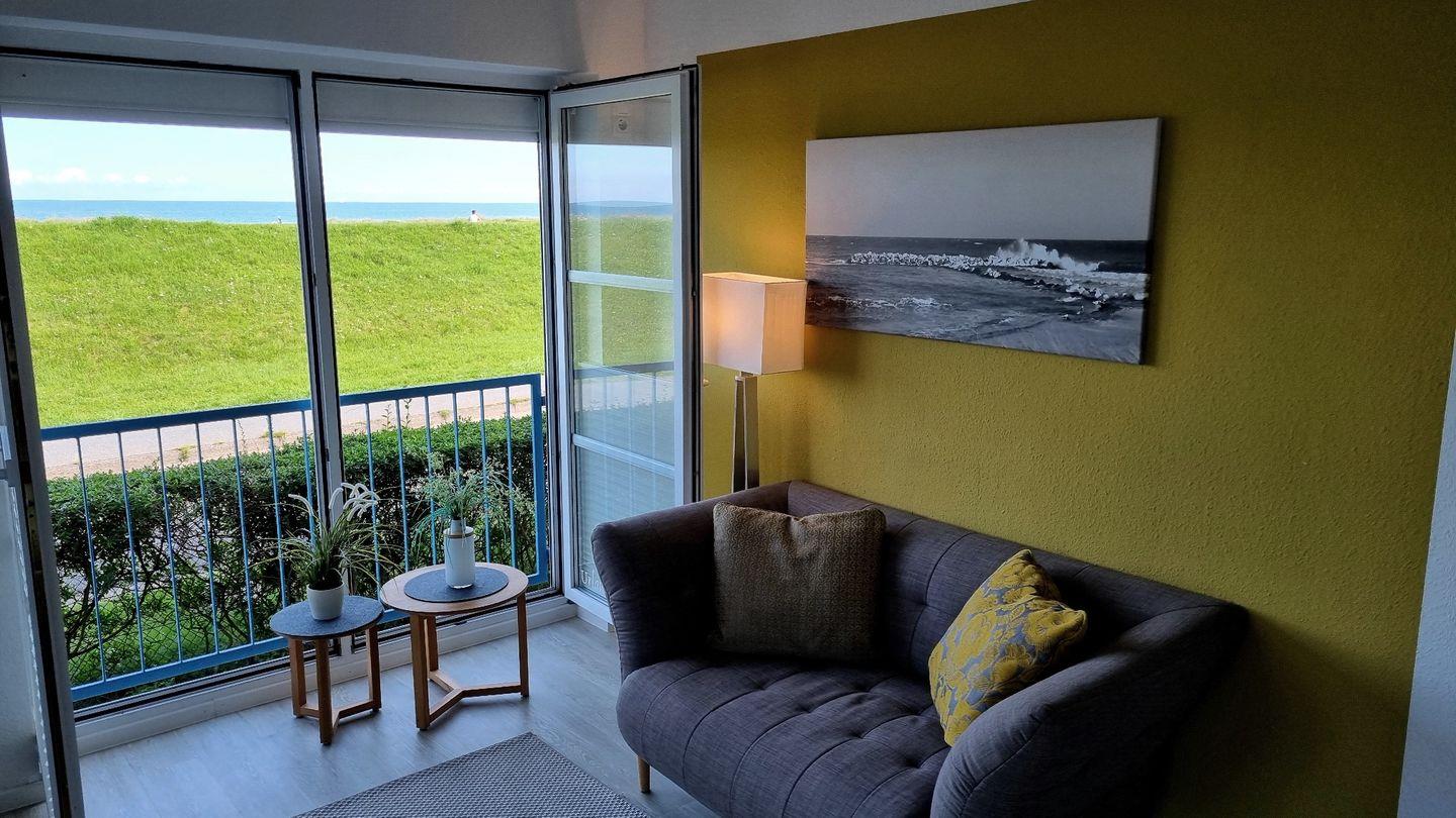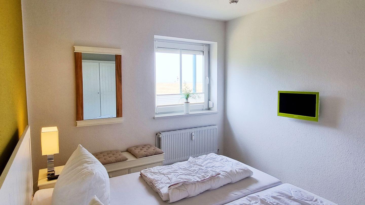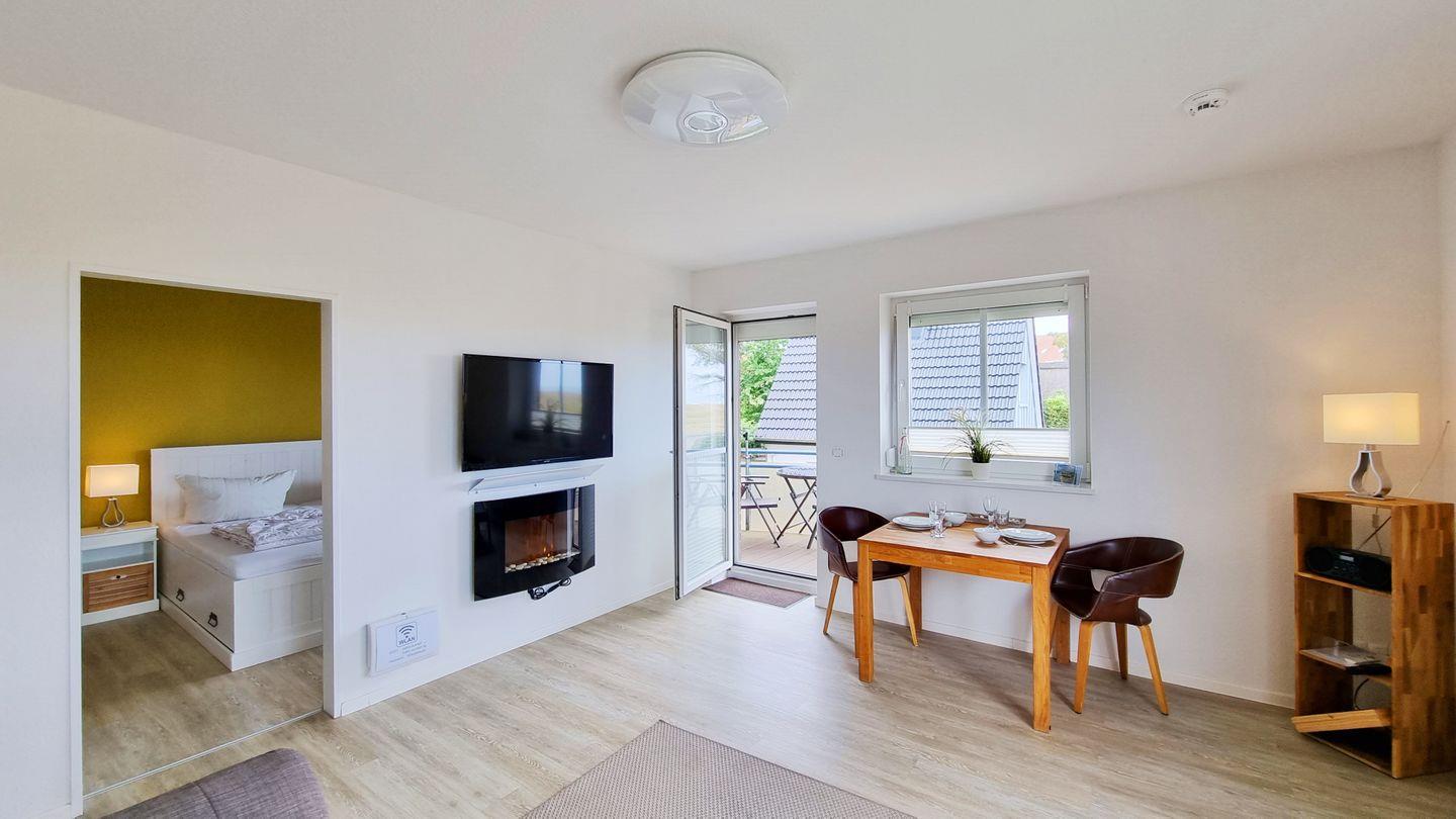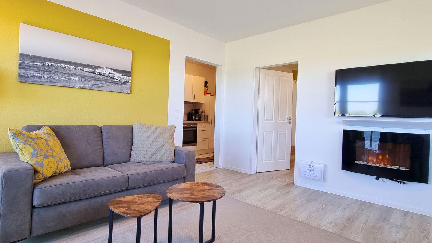 Das Schlafzimmer bietet ein großes Doppelbett nebst Fernseher zur Unterhaltung. Vom Wohnbereich aus lässt sich mit Blick über den Deich das Meer sehen. Ein Zweisitzersofa (inkl. Schlaffunktion), ein gemütlicher Sessel, ein Esstisch mit 3 Stühlen, sowie ein großer Wand-TV runden den Raum ab. Für wohlige Stimmung sorgt der elektronische Kamin mit Kaminfeuer-Illusion.