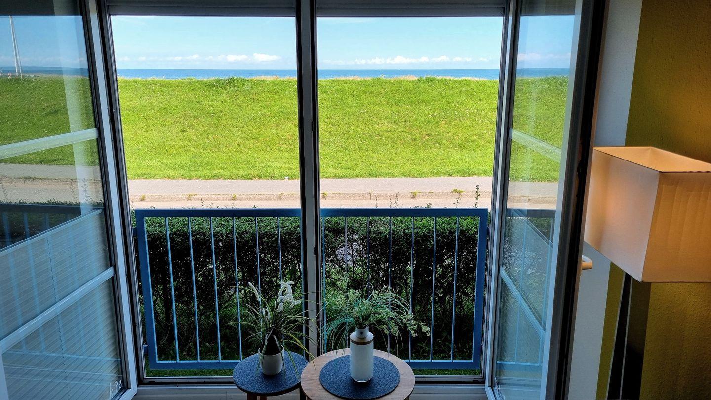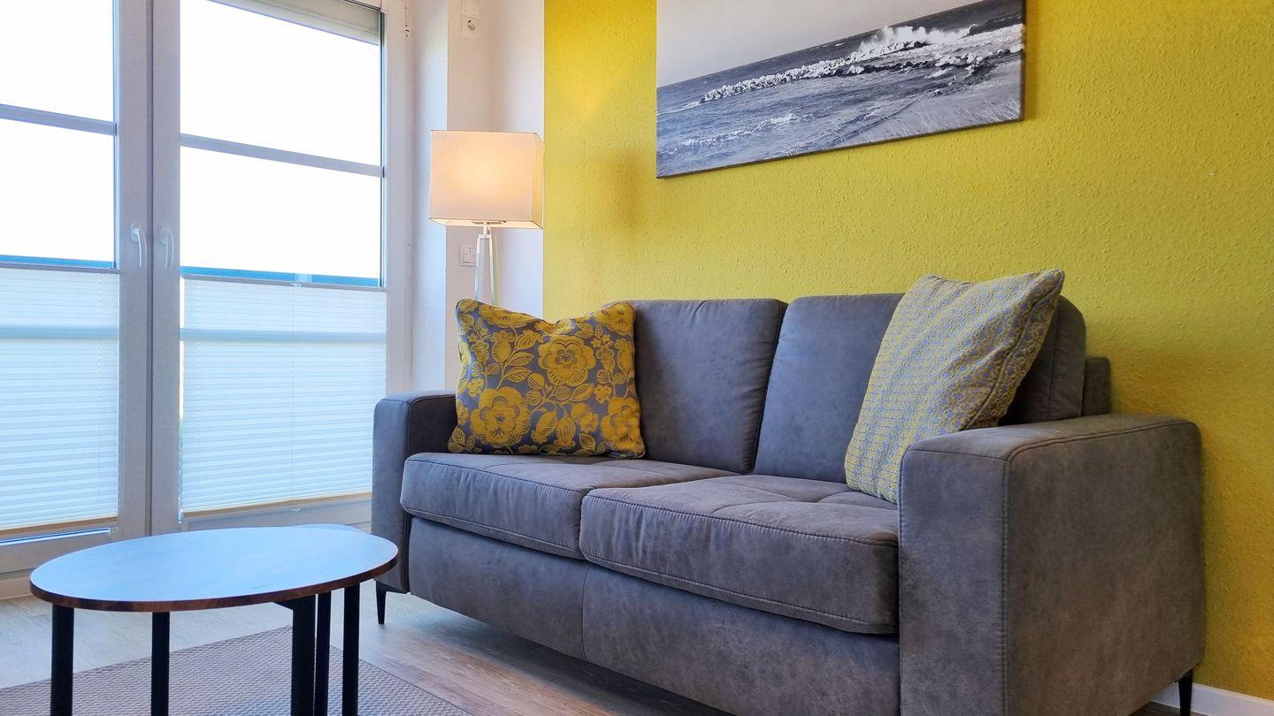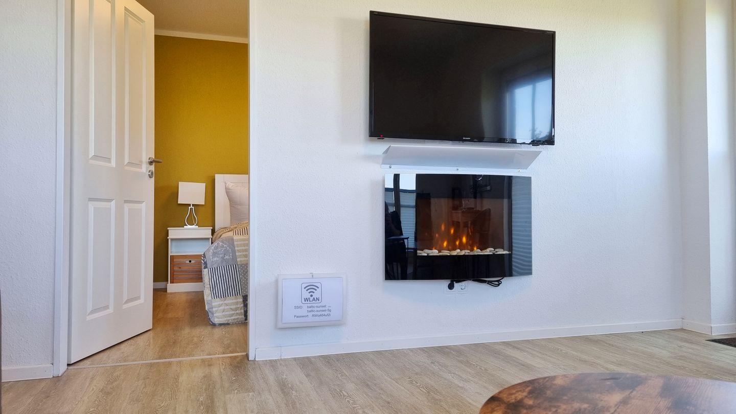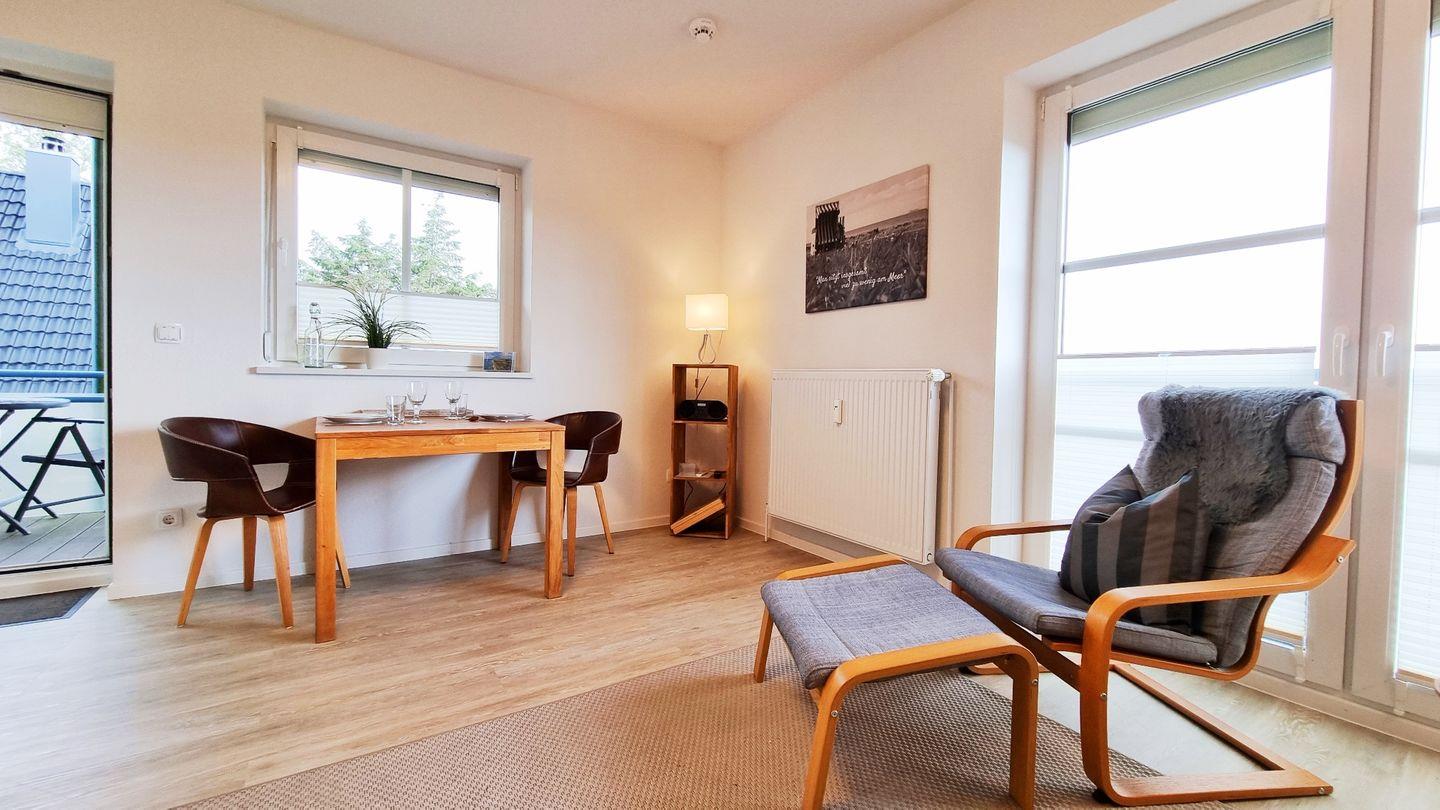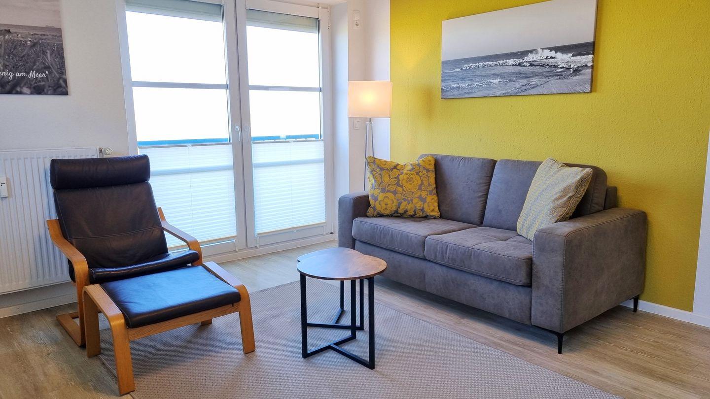 Das Schlafzimmer bietet ein großes Doppelbett nebst Fernseher zur Unterhaltung. Vom Wohnbereich aus lässt sich mit Blick über den Deich das Meer sehen. Ein Zweisitzersofa (inkl. Schlaffunktion), ein gemütlicher Sessel, ein Esstisch mit 3 Stühlen, sowie ein großer Wand-TV runden den Raum ab. Für wohlige Stimmung sorgt der elektronische Kamin mit Kaminfeuer-Illusion.
