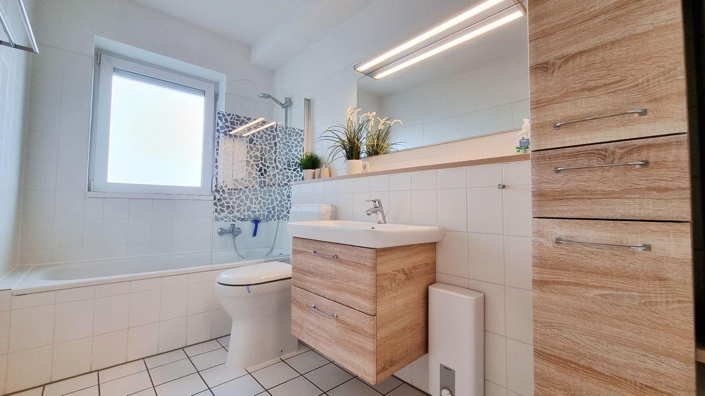 Das moderne Wannenbad mit Fenster gehört ebenso zur Wohnung, wie der westlich gelegene Balkon, der die Nachmittagssonne und die schönsten Sonnenuntergänge einfängt.