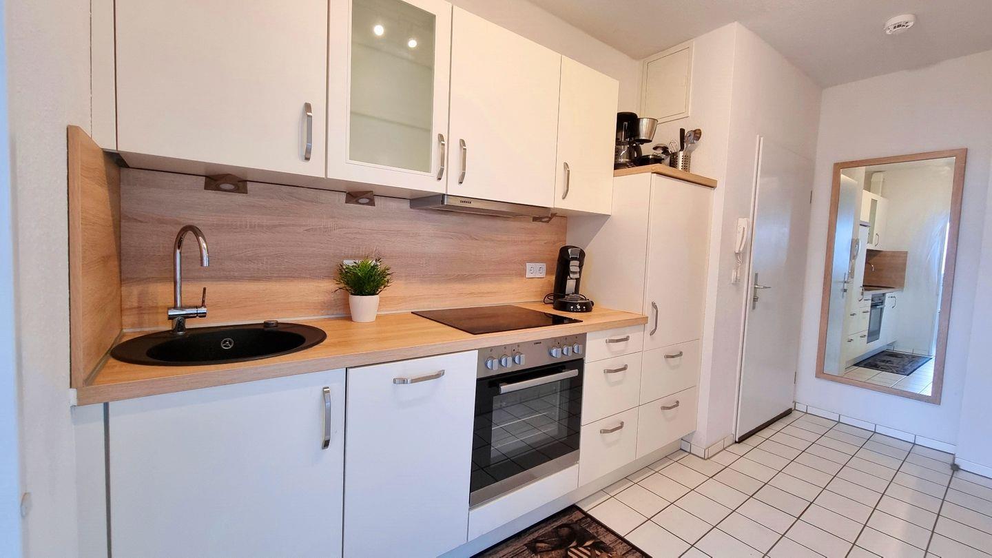 Küche: moderne Küchenzeile / Cerankochfeld / Dunstabzugshaube / Backofen / Geschirrspüler / Mikrowelle / Toaster / Filterkaffeemaschine / Senseo Kapselmaschine / Wasserkocher / Kühlschrank mit Gefrierfach