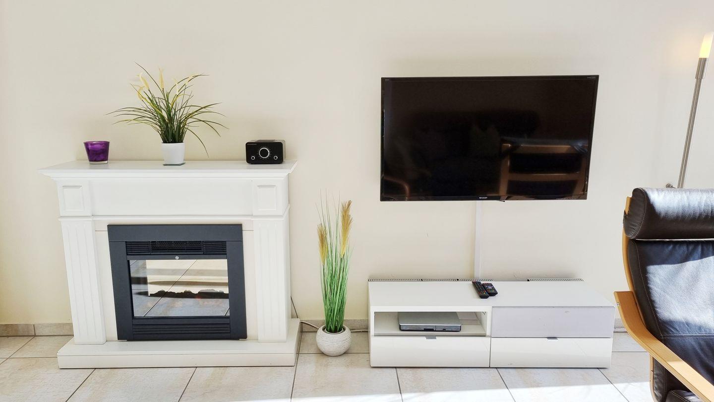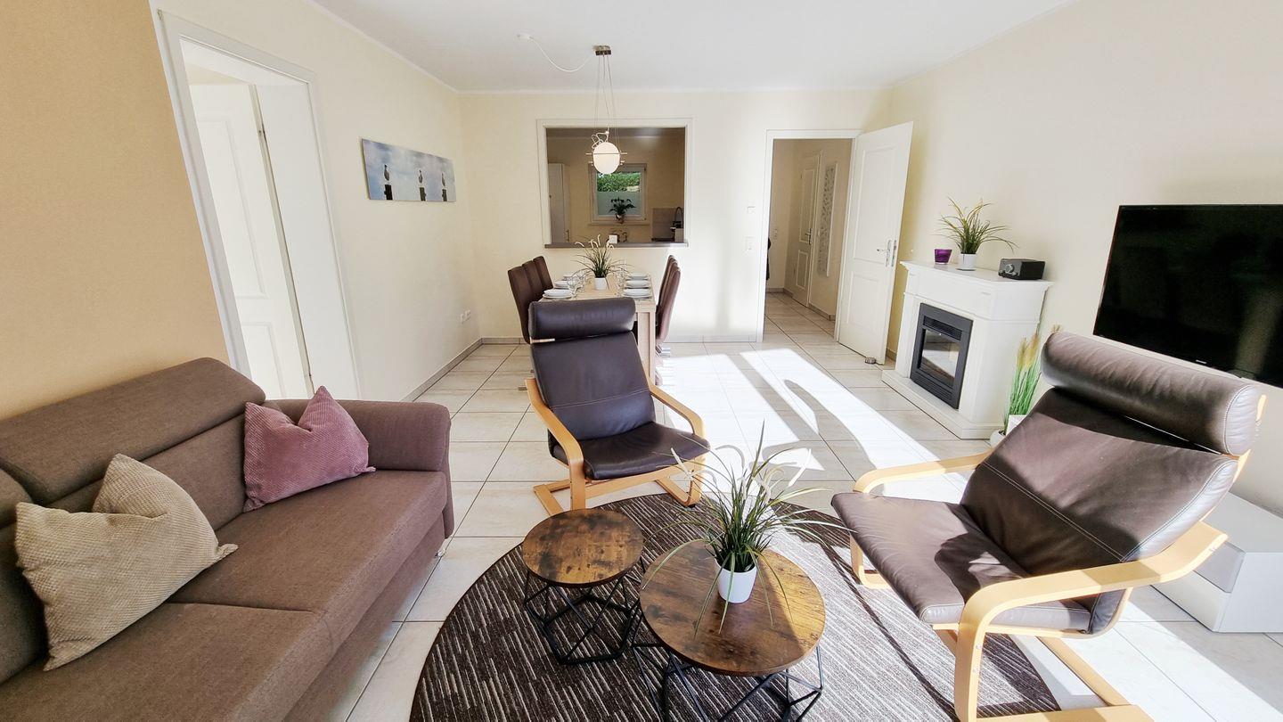 Wohn- Essbereich: gemütliche Couch / 3 Sessel / Fernseher / elektrischer Kamin / Esstisch / 6 Stühle