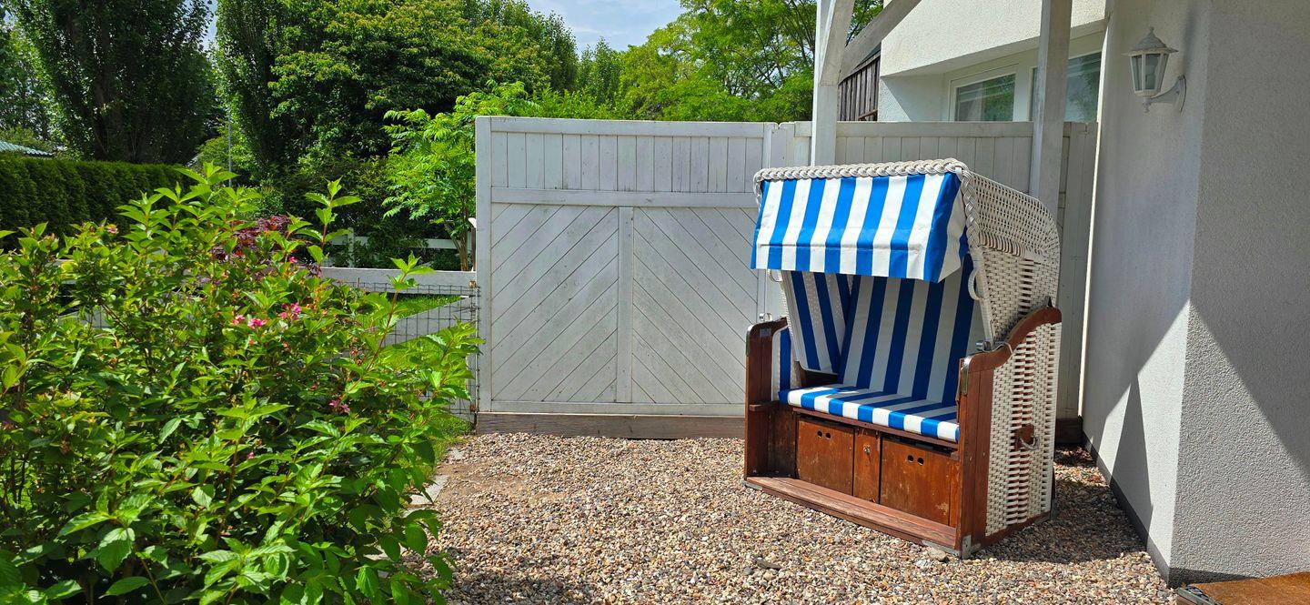 Im Garten findet sich neben der Liegewiese und Terrasse ein Strandkorb, sowie eine Wellenliege zum gemütlich in der Sonne sitzen. Selbstverständlich darf ein Grill für kulinarische Highlights nicht fehlen.