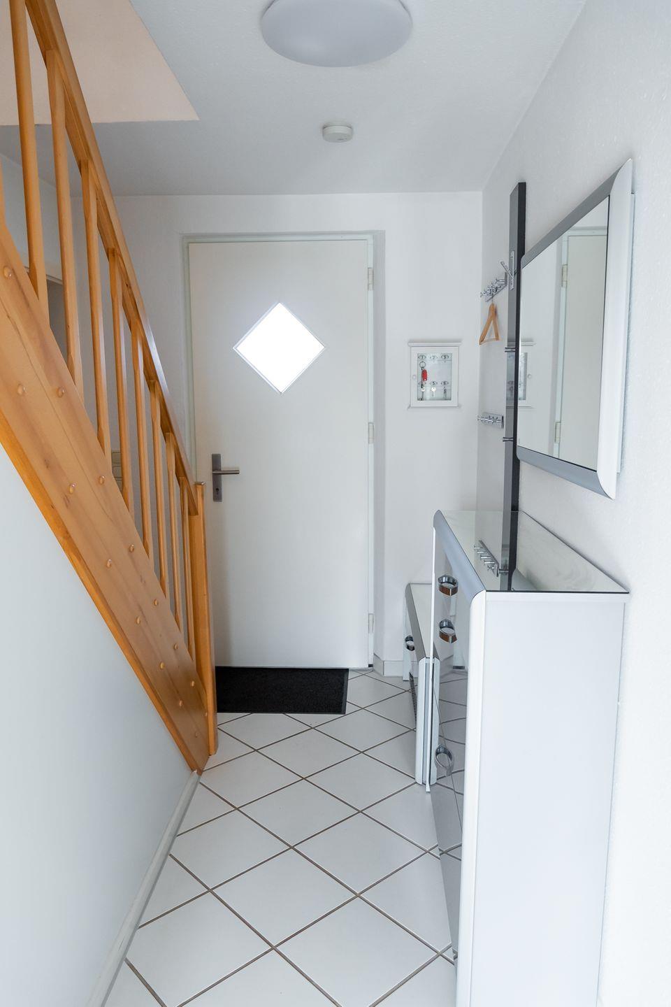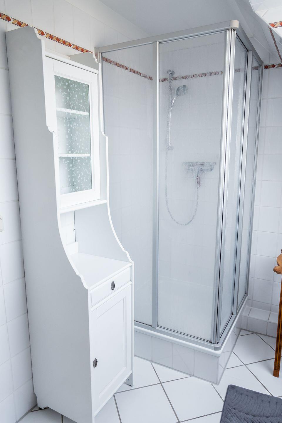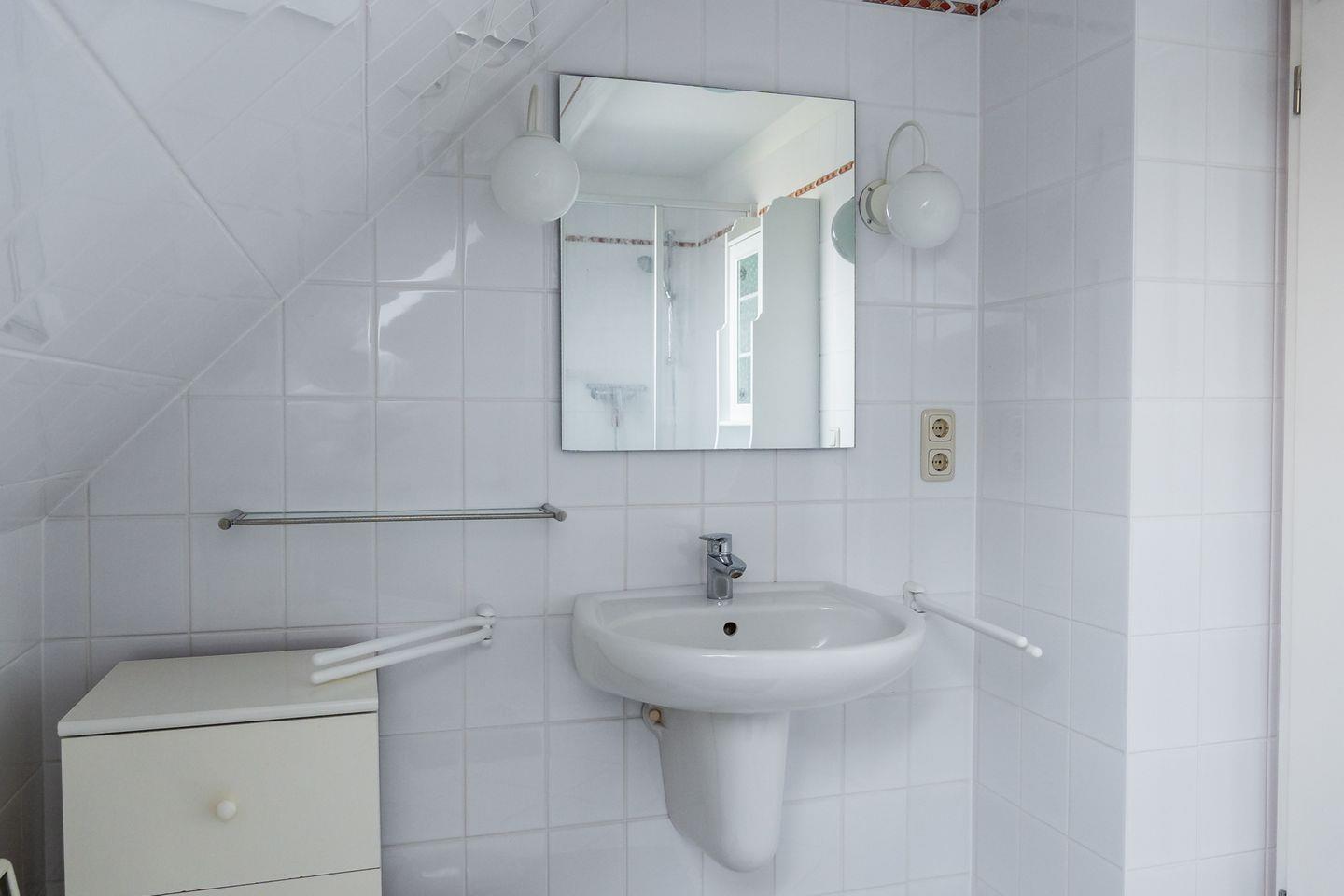 Im Haus gibt es 1 Badezimmer mit bodengleicher Dusche, WC, Fenster und Kosmetikspiegel. Zusätzlich steht ein Gäste-WC zur Verfügung. Die Schlafzimmer und der Wohnbereich sind mit Laminatboden ausgestattet.