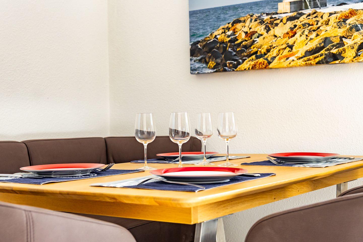 Die Küche ist offen zum Wohnzimmer gestaltet und umfassend ausgestattet: Ceran-Herd, Backofen, Mikrowelle, Kühlschrank mit Gefrierfach, Spülmaschine sowie Kaffeemaschine, Wasserkocher und Toaster stehen bereit. Küchenutensilien, Geschirr und Besteck sind vorhanden; ebenso Geschirrhandtücher, Abfalleimer und eine Erstausstattung. Bettwäsche ist inklusive. Für längere Aufenthalte oder den Strandalltag profitieren Sie zudem von einer Waschmaschine zur Eigennutzung sowie einem Wäscheständer; Staubsauger ist ebenfalls vorhanden.