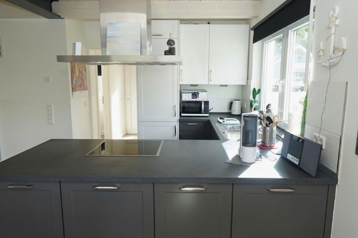 Die offene Küche zum Wohnzimmer ist funktional und vollständig ausgestattet. Sie finden hier unter anderem Cerankochfeld, Backofen, Mikrowelle, Kühlschrank mit Gefrierfach, Spülmaschine, Kaffeemaschine, Wasserkocher, Toaster, Küchenutensilien, Geschirr und Besteck. Geschirrhandtücher und eine Erstausstattung sind ebenfalls vorhanden, sodass der Aufenthalt bequem beginnen kann.