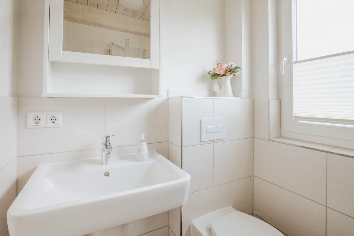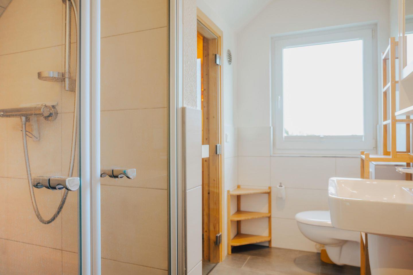 Zwei Badezimmer mit jeweils bodengleicher Dusche, WC, Fenster und Kosmetikspiegel bieten guten Komfort auch bei voller Belegung. Zur weiteren Ausstattung gehören Waschmaschine zur Eigennutzung, Wäscheständer, Staubsauger, Garderobe, Kommode, Bettwäsche und eine Erstausstattung. Das Nichtraucherhaus ist mit Zentralheizung und Fußbodenheizung ausgestattet, alle Fenster verfügen über Sichtschutz.
