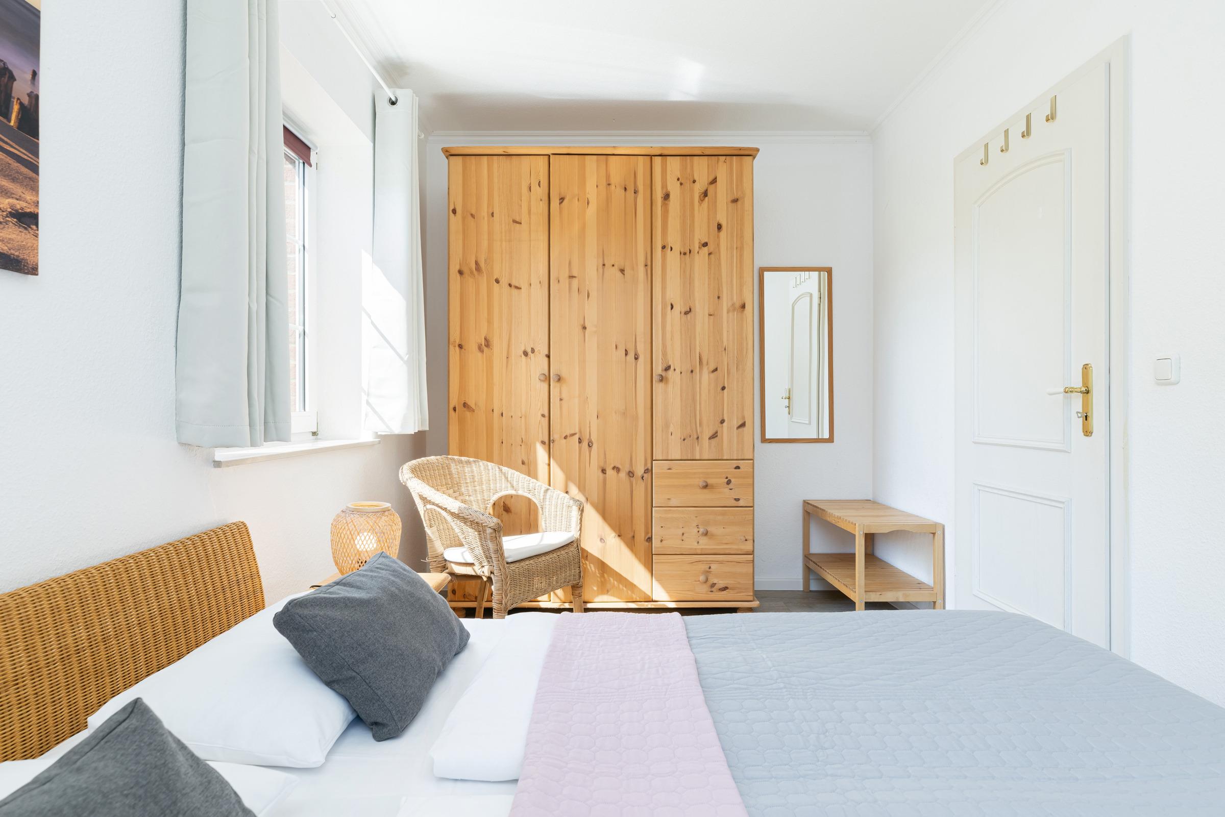 Schlafzimmer: 1 Doppelbett, Kleiderschrank; Verdunkelung: Jalousien, Gardinen