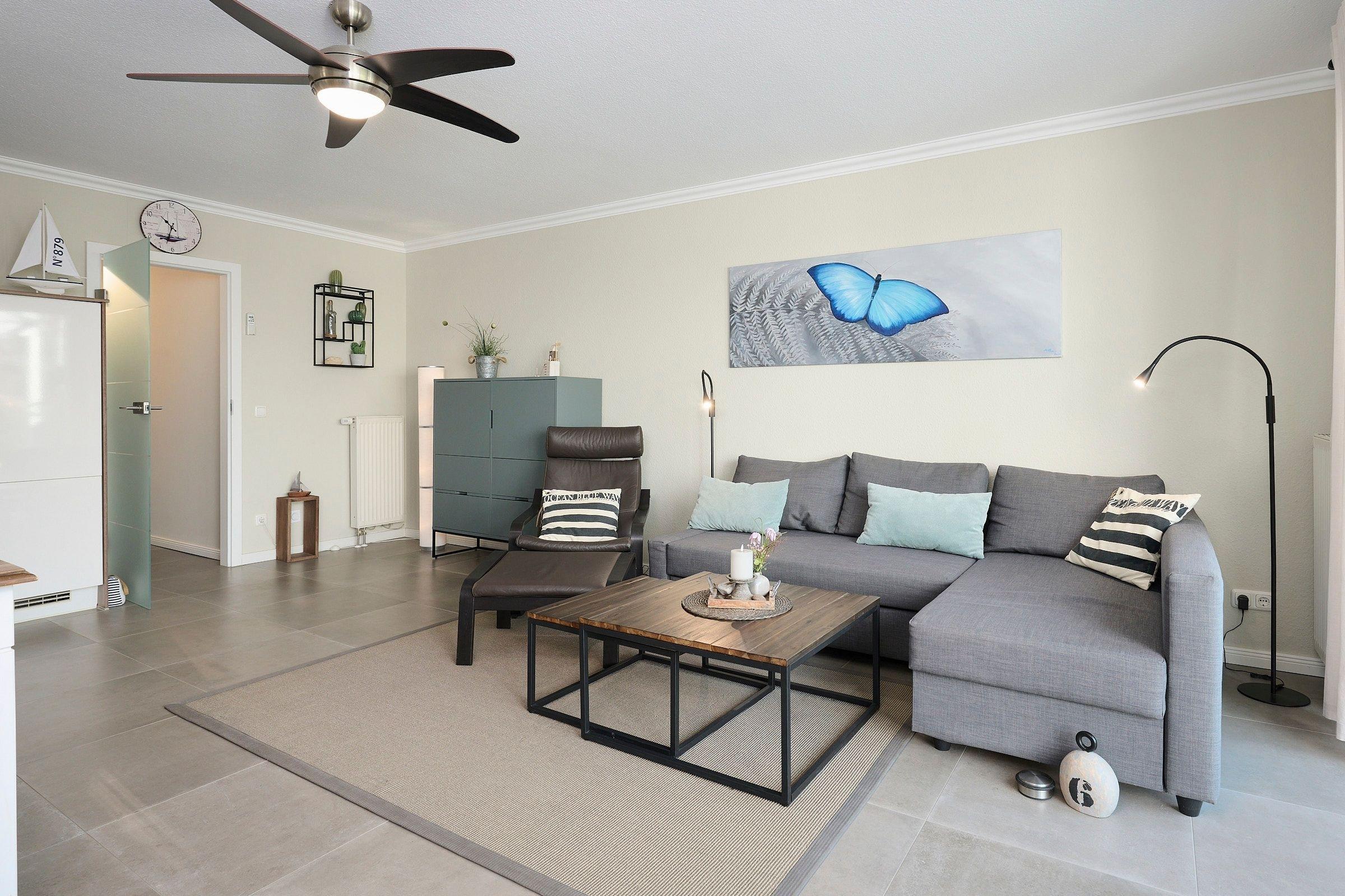 Die 2-Zimmer-Ferienwohnung in Schönberg befindet sich im Erdgeschoss. Die Wohnfläche von ca. 61 m² verteilt sich auf ein Wohnzimmer mit Schlafcouch (ca. 140x180 cm) und offener Küche, ein Schlafzimmer mit Doppelbett (2x 90x200 cm) sowie ein Duschbad und ein Abstellraum.