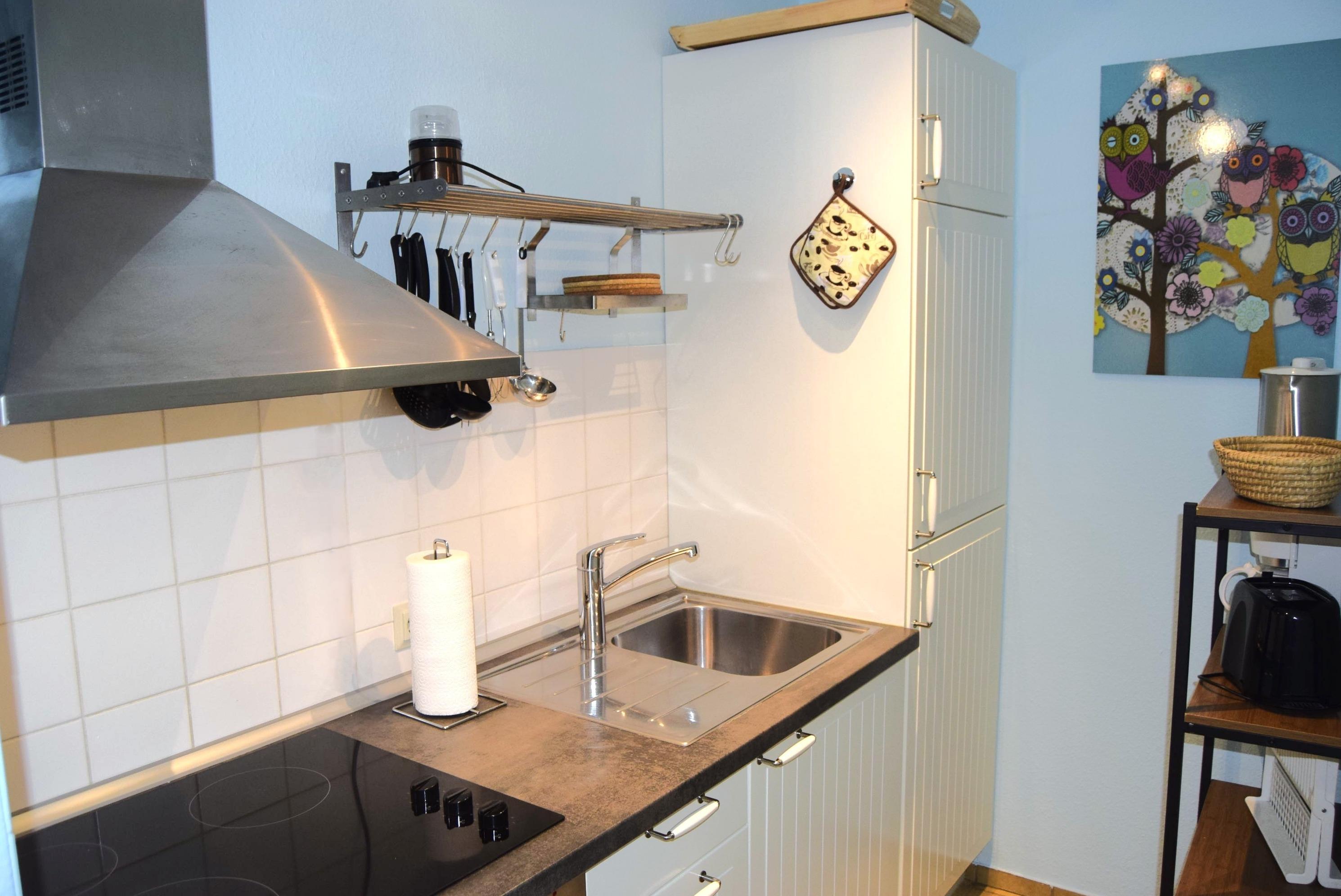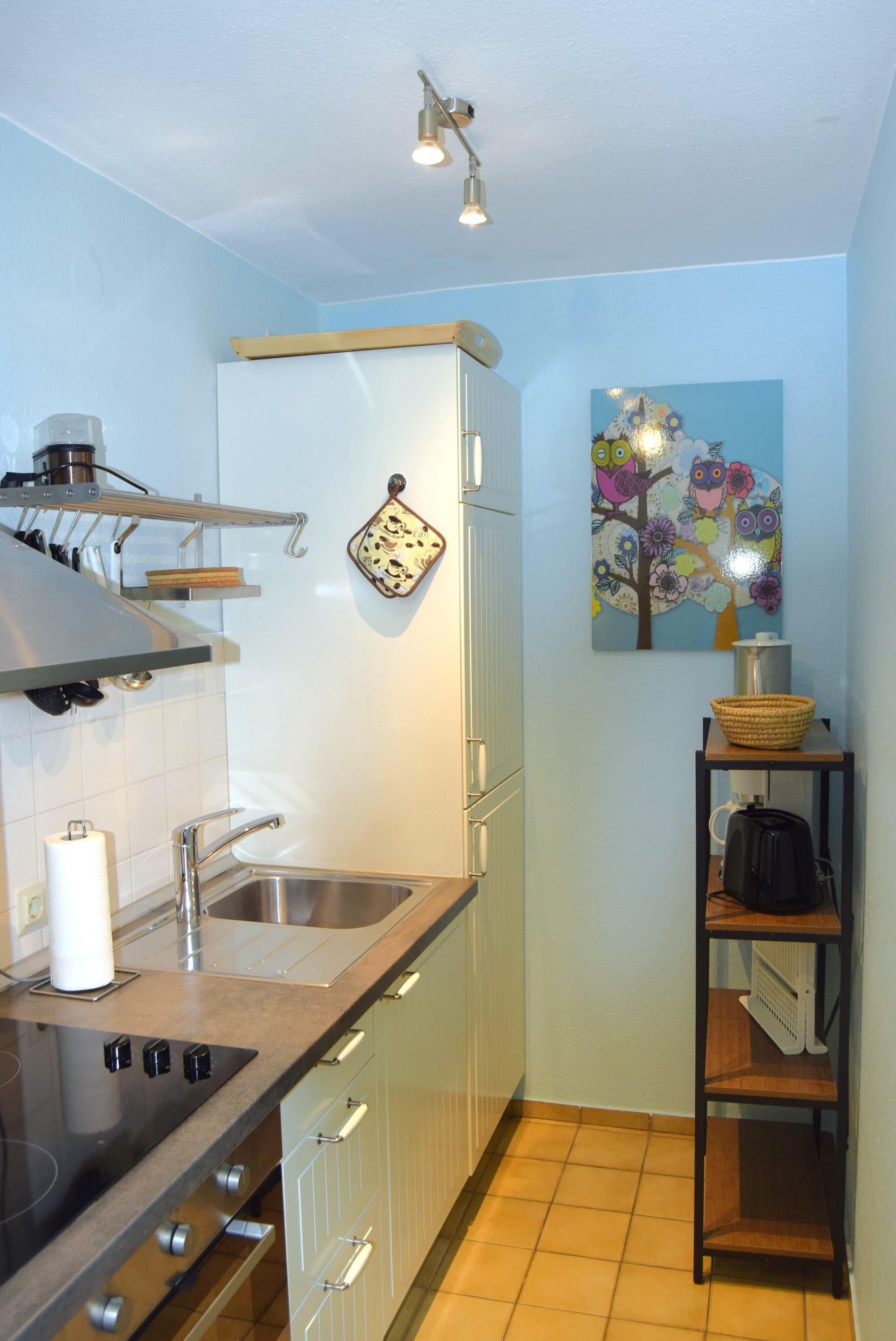 Die Küchenzeile liegt im Flurbereich und verfügt über einen Backofen, Toaster, Wasserkocher, Mikrowelle und natürlich ausreichend Geschirr und Besteck.