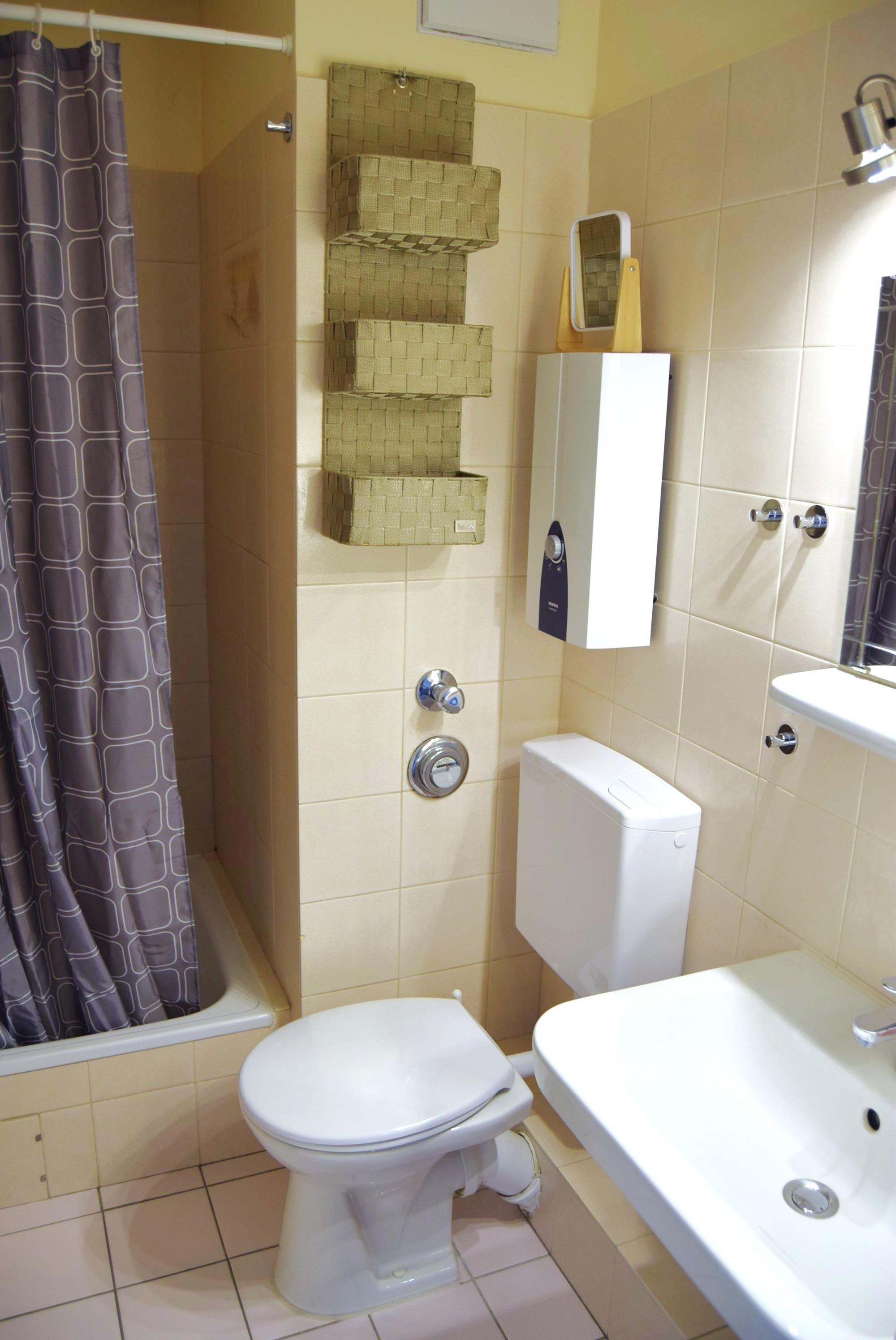 Sonnencreme und Zahnbürste finden im Bad mit Dusche und WC ihren Platz.