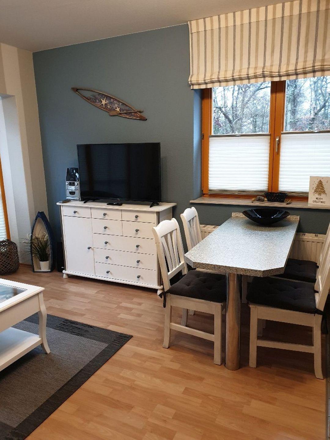 Das Wohnzimmer lädt zum Entspannen ein und bietet eine gemütliche Sitzgarnitur sowie einen Flachbild-Fernseher mit SAT-Empfang. Der Essbereich ist mit einem Esstisch und vier Stühlen ausgestattet, an dem Sie gemeinsame Mahlzeiten genießen können.