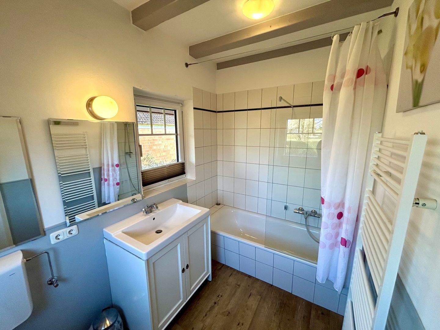 Im Erdgeschoss stehen Ihnen zwei Badezimmer zur Verfügung. Eines mit Badewanne, WC und Handtuchheizung und ein weiteres im Saunabereich mit WC, Dusche und ebenfalls einer Handtuchheizung.
