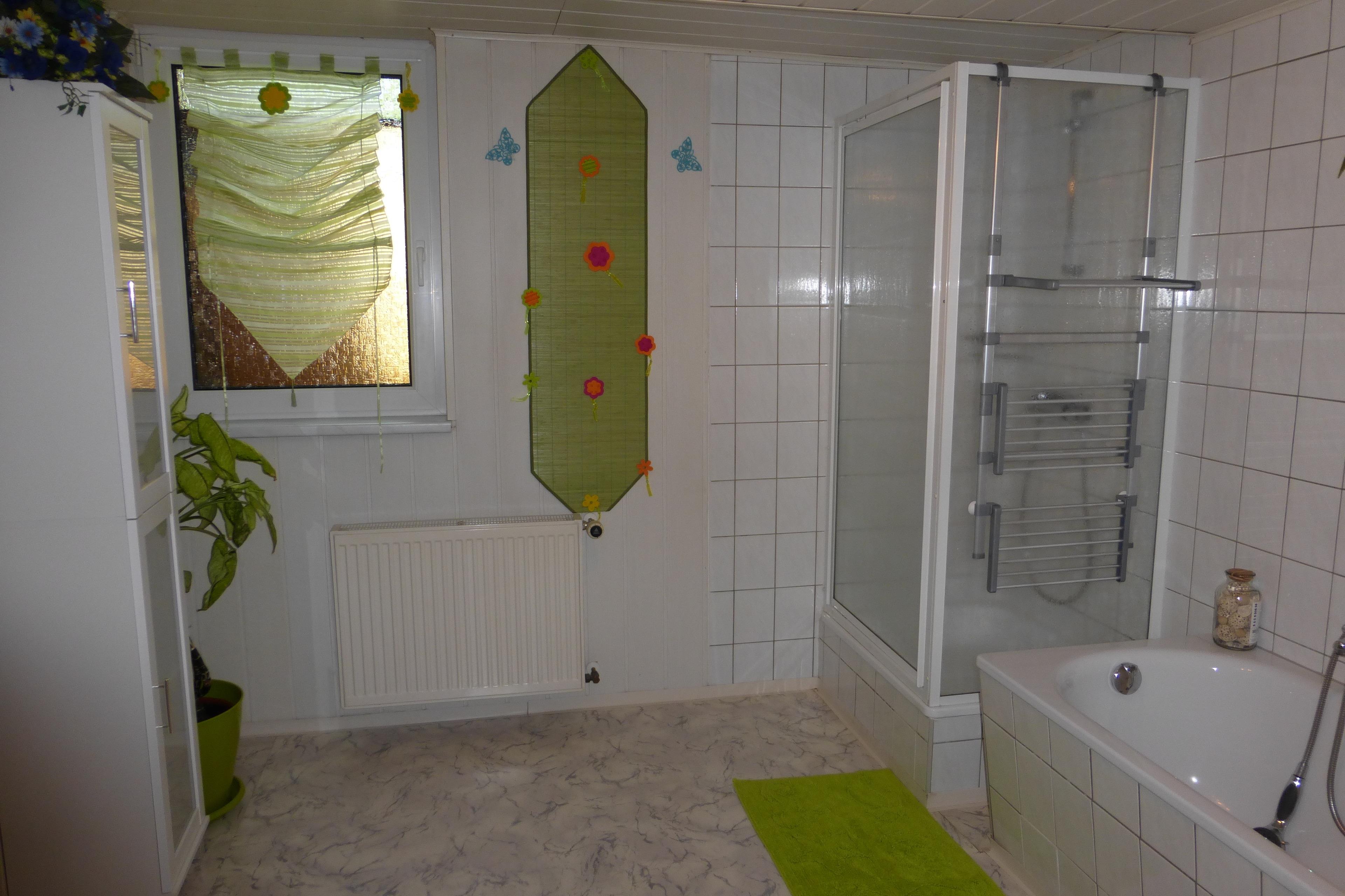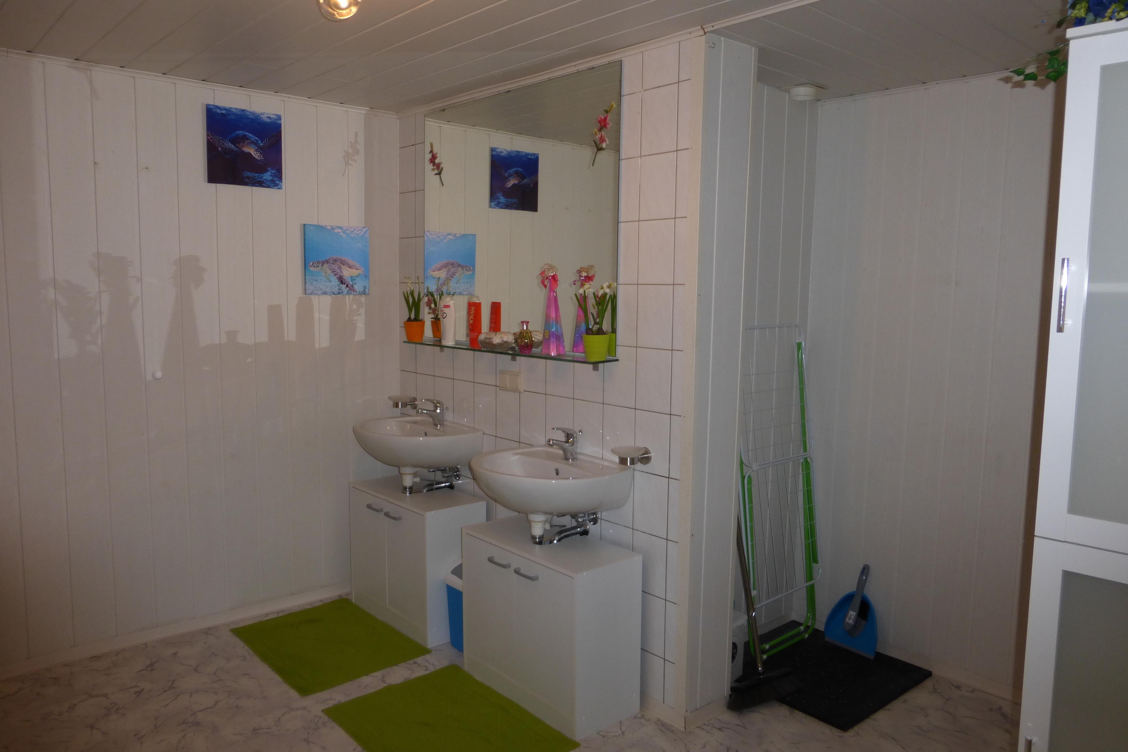 Im Bad haben Sie schließlich zwei! Waschbecken, eine Dusche und eine Badewanne. Auch ein großer Spiegel ist vorhanden.