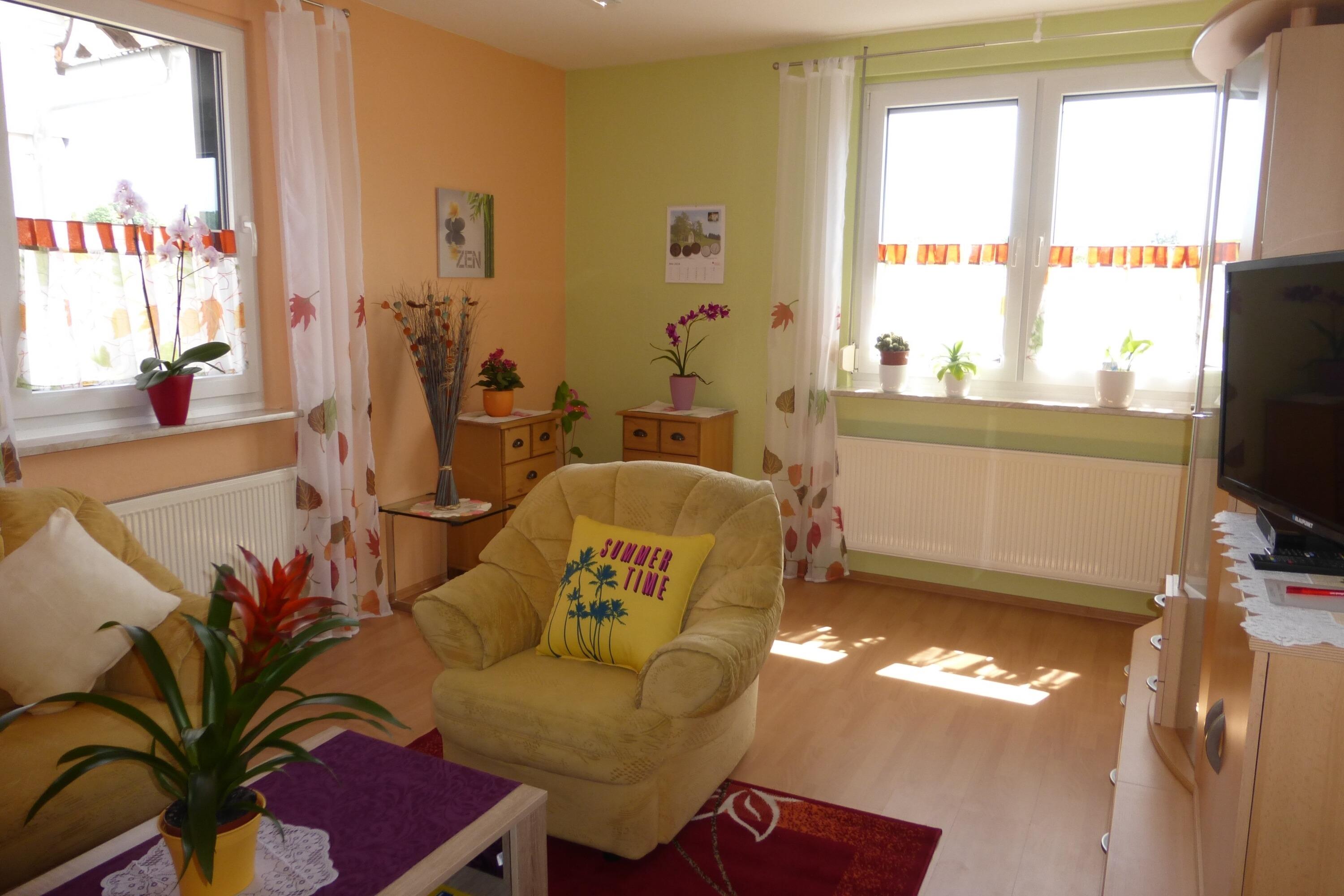 Im Wohnzimmer lädt eine Couch zum Relaxen ein. Hier finden Sie einen Fernseher (SAT), einen DVD-Player (Blu-ray) und auch eine kleine Stereoanlage mit CD, Cassette und USB-Anschluss.