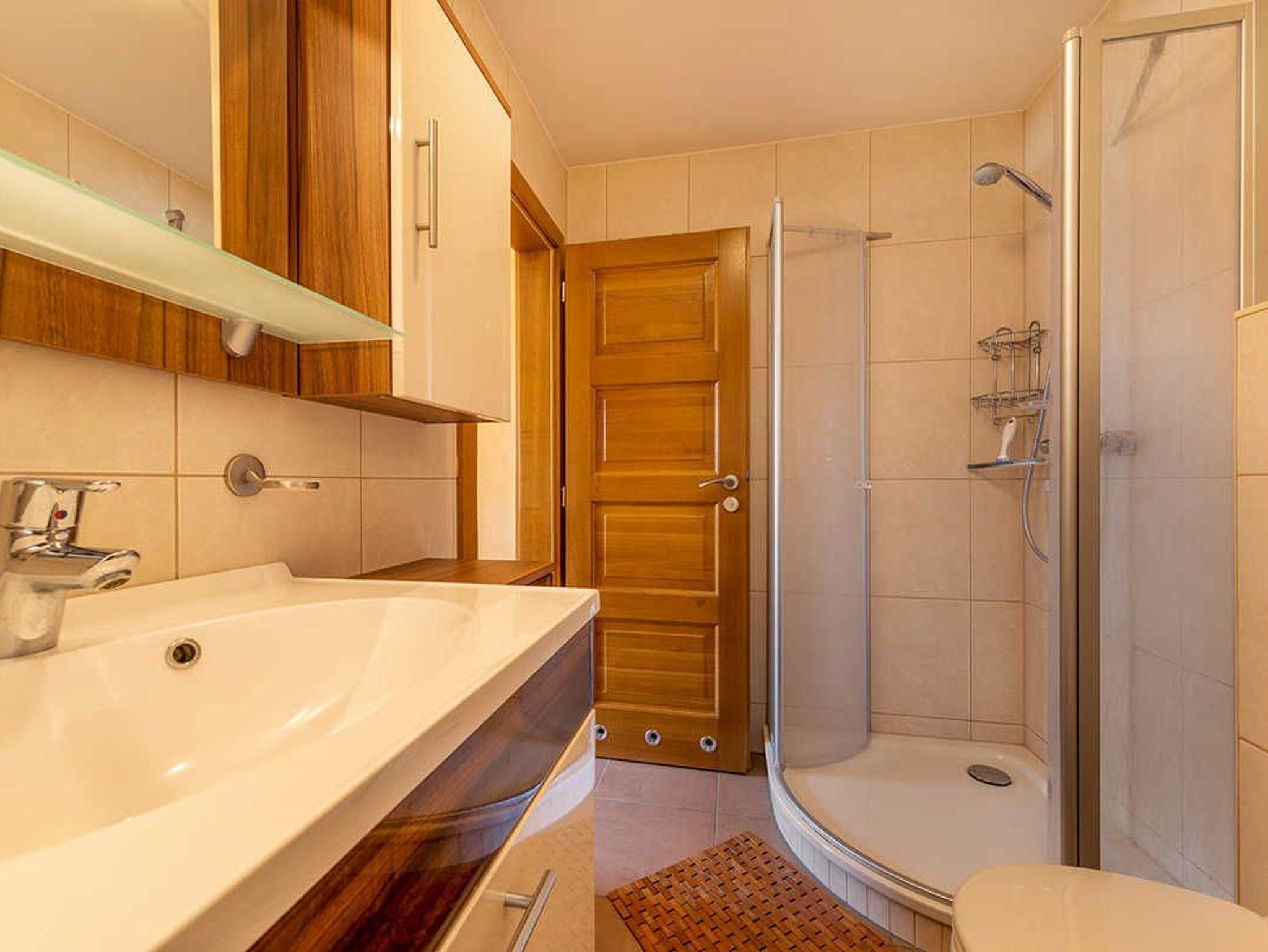 Das komplett verdunkelbare Schlafzimmer ist mit einem Doppelbett (1,40 m breit), einem Kleiderschrank und einem Regal ausgestattet. Direkt an das Schlafzimmer grenzt das Tageslichtbad, dieses ist mit Dusche / WC, Waschtisch und Fön ausgestattet.