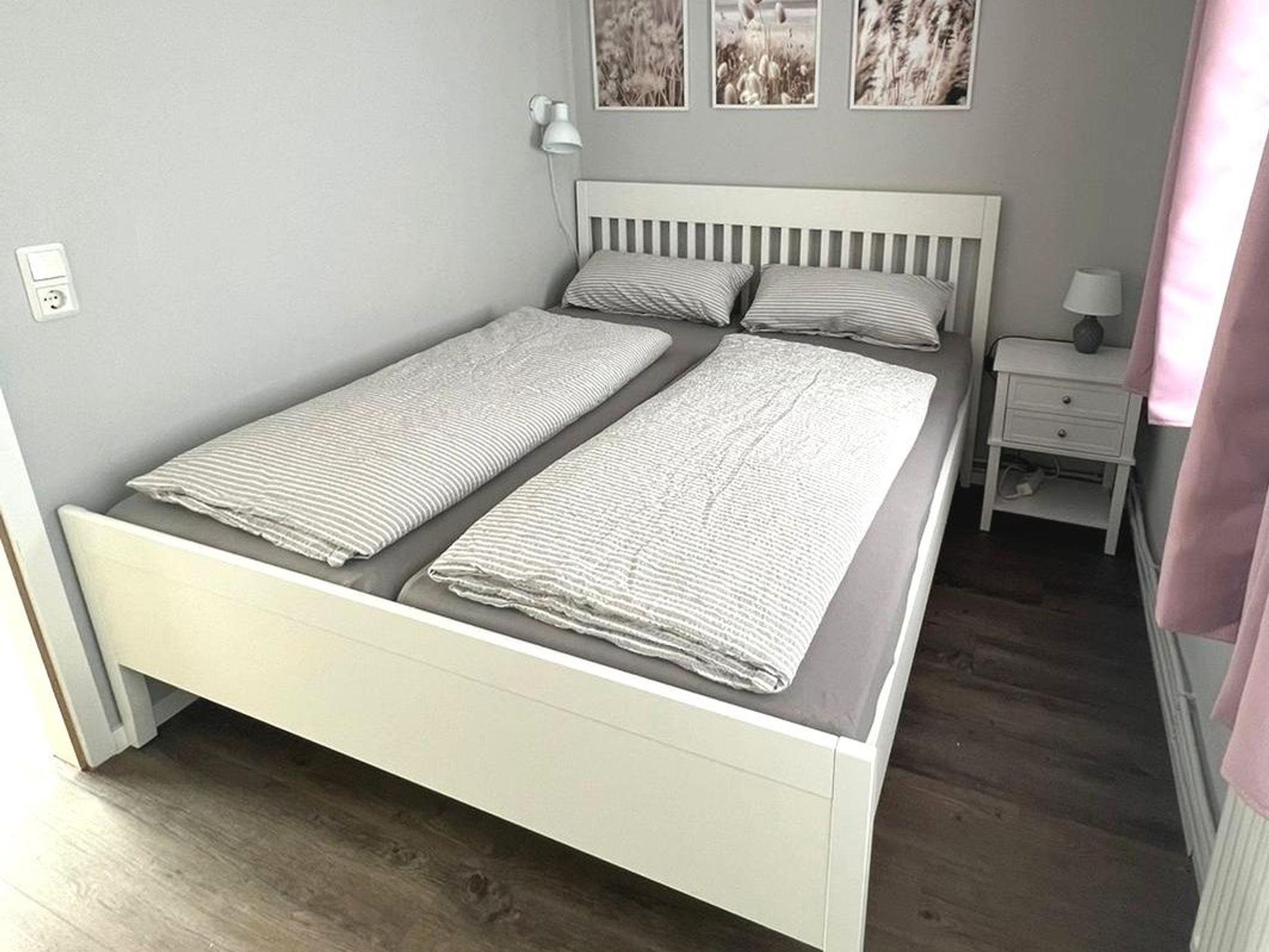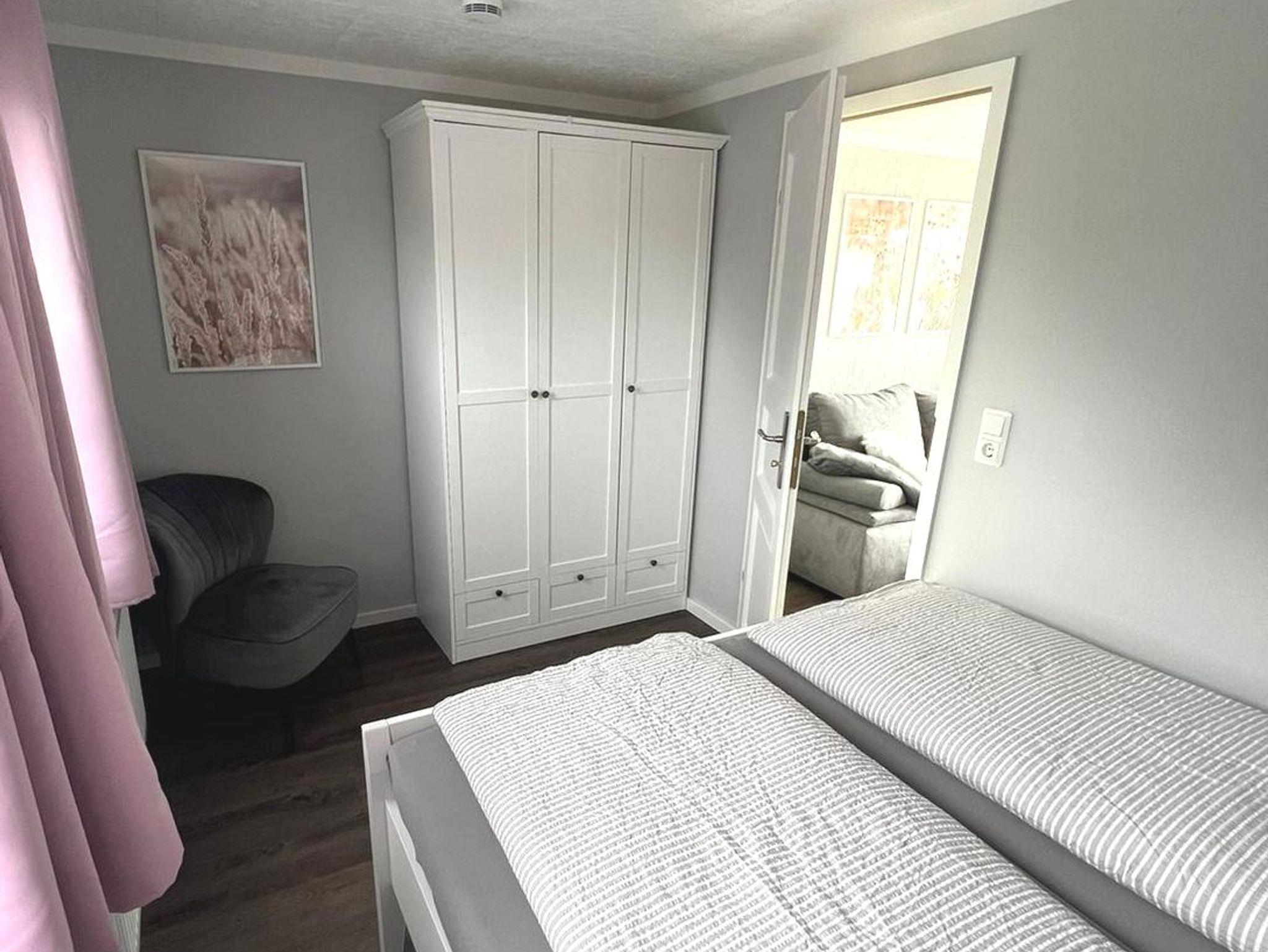 Die Wohnung Treibholz befindet sich im Boddenferienhaus und verfügt über ein Schlafzimmer mit Doppelbett, ein Wohnzimmer mit Schlafsofa, einer Einbauküche und ein Badezimmer mit Dusche.