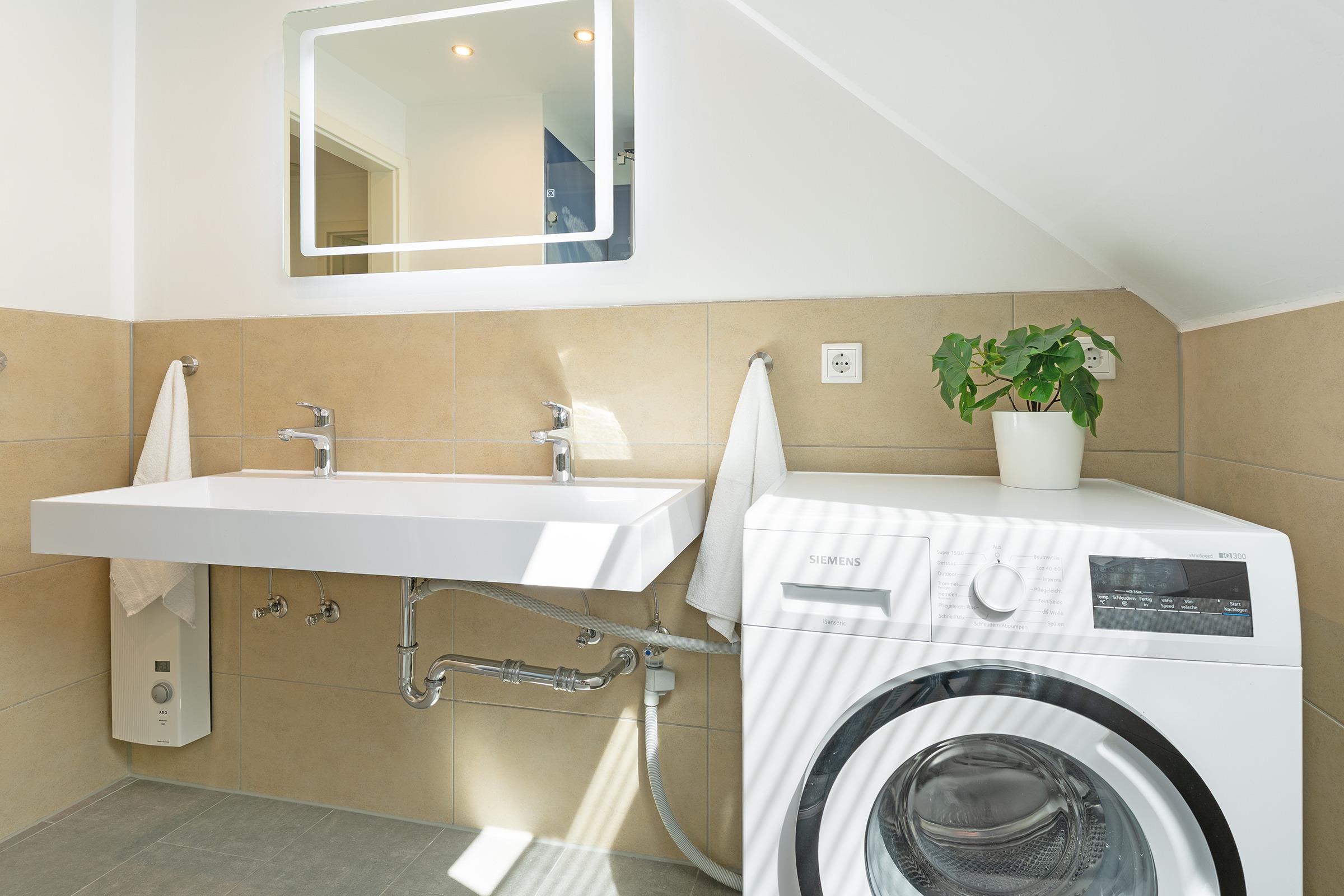 Das helle Tageslichtbad verfügt über Dusche mit Duschwanne und WC. Ein Gäste-WC ergänzt den Komfort. Für Familien stehen sowohl ein Kinderreisebett als auch ein Hochstuhl bereit.