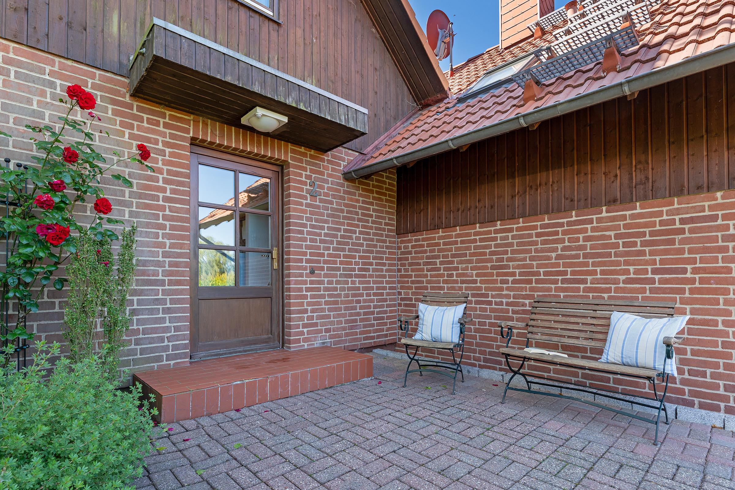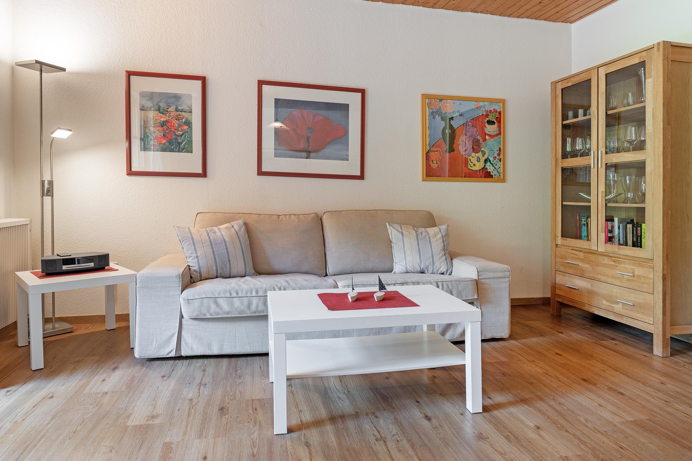 Das charmante Reihenhaus überzeugt mit einem gemütlichen Wohnbereich, der sich über das Erdgeschoss und das erste Obergeschoss verteilt. Liebevolle Details wie nostalgische Sprossenfenster, sichtbare Holzbalken und eine warme Holzdecke schaffen eine behagliche Atmosphäre. Ein Fernseher bietet Unterhaltung, der Kaminofen steht aus Sicherheitsgründen nicht zur Nutzung bereit. Vom Wohnbereich gelangen Sie direkt auf die möblierte Terrasse – perfekt für entspannte Stunden im Freien. Der überdachte Balkon im Obergeschoss lädt ebenfalls zum Verweilen ein.
