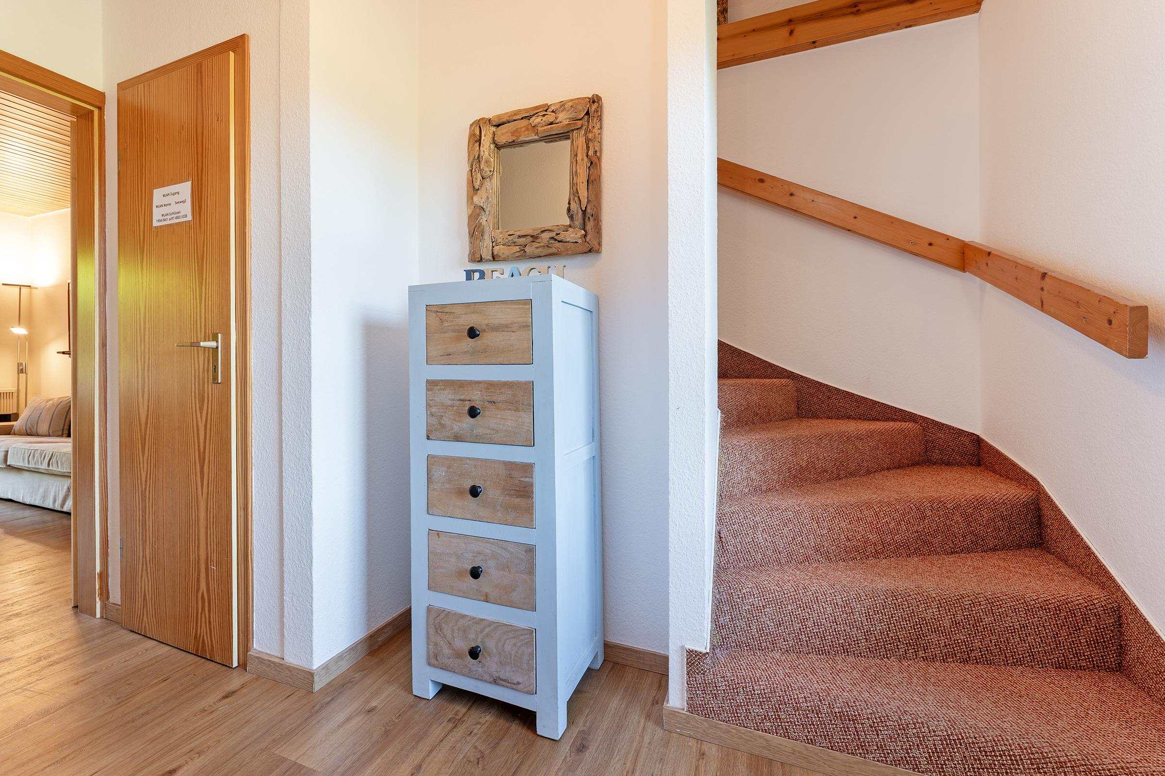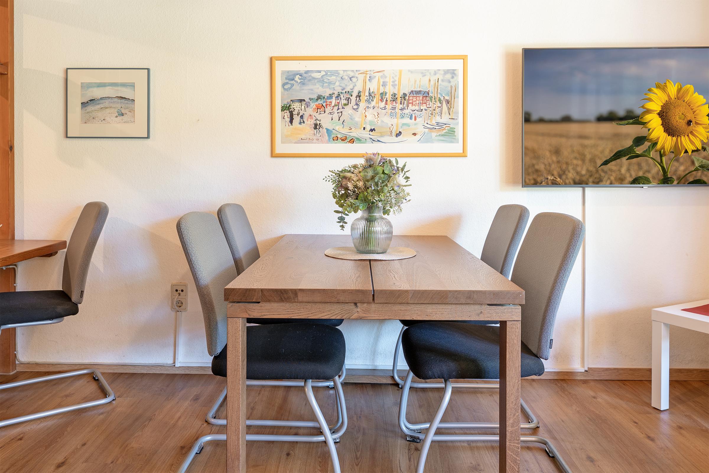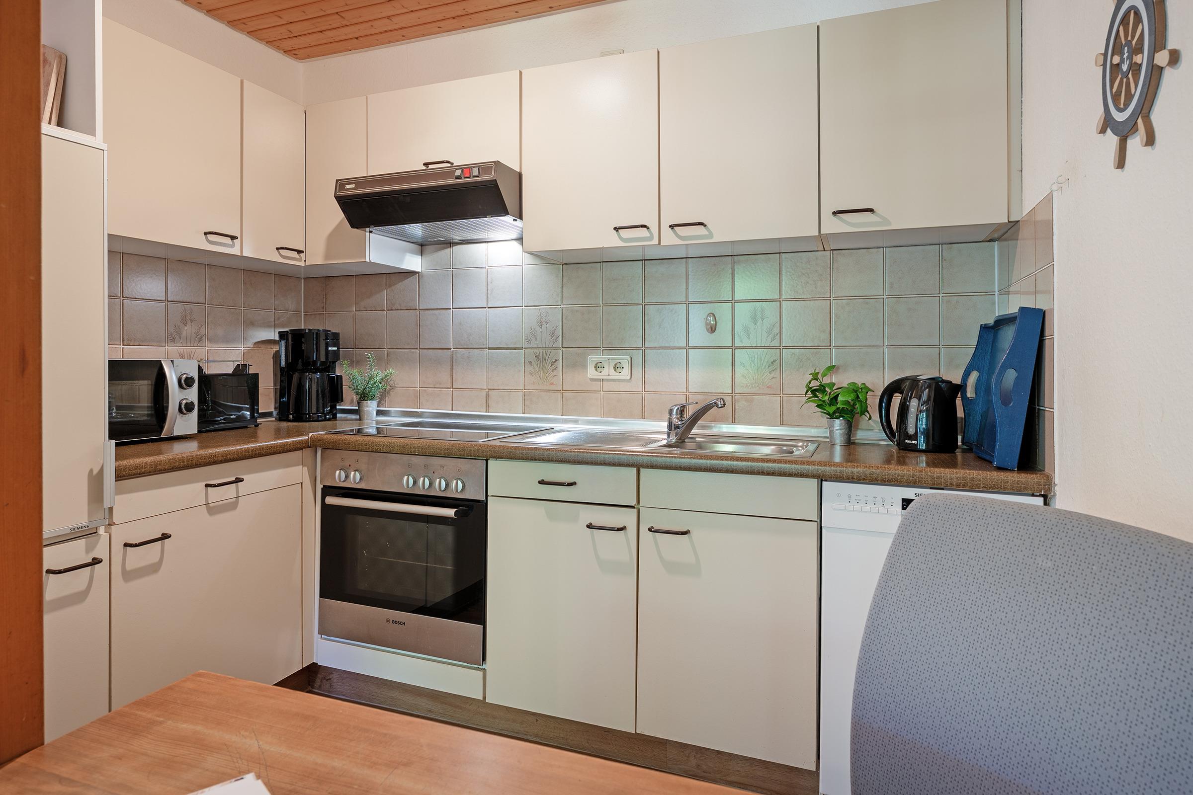 Die Küche ist umfangreich ausgestattet mit Backofen, Mikrowelle, Kaffeemaschine, Geschirrspüler und Ceran-Kochfeld. Der angrenzende Essbereich bietet ausreichend Platz für gemeinsame Mahlzeiten. Zwei Schlafzimmer im ersten Obergeschoss bieten Rückzugsorte für erholsame Nächte.