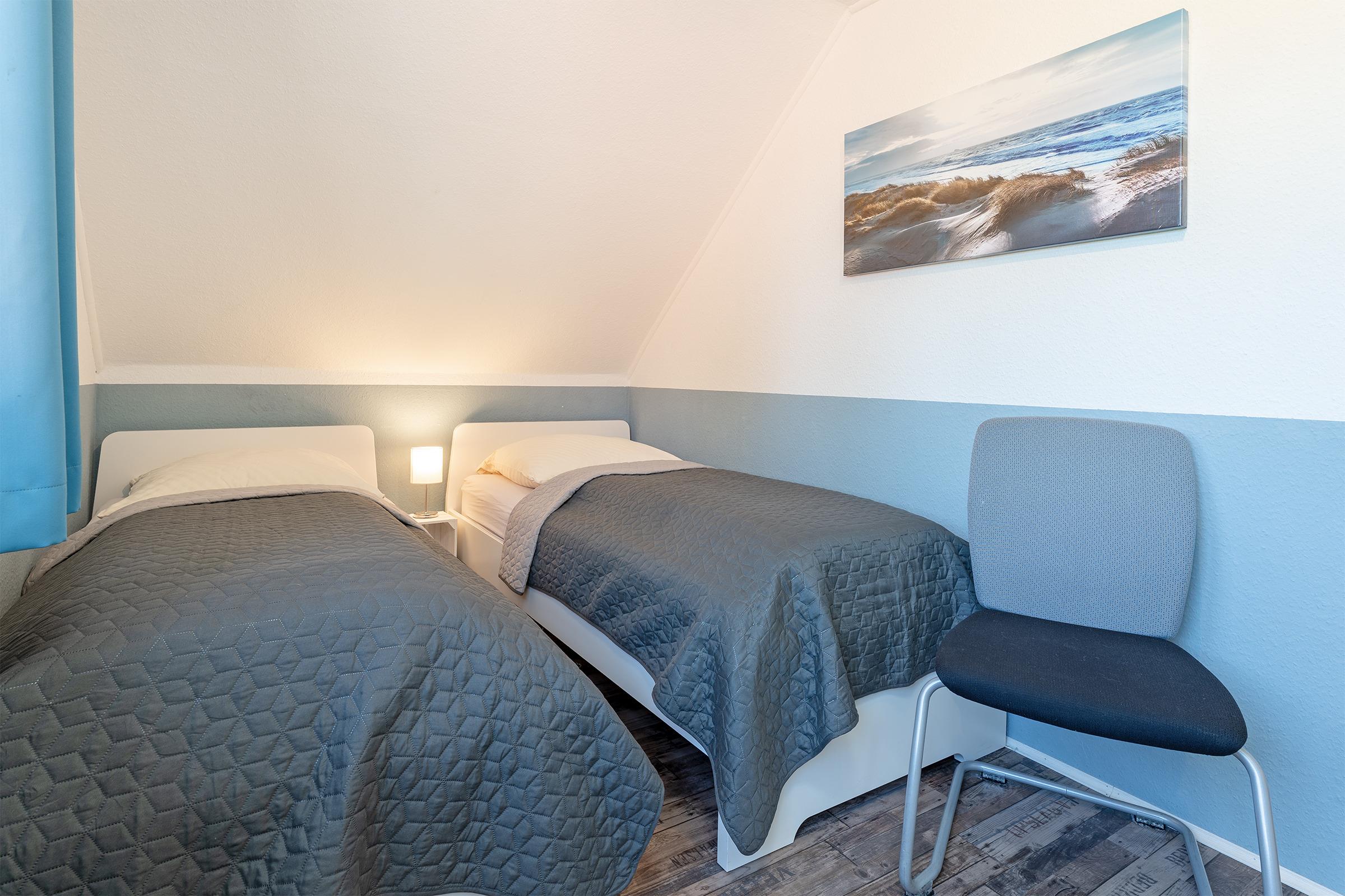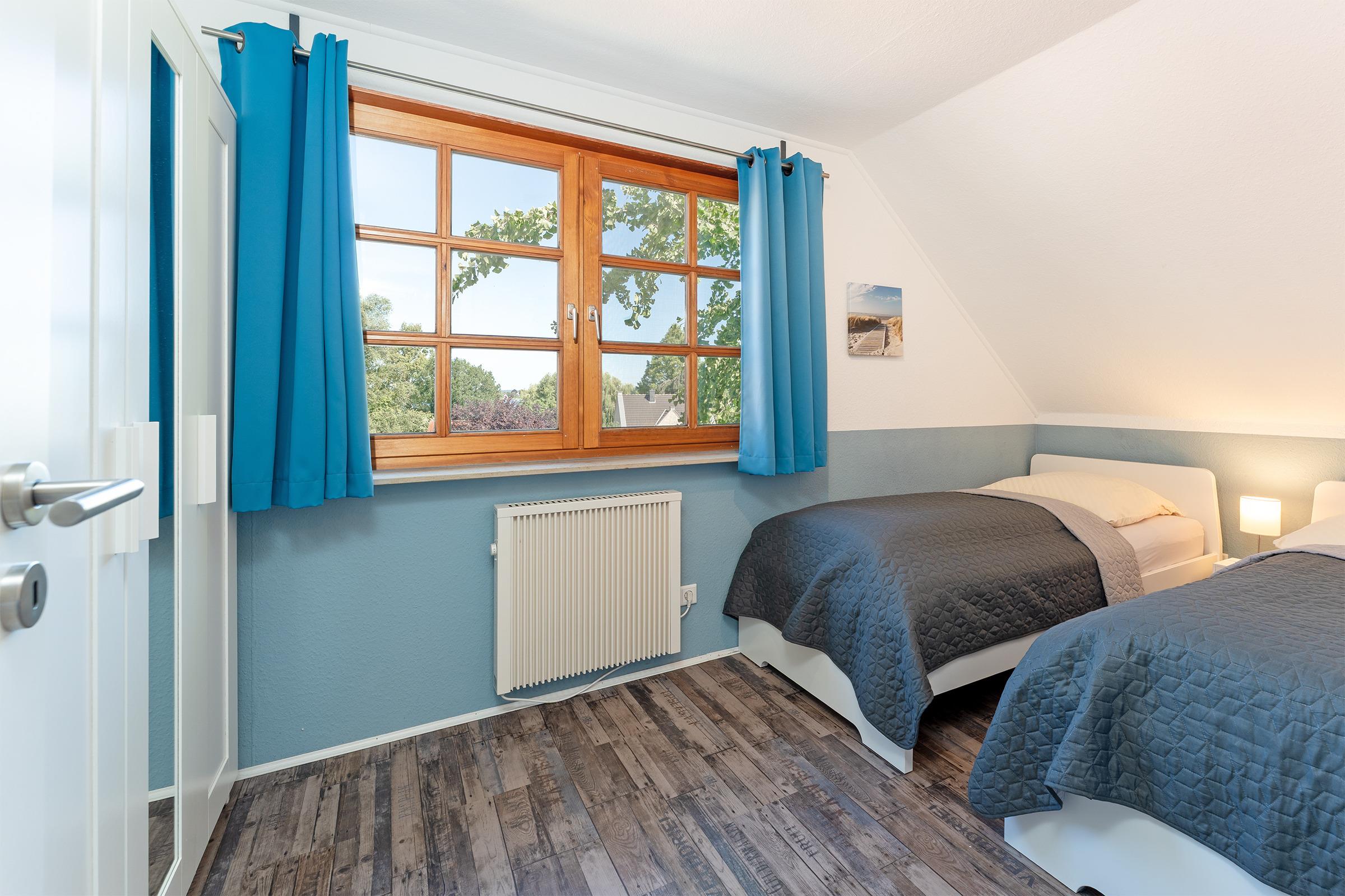 Schlafzimmer 2: 2 Einzelbetten (ja 90x200 cm), Kleiderschrank, Verdunkelung: lichtundurchlässiger Vorhang, kein Platz für ein Babybett