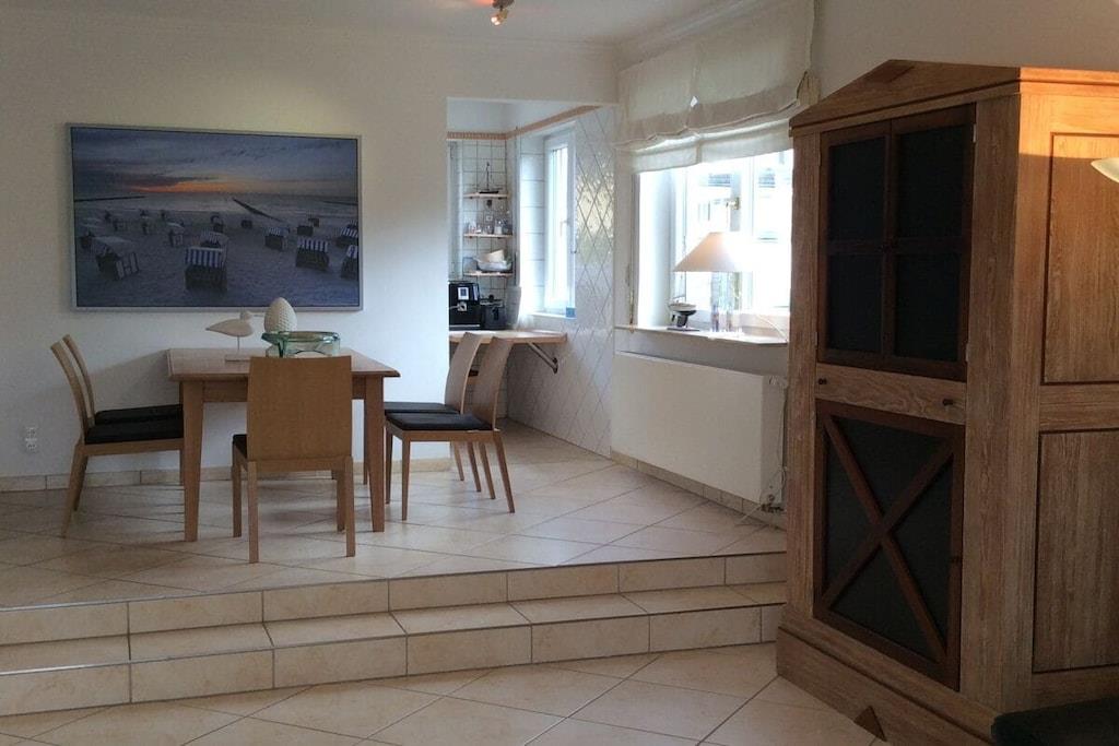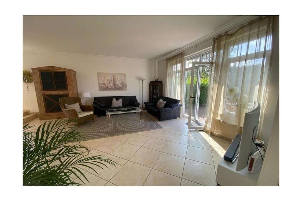 Es erwartet Sie eine charmante ruhig gelegene Ferienwohnung - sonnig im EG 120qm, großzügiger Wohnraum mit Essbereich und Fliesenfußboden, 3 Schlafzimmer für 6 Personen und 2 Badezimmer und Süd-Sonnen-Terrasse. Optional kann auf Anfrage ein Zustellbett/Kinderreisebett hinzugestellt werden, sodass für 7 Personen Platz ist. Ausstattung: Couch- und Curved-Flat-TV-Ecke, Kamin, Diele, KFZ Stellplatz, Terrasse mit Garten, Waschmaschine , elektrische Markise, Rolläden, komplett ausgestattete Küche mit Cerankochfeld, Backofen, Mikrowelle, Toaster Kühl- & Gefrierschrank, Kafeemaschine und Spülmaschine. Im ruhigen Garten stehen Ihnen Liegen für entspannte Urlaubsstunden in der Sonne zur Verfügung. Die große süd-west Terrasse mit Esstisch für 8 Personen eignet sich ideal für ein ausgiebiges Frühstück, Grillabend oder ruhige Stunden im Liegestuhl. Sollten sie mehr als 7 Tage in der Unterkunft verbleiben, steht Ihnen ein Bettwäschewechsel als Sonderservice zur Verfügung. Sollten Sie keinen Bettwäschewechsel in den 14 Tagen wünschen, erhalten Sie bei dem erstmaligen Wäschepaket eine Gutschrift. Für Tipps und Empfehlungen rund um Scharbeutz stehen wir Ihnen gerne zur Verfügung. Wir freuen uns, Sie bald bei uns begrüßen zu dürfen.