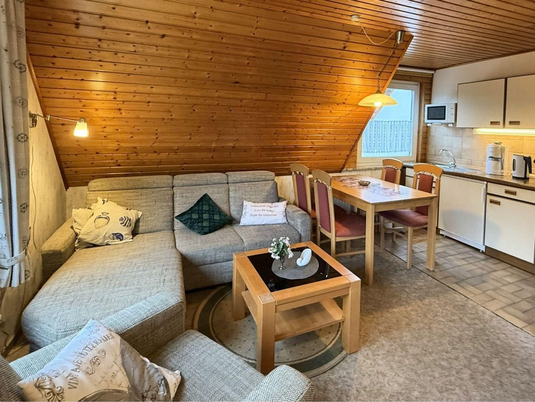 Die Wohnung liegt in der 1. Etage mit wunderschönem Ausblick ins Grüne. Sie besteht aus 2 Zimmern (Wohn-/Schlafraum und Kinderzimmer), Duschbad mit WC und Flur. Die Küchenzeile ist integriert. Eine Terrasse befindet sich im Garten.
