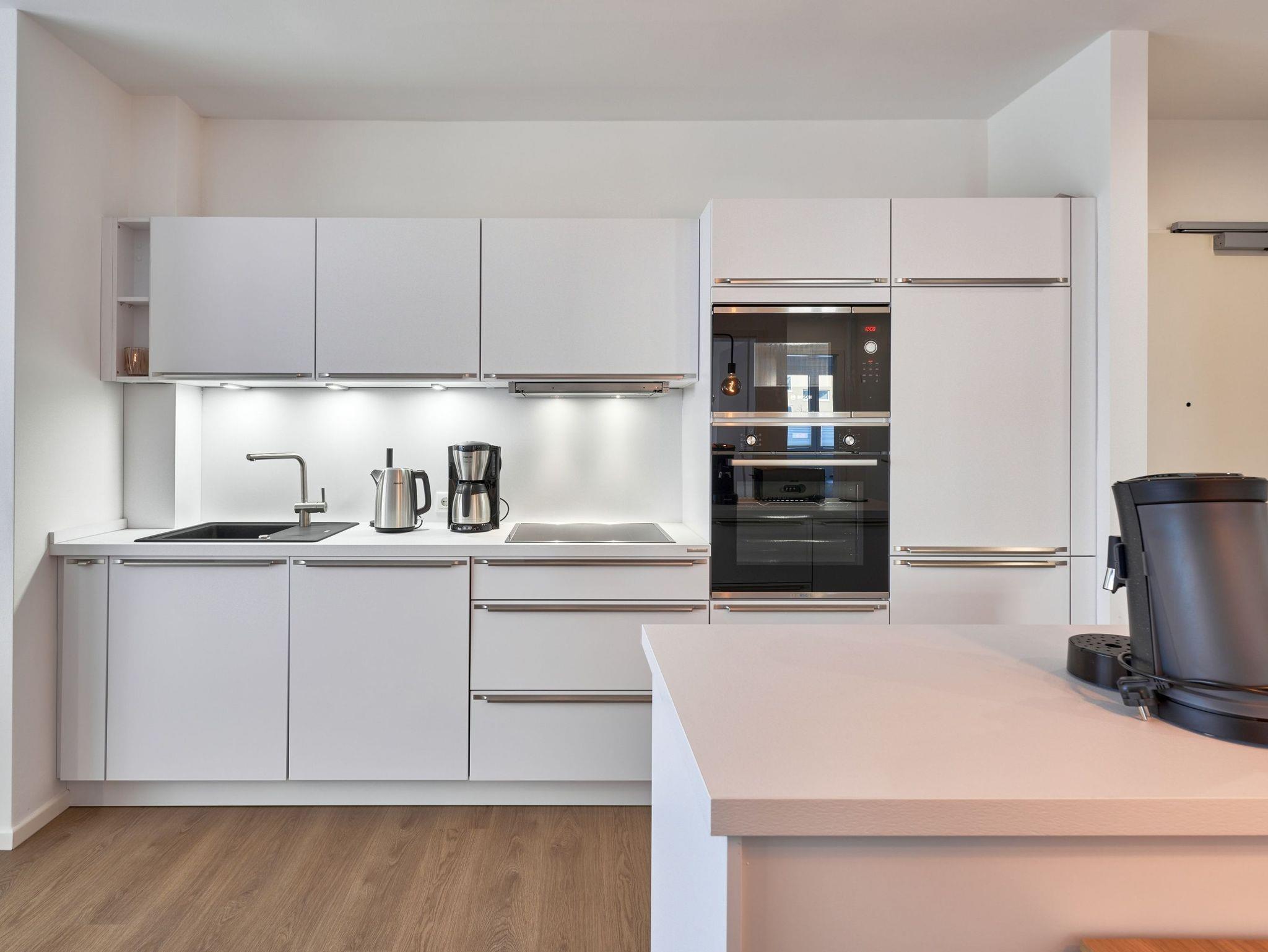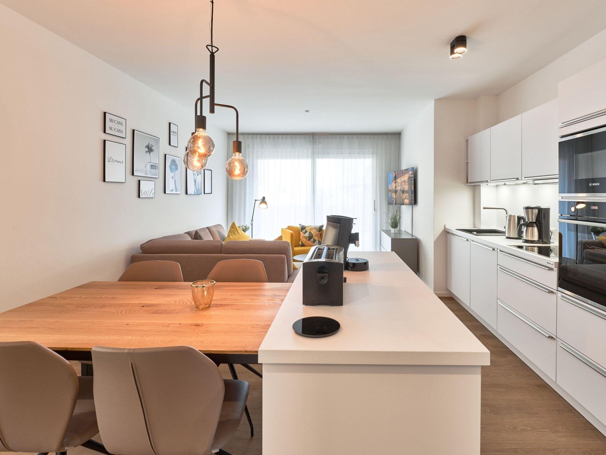 3-Zimmer, 65 qm, im Erdgeschoss, mit Terrasse. Diese feine Wohnung zeichnet sich durch eine moderne sowie gemütliche Inneneinrichtung aus. Die Küche ist mit hochwertigen Einbaugeräten und allen notwendigen Küchenutensilien ausgestattet. Neben einer Kaffeemaschine steht Ihnen auch eine Senseo-Maschine zur Verfügung. Spülmaschine, Induktionsherd, Backofen, Mikrowelle und ergänzen dieAusstattung. Im Wohnzimmer erwarten Sie ein gemütliches Ecksofa, ein Smart-TV in 46 Zoll und Apple AIR Play. Für Ihr Entertainment und digitales Erleben nutzen Sie unbegrenztes Highspeed-WLAN. Der Essbereich bietet Ihnen Platz für 4 Personen.