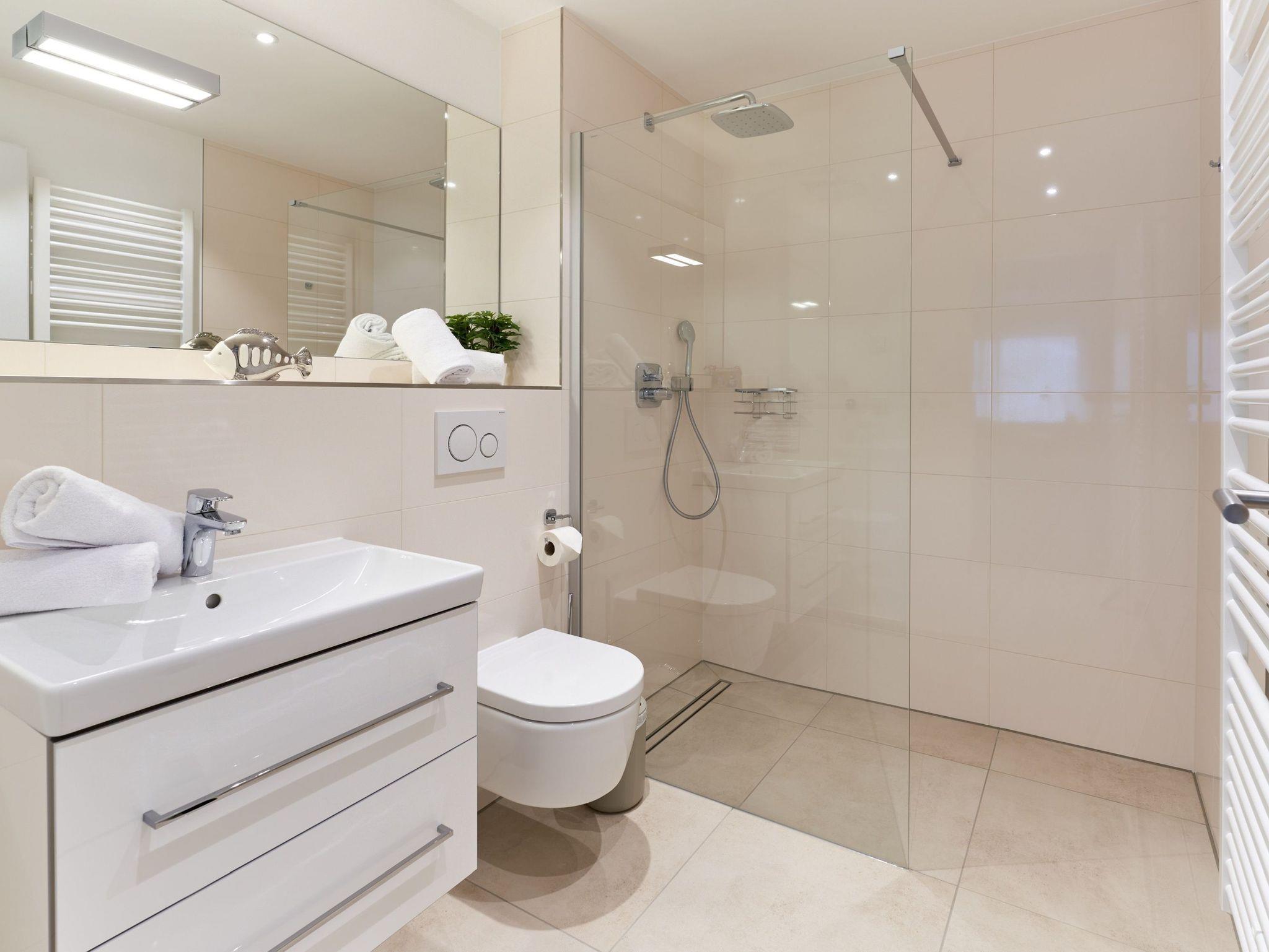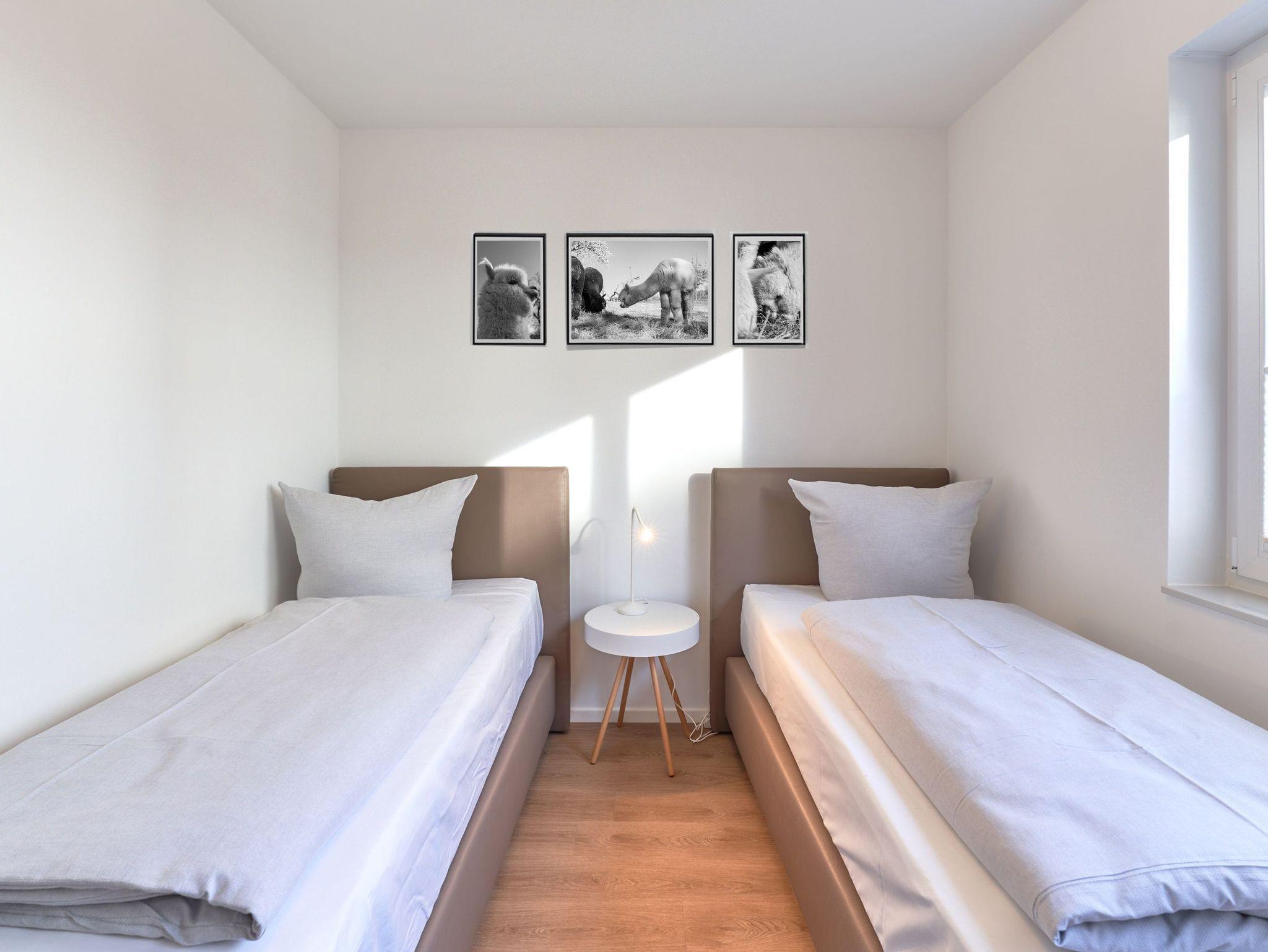 Das erste Schlafzimmer ist mit einem Boxspringbett (1,80m x2,00m), einem Smart-TV (43 Zoll) sowie einem Kleiderschrank ausgestattet. Im 2. Schlafzimmer befinden sich zwei Einzel-Boxspringbetten (100 × 200 cm) sowie ein 43-Zoll-TV. Alle Räume lassen sich durch Außenrollläden verdunkeln. Das Duschbad ist mit einem Handtuchheizkörper und einer bodengleichen Dusche ausgestattet. Kosmetikspiegel und Haartrockner sind hier selbstverständlich vorhanden.