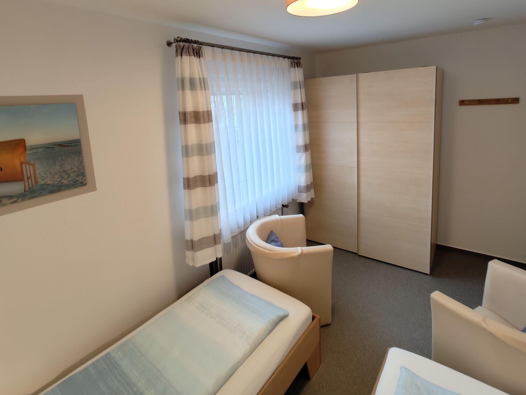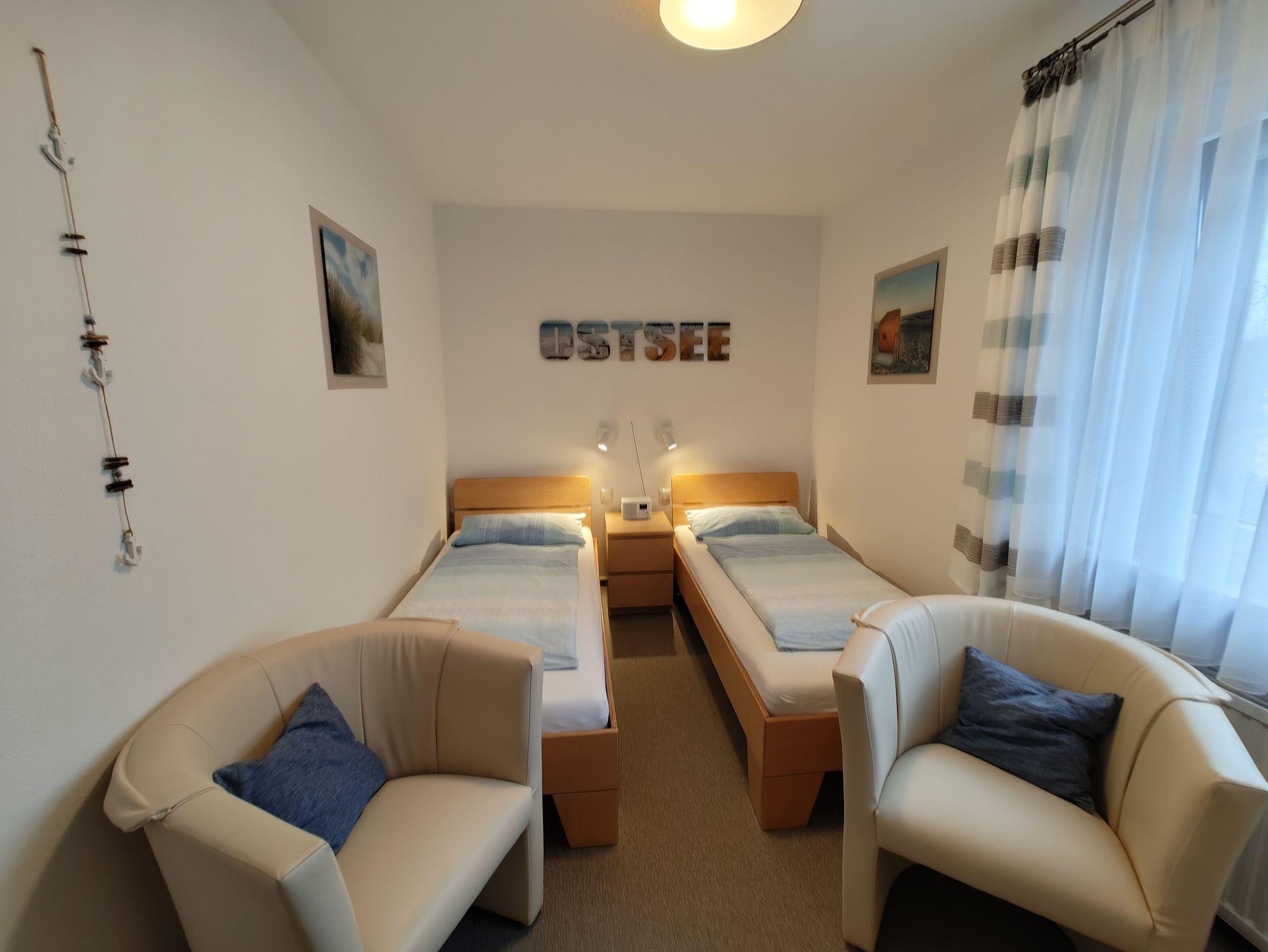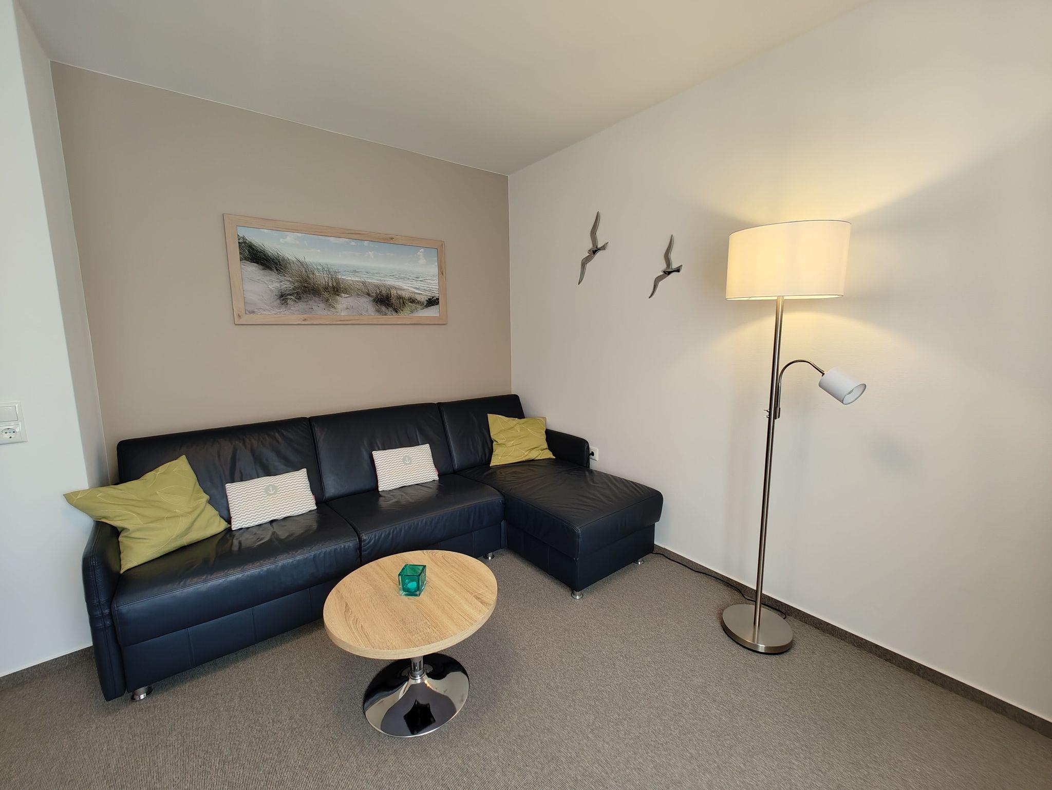 Im modernen Wohn-Schlafraum befinden sich ein Schlafsofa (Leder, 1,40 x 1,90 m), ein 32 Zoll großes Flachbild-TV (Kabel) und ein Essplatz für 2 - 4 Personen. Für gemütliche Abende haben wir Bücher, DVD´s und Spiele für Groß und Klein bereitgestellt. Im Schlafzimmer sind 2 einzeln stehende Betten (je 0,90 x 2,00 m).