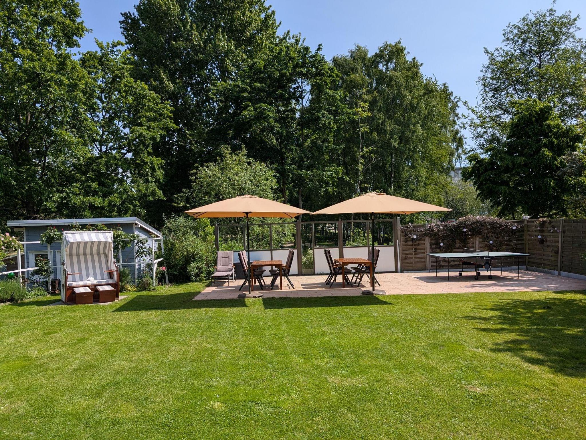 Unser großer Garten mit Liegewiese, Terrasse, Trampolin und Strandkorb lädt zum Relaxen, Spielen, Klönen, Tischtennis oder Grillen ein.