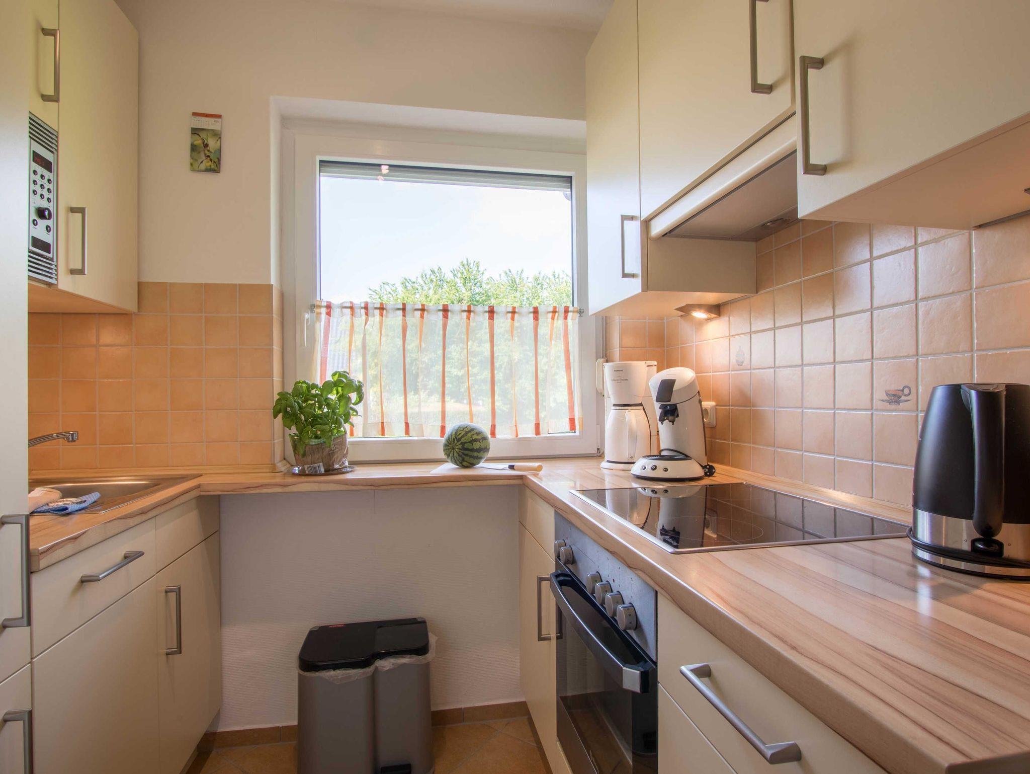 Die separate, komplett ausgestattete Küche verfügt neben Backofen, Mikrowelle und Spülmaschine auch über eine Senseo-Kaffeemaschine und im Kühlschrank ein Gefrierfach.