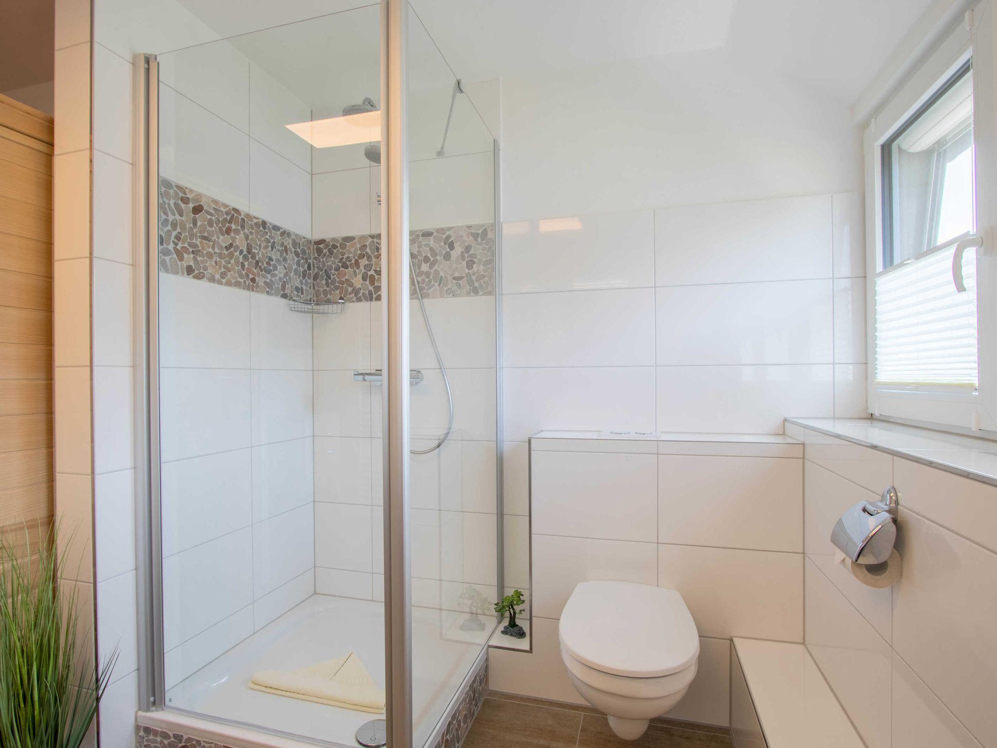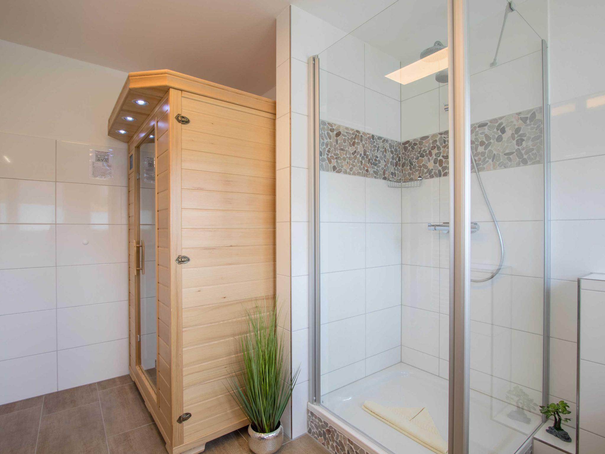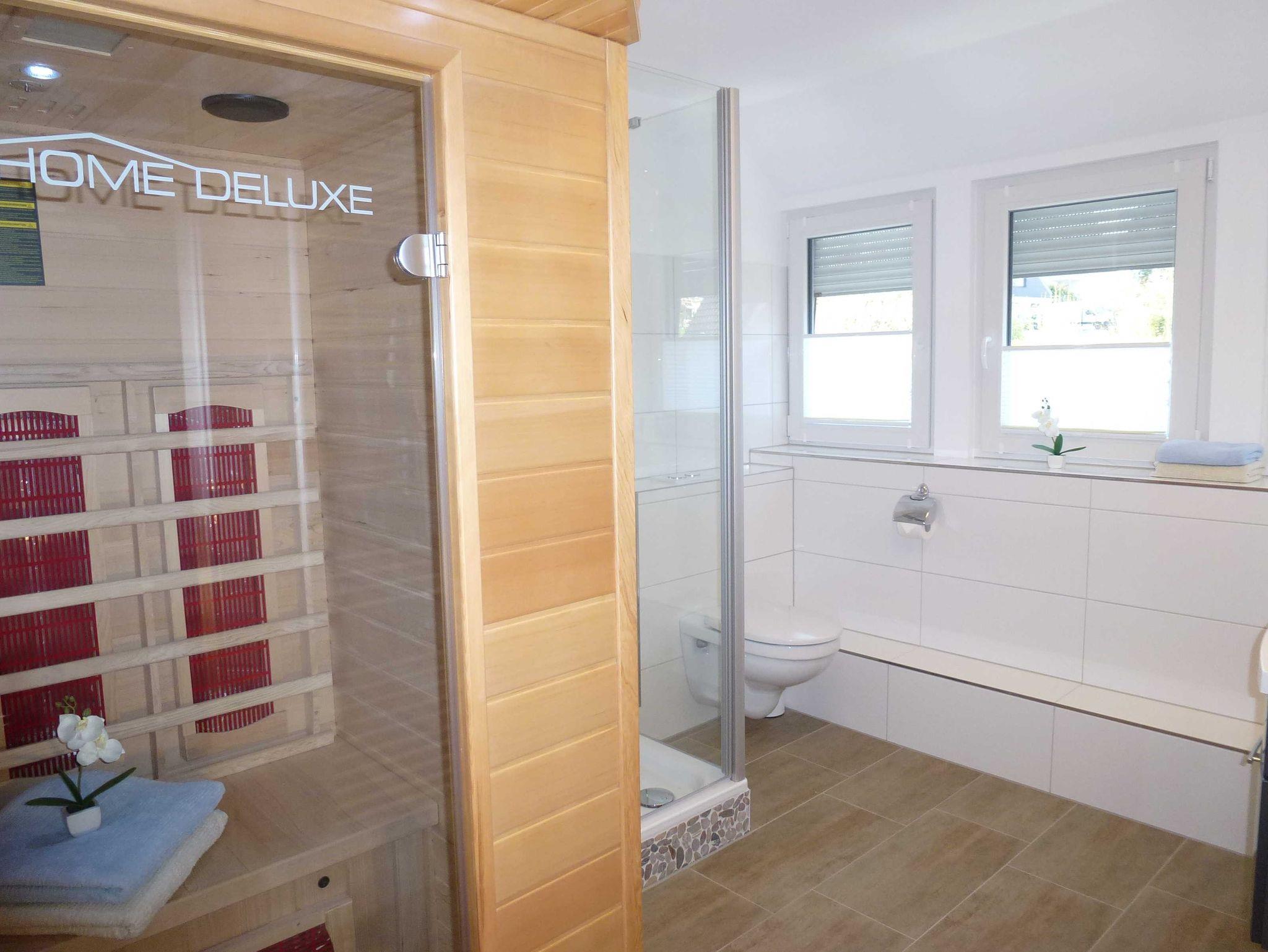 Die Ferienwohnung 2 ist mit Kabel-TV und einer Mikro-Hifi-Anlage ausgestattet. Für gemütliche Abende haben wir Bücher und Spiele für Groß und Klein bereitgestellt. In der Küche befindet sich neben Backofen und Mikrowelle auch eine Spülmaschine. Im Schlafzimmer stehen ein Doppelbett (1,80 x 2,00m) und ein zusätzlicher Flachbildfernseher mit 32 Zoll bereit. Die Fenster sind mit Außenrollos versehen und das modern gestaltete Bad verfügt über eine Infrarotsauna.