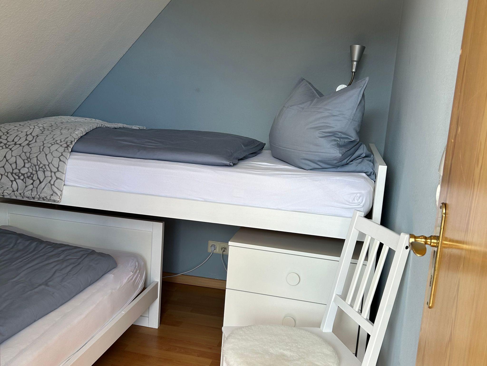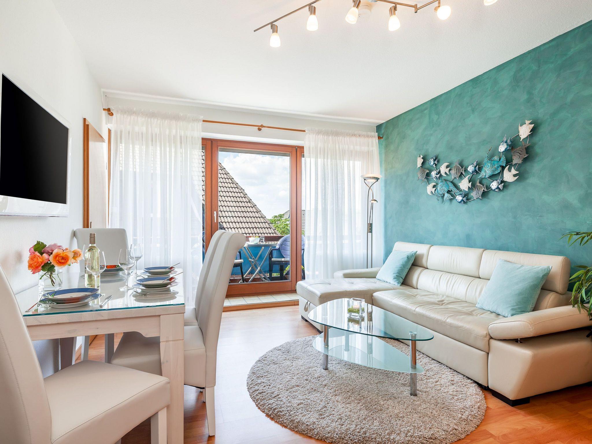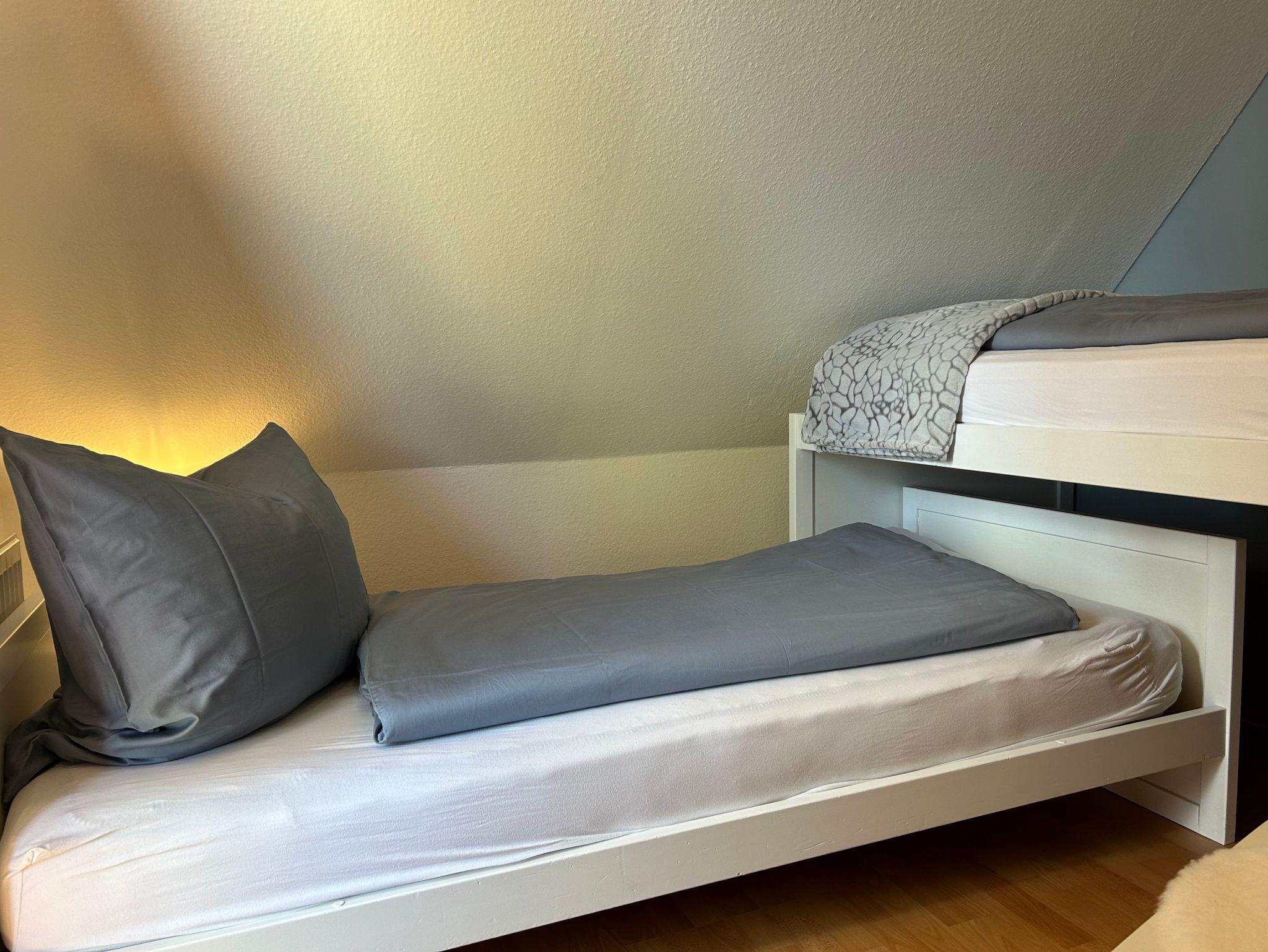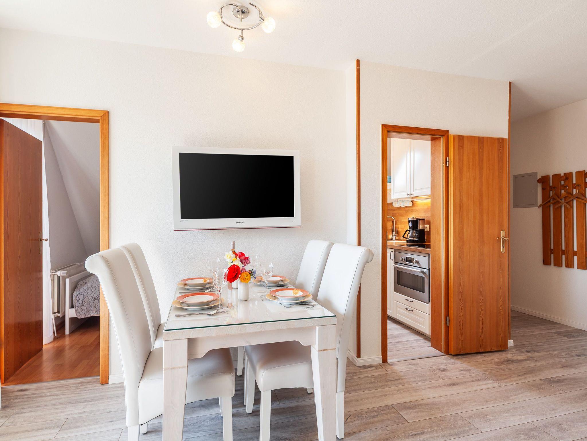 Die 50qm große Wohnung hat 3 Zimmer: ein Wohnzimmer mit Essplatz und separater komplett eingerichteter Küche, ein Schlafzimmer mit Doppelbett und ein Kinderzimmer mit 2 Einzelbetten, sowie ein komfortables Duschbad. Die Einzelbetten des Kinderzimmers sind grosszügig bemessen (90x200 cm), so dass in der Wohnung 4 reguläre Schlafplätze vorhanden sind. Auf Wunsch werden auch Kleinkinderbetten und Hochstuhl gestellt. Der Balkon mit Sitzgelegenheiten lädt zum Verweilen an frischer Luft ein. Die Einrichtung der Wohnung ist neu und komplett ausgestattet.