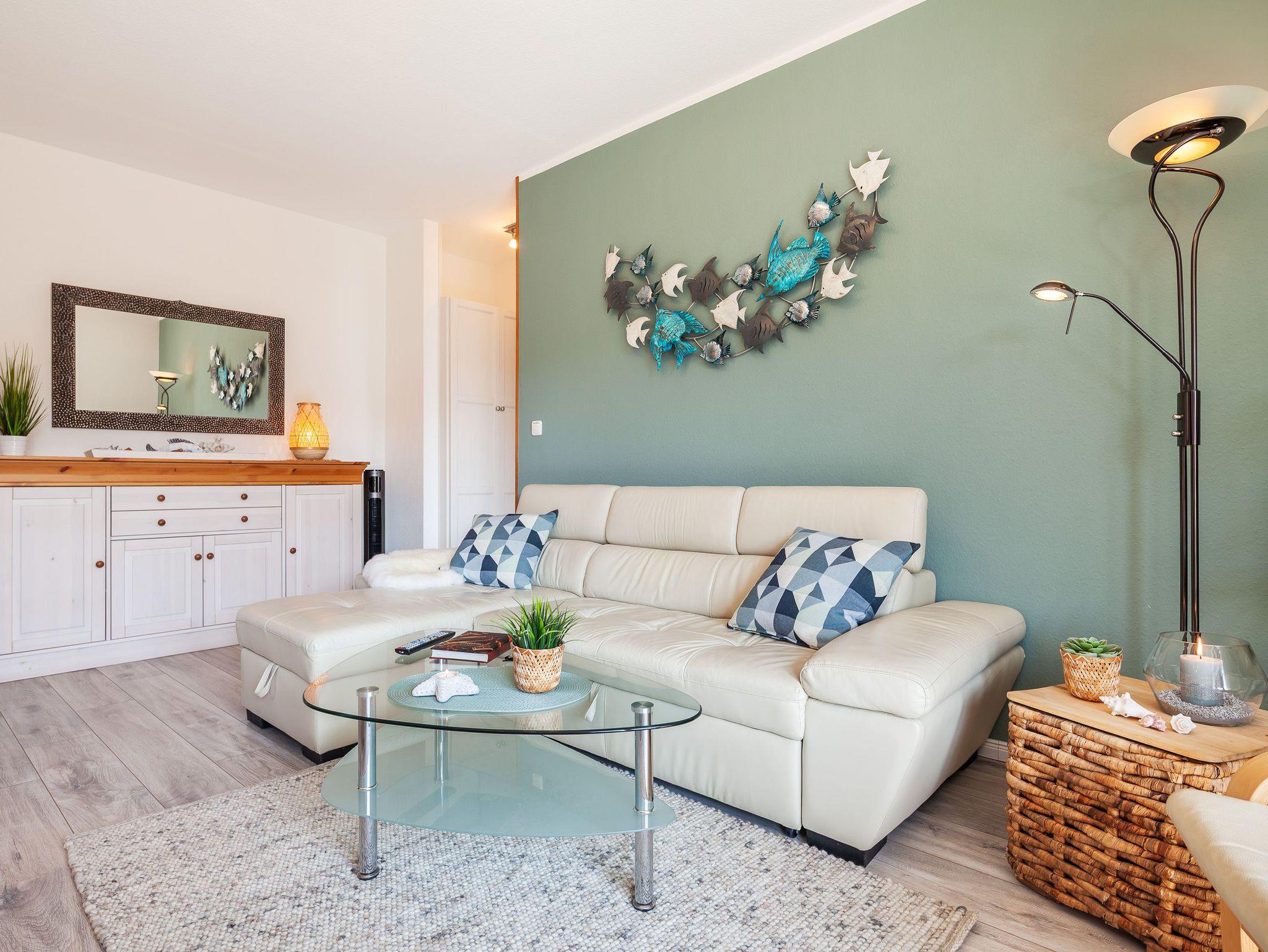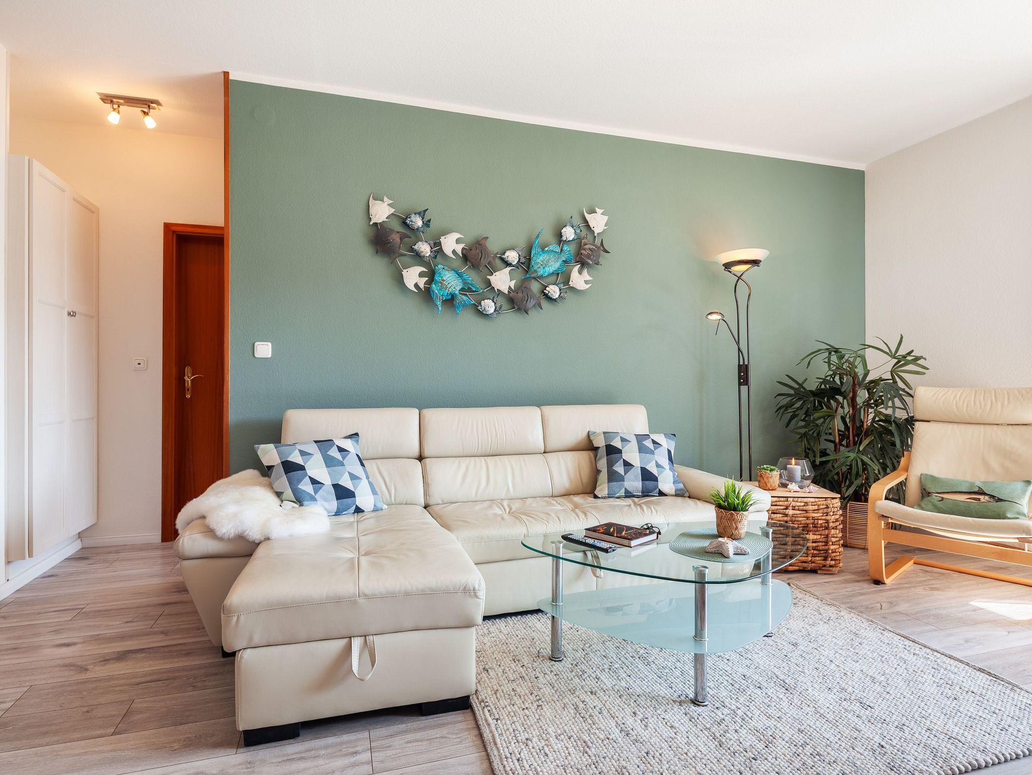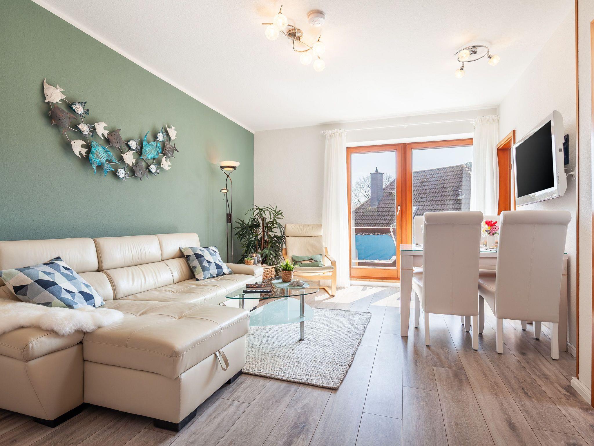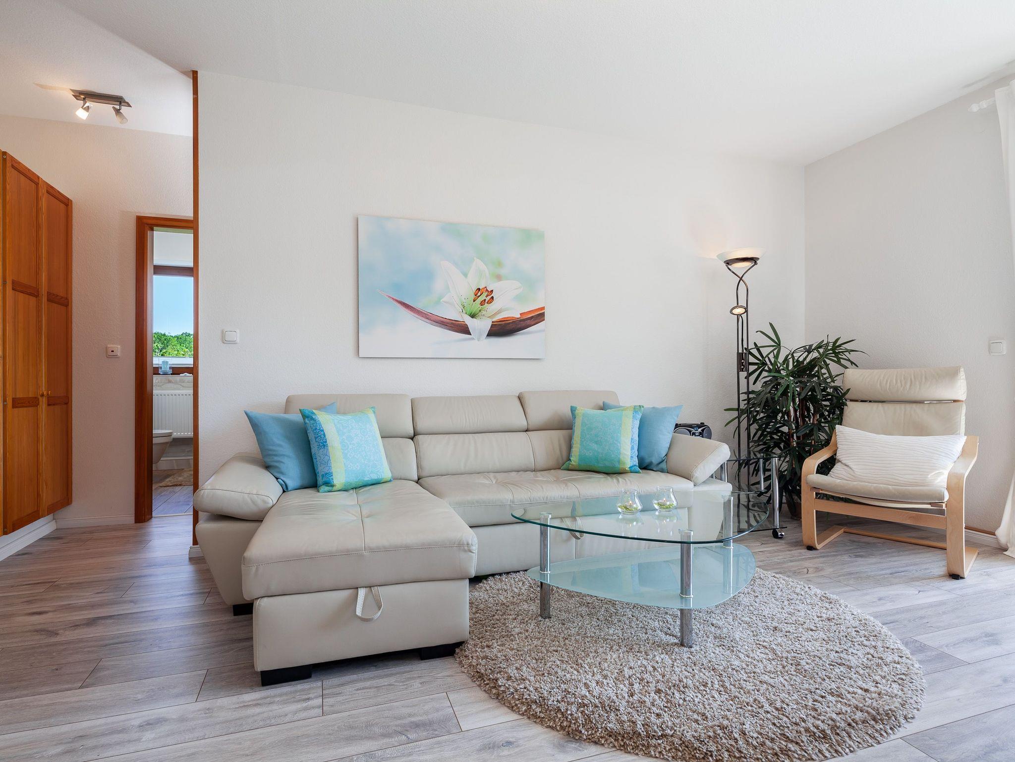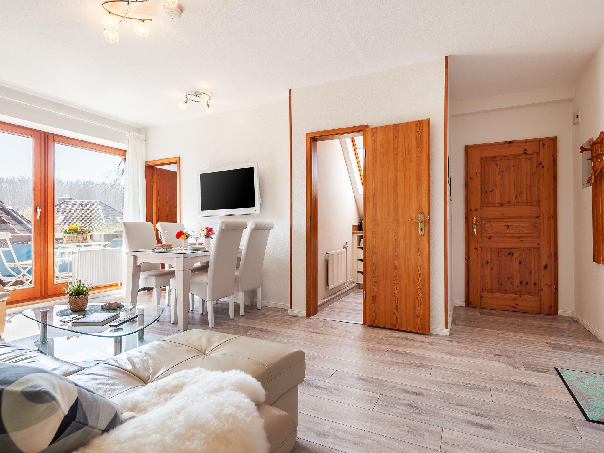 Die 50qm große Wohnung hat 3 Zimmer: ein Wohnzimmer mit Essplatz und separater komplett eingerichteter Küche, ein Schlafzimmer mit Doppelbett und ein Kinderzimmer mit 2 Einzelbetten, sowie ein komfortables Duschbad. Die Einzelbetten des Kinderzimmers sind grosszügig bemessen (90x200 cm), so dass in der Wohnung 4 reguläre Schlafplätze vorhanden sind. Auf Wunsch werden auch Kleinkinderbetten und Hochstuhl gestellt. Der Balkon mit Sitzgelegenheiten lädt zum Verweilen an frischer Luft ein. Die Einrichtung der Wohnung ist neu und komplett ausgestattet.