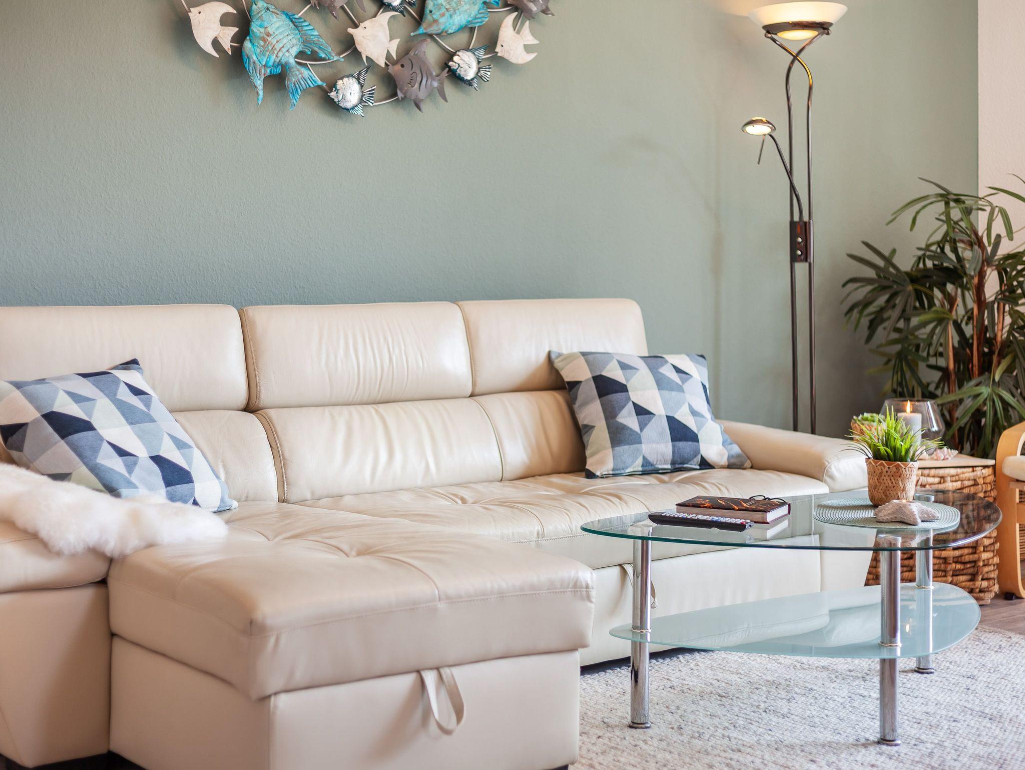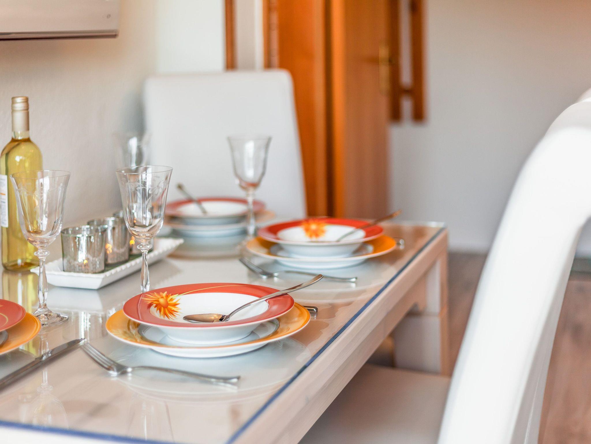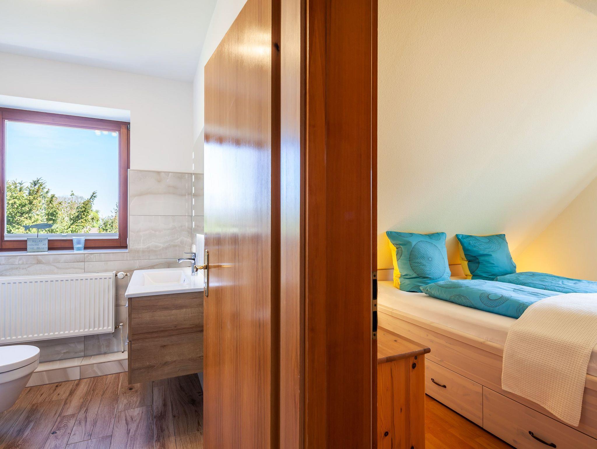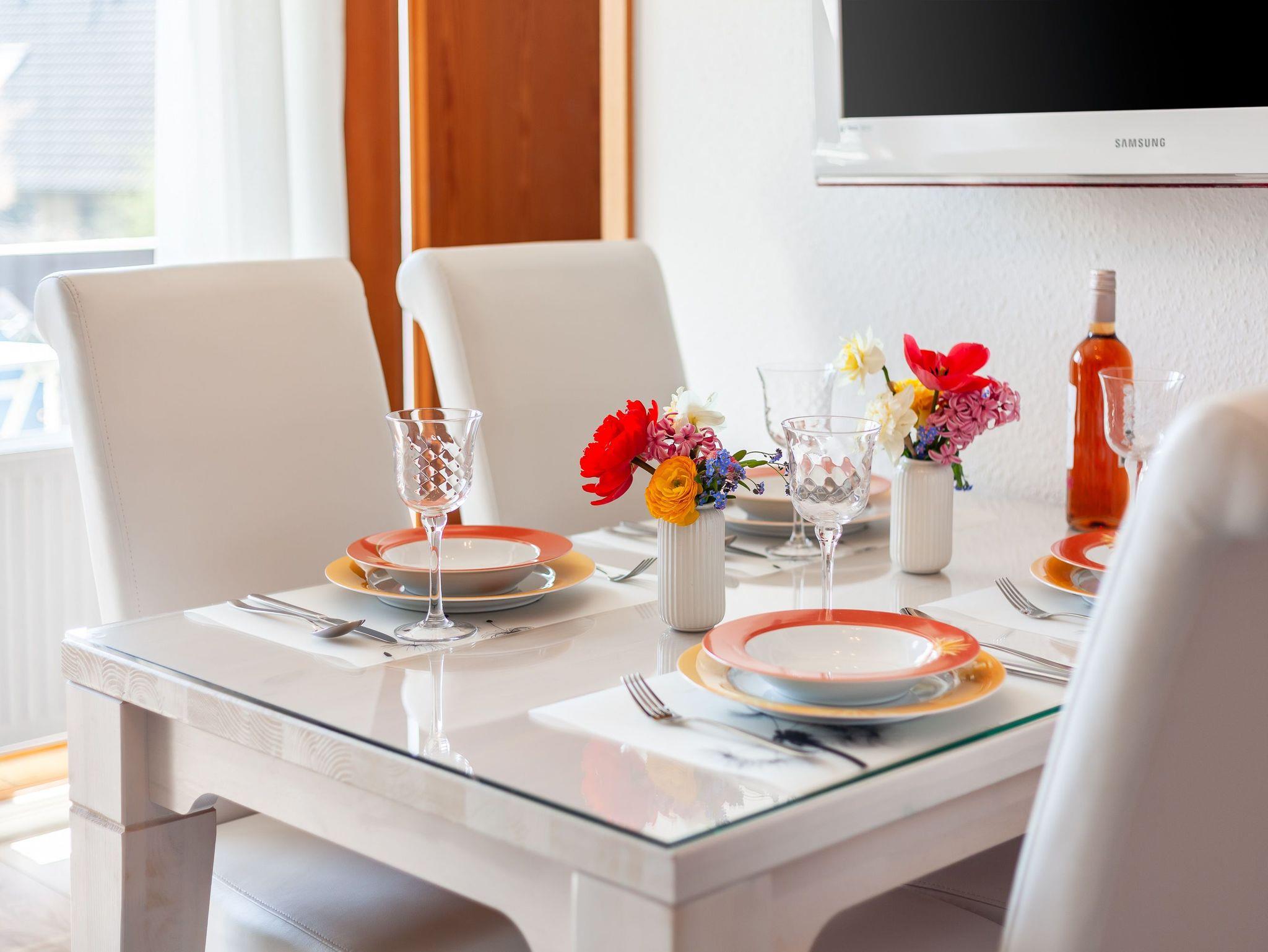 Die 50qm große Wohnung hat 3 Zimmer: ein Wohnzimmer mit Essplatz und separater komplett eingerichteter Küche, ein Schlafzimmer mit Doppelbett und ein Kinderzimmer mit 2 Einzelbetten, sowie ein komfortables Duschbad. Die Einzelbetten des Kinderzimmers sind grosszügig bemessen (90x200 cm), so dass in der Wohnung 4 reguläre Schlafplätze vorhanden sind. Auf Wunsch werden auch Kleinkinderbetten und Hochstuhl gestellt. Der Balkon mit Sitzgelegenheiten lädt zum Verweilen an frischer Luft ein. Die Einrichtung der Wohnung ist neu und komplett ausgestattet.